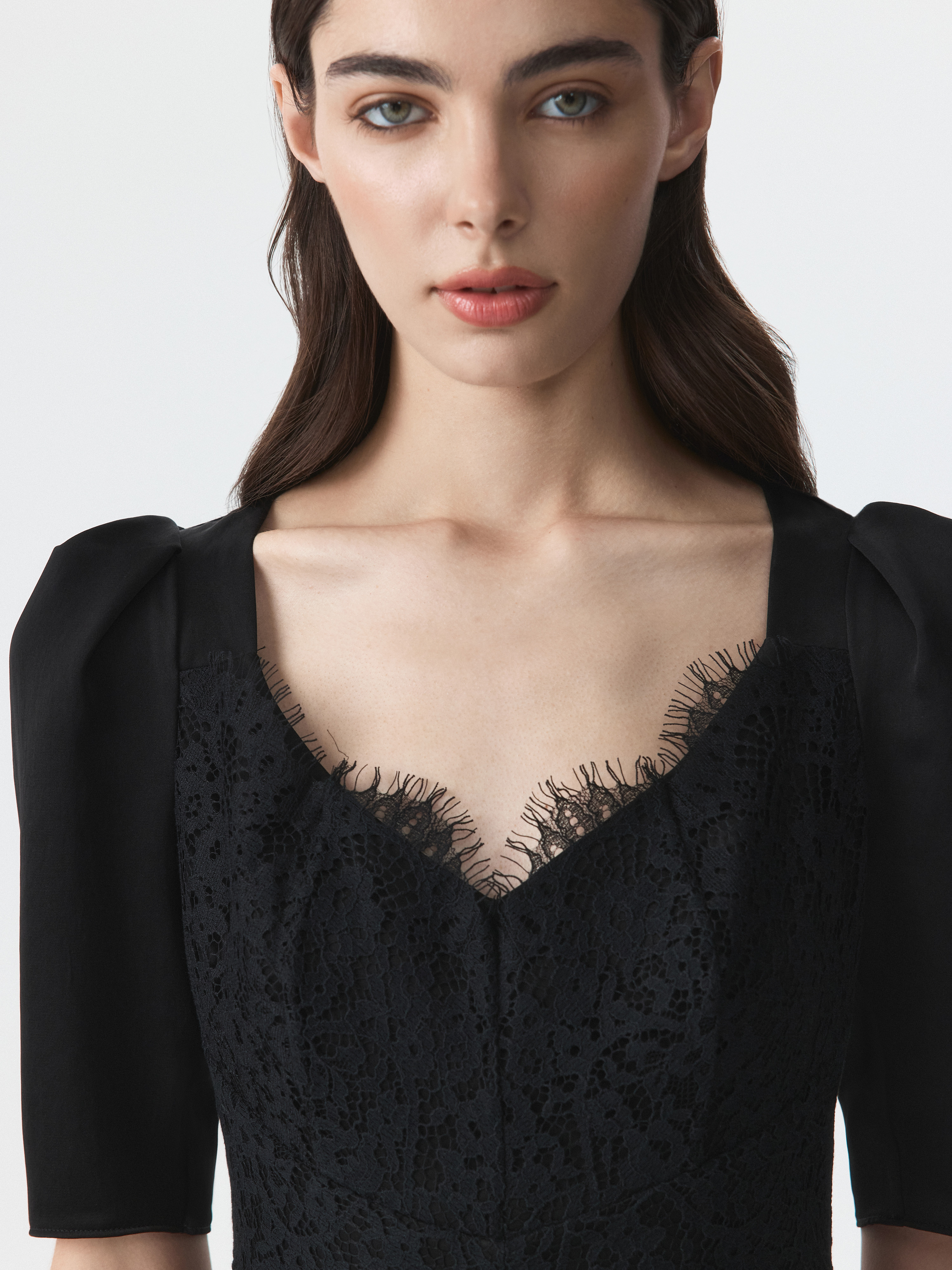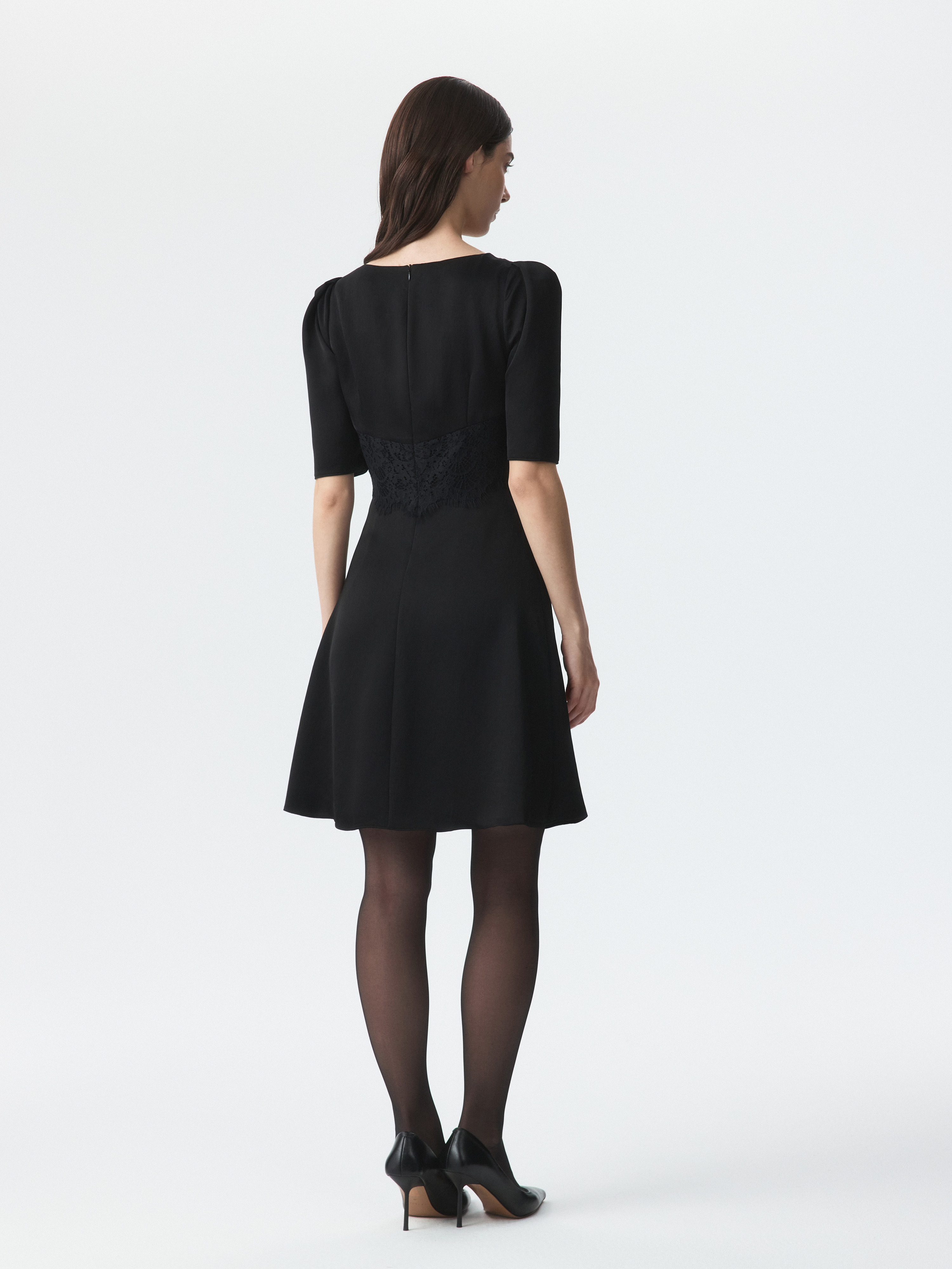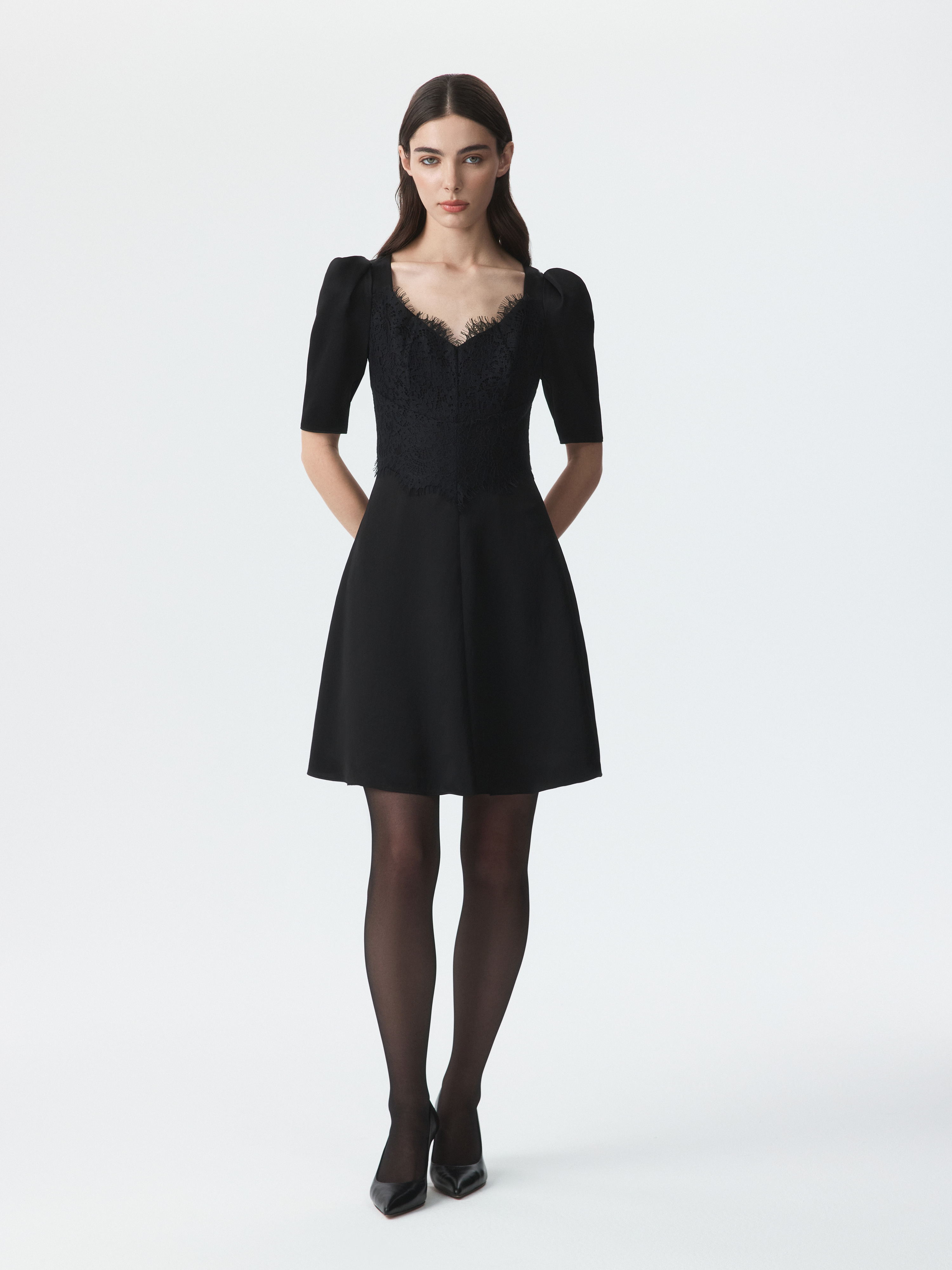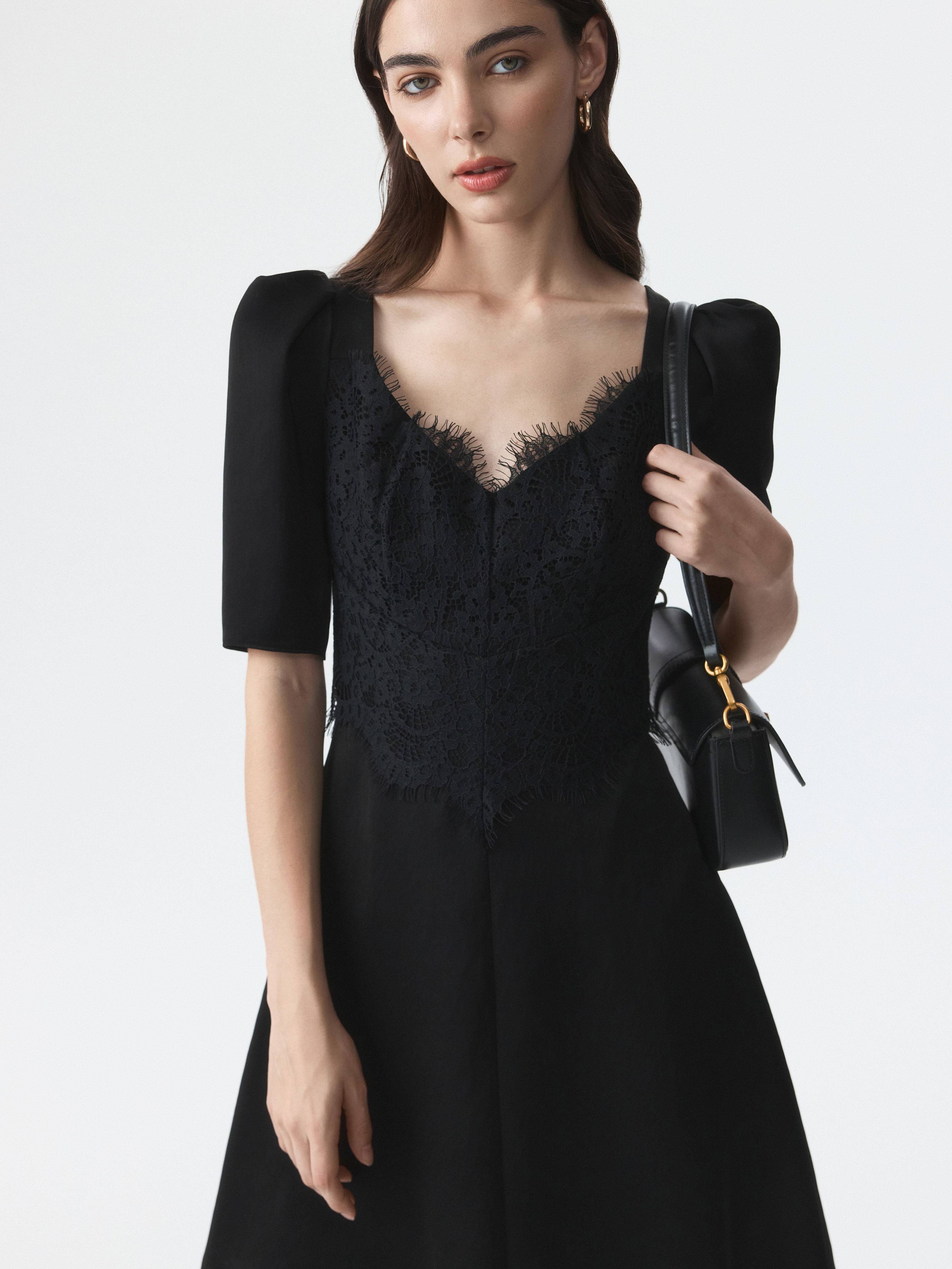 Расклешенное платье-мини из атласной ткани станет основой выразительного и романтичного образа. Гладкий шелковистый текстиль с приятной на ощупь фактурой струится вдоль тела и комфортно прилегает благодаря подкладке. Кружевной декор создает эффект корсета.