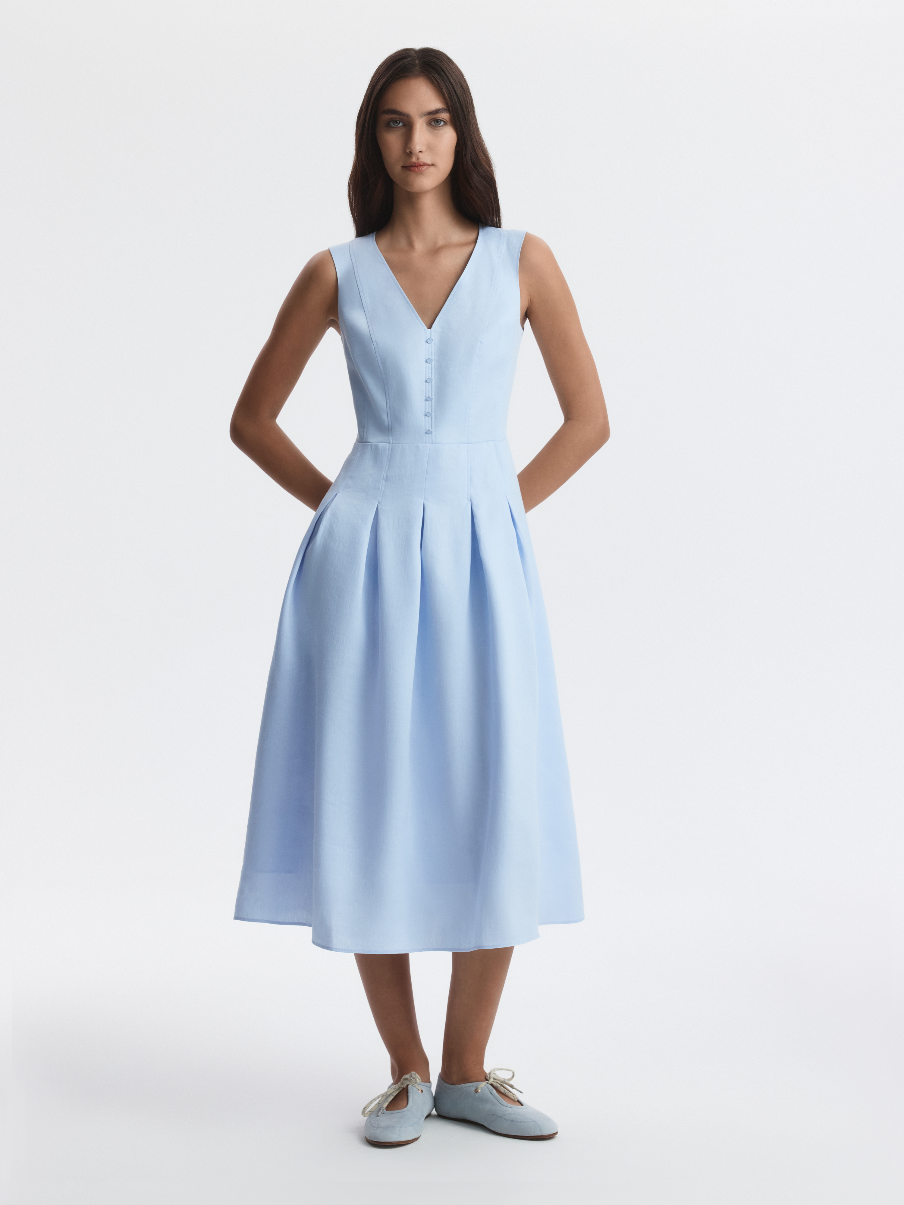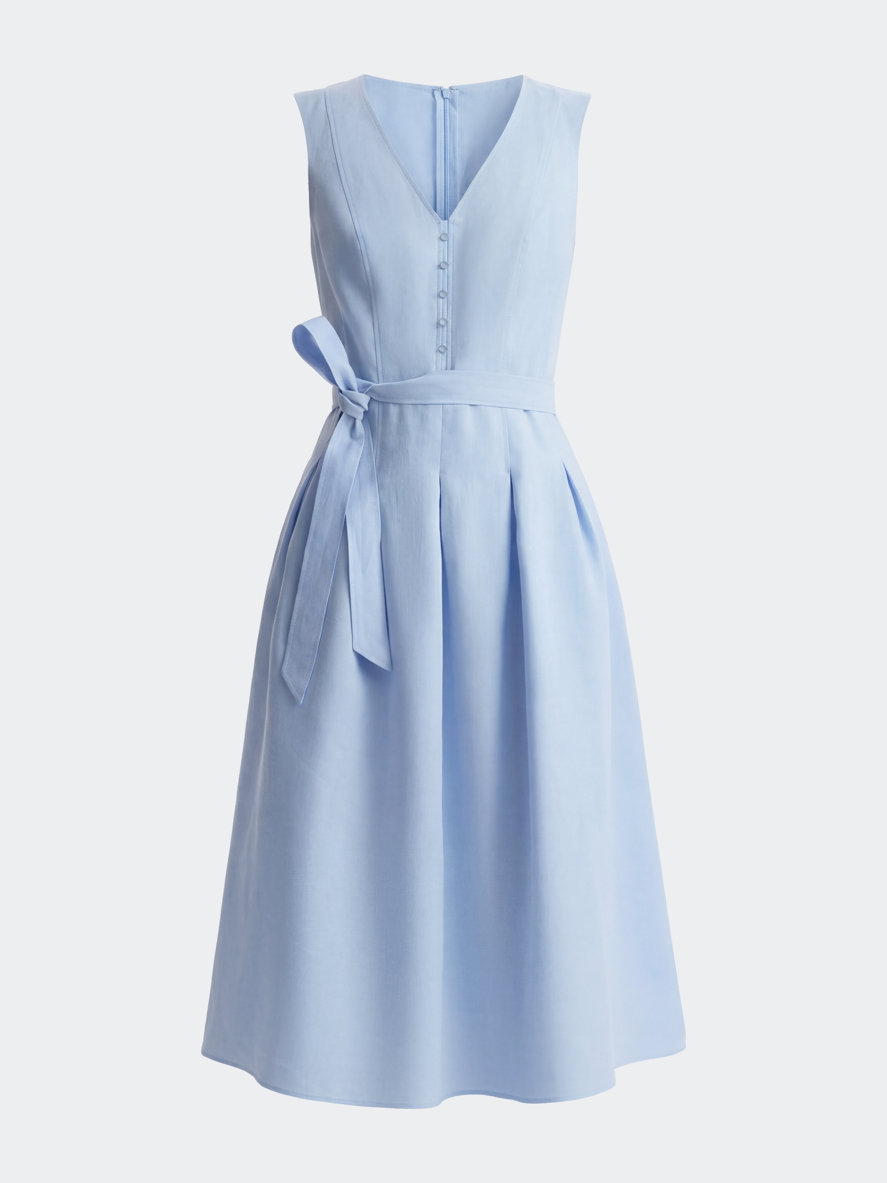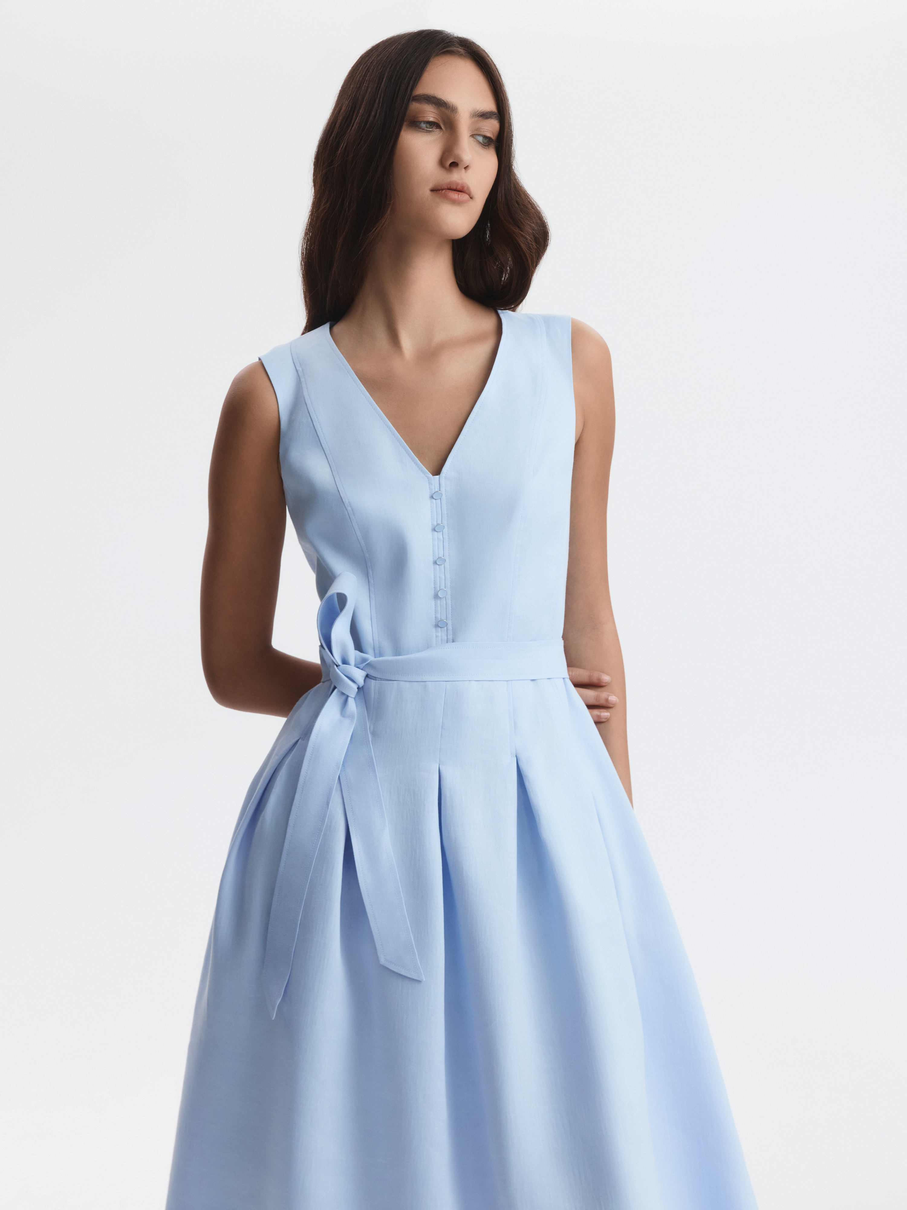 Приталенное платье-миди с V-вырезом создает изысканный силуэт и подчеркивает женственность. В меру плотный текстиль на основе льна хорошо пропускает воздух и сохраняет комфорт, а хлопковая подкладка дарит мягкое прилегание. Лаконичная модель с поясом не требует сложных стилизаций.