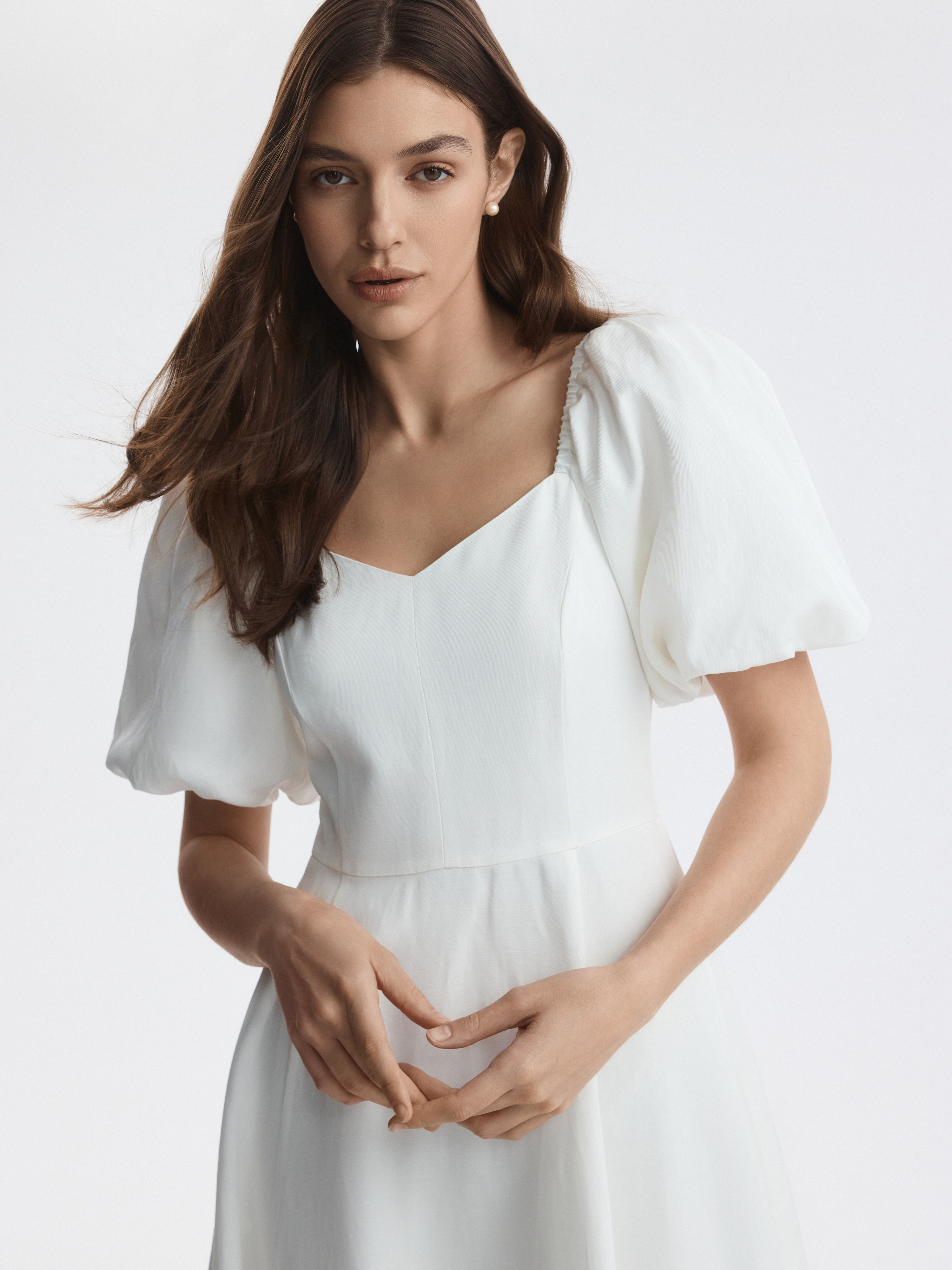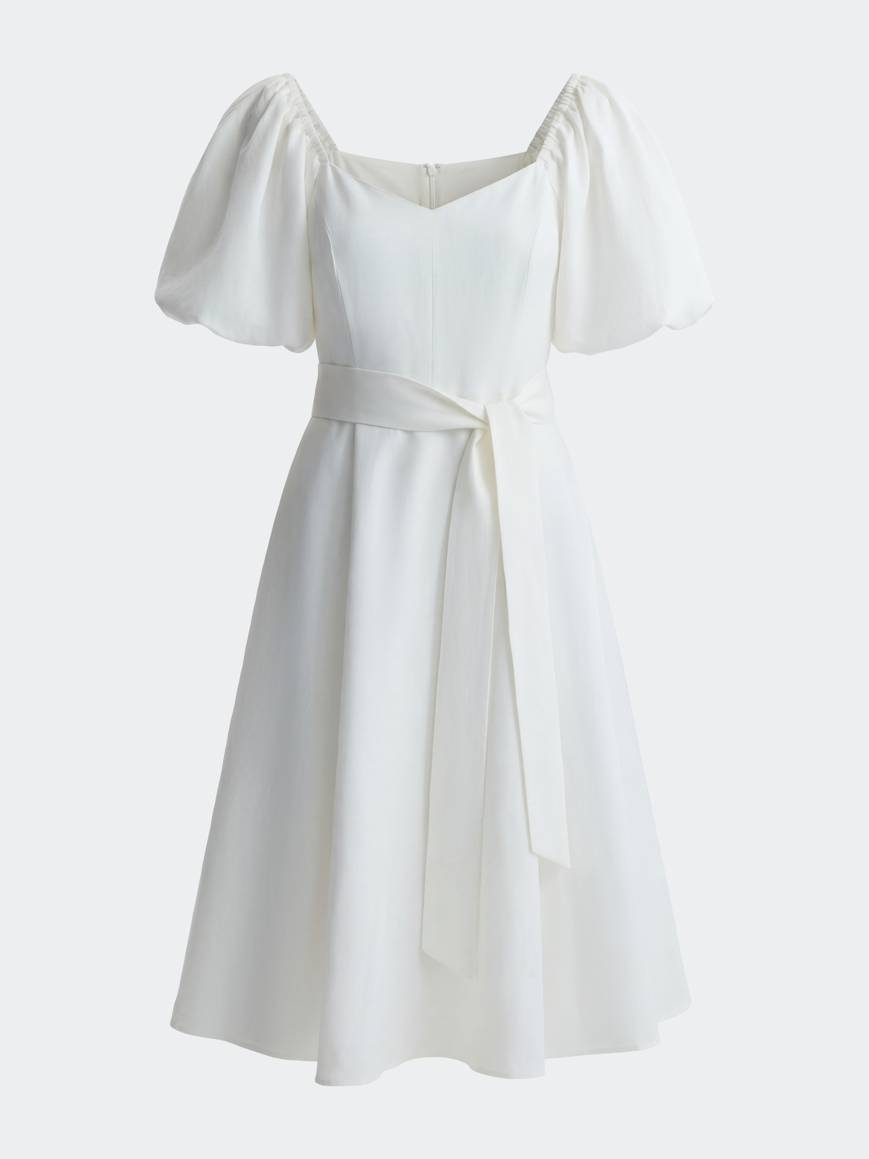 Приталенное платье с пышными деталями создает универсальный образ, который уместен и в повседневной, и в праздничной обстановке. В меру плотный текстиль с содержанием льна не тянется и хорошо держит пышную форму, а тонкая подкладка из вискозы обеспечивает комфорт.