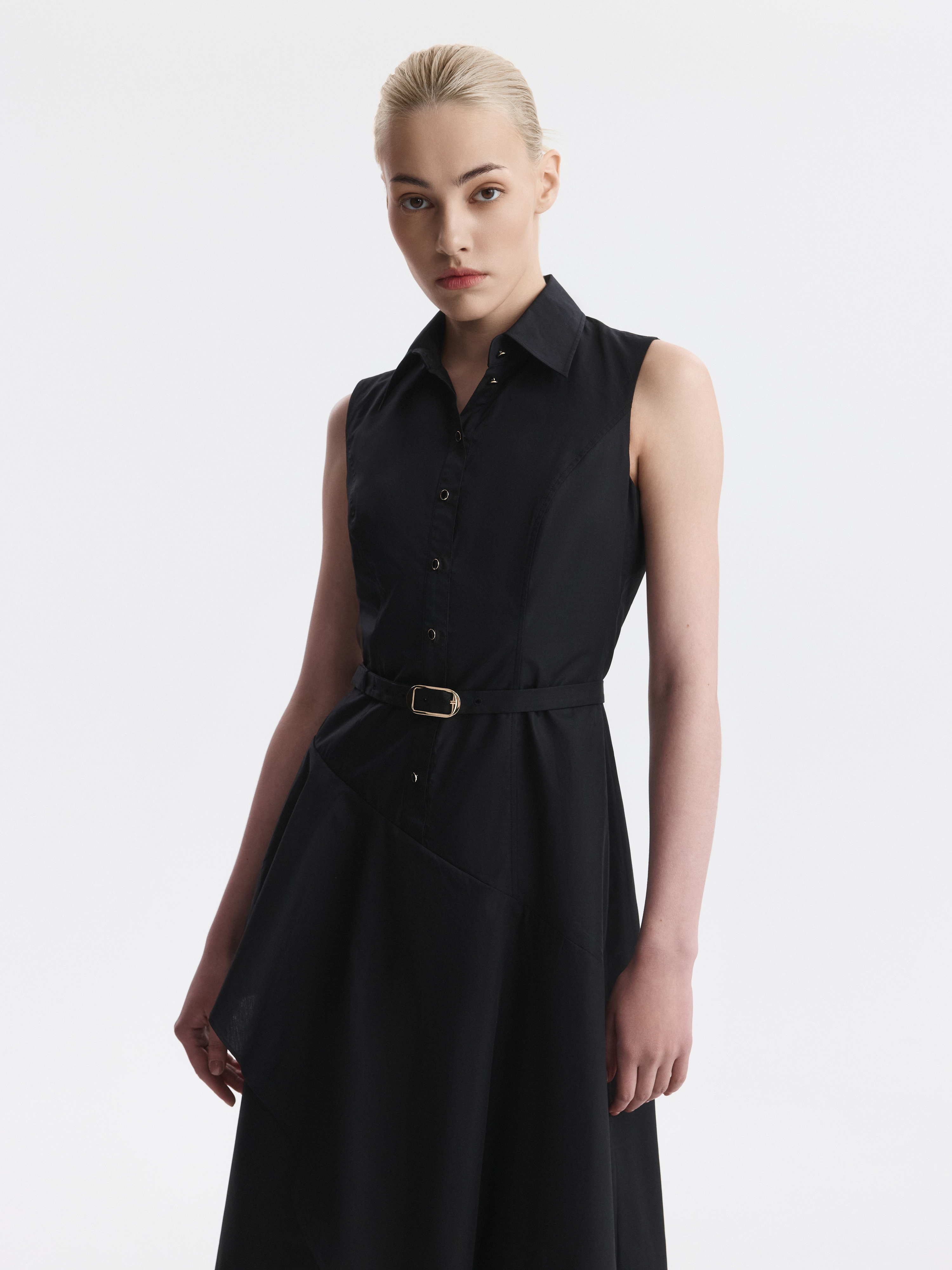 Ассиметричное платье без рукавов подойдет для любого сценария. Тонкий гладкий поплин из натурального хлопка с мягкой подкладкой обеспечивает комфорт на весь день. Приталенную модель можно дополнительно подчеркнуть поясом. Волан на подоле придает образу фактуру и динамику.