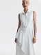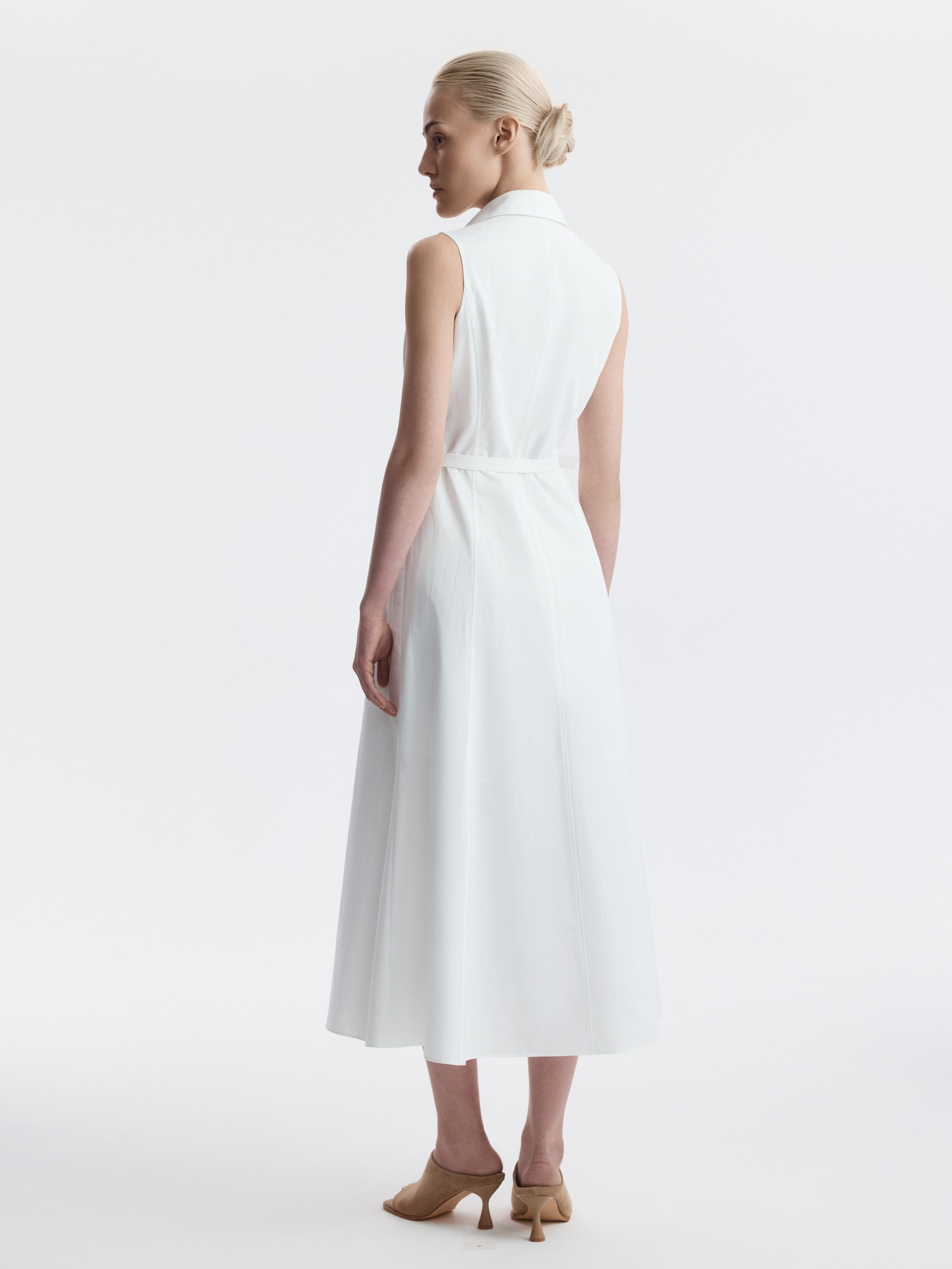 Ассиметричное платье без рукавов подойдет для любого сценария. Тонкий гладкий поплин из натурального хлопка с мягкой подкладкой обеспечивает комфорт на весь день. Приталенную модель можно дополнительно подчеркнуть поясом. Волан на подоле придает образу фактуру и динамику.