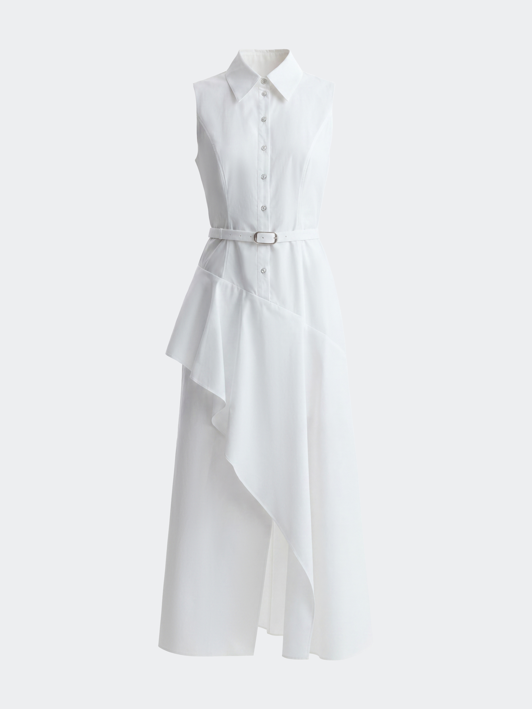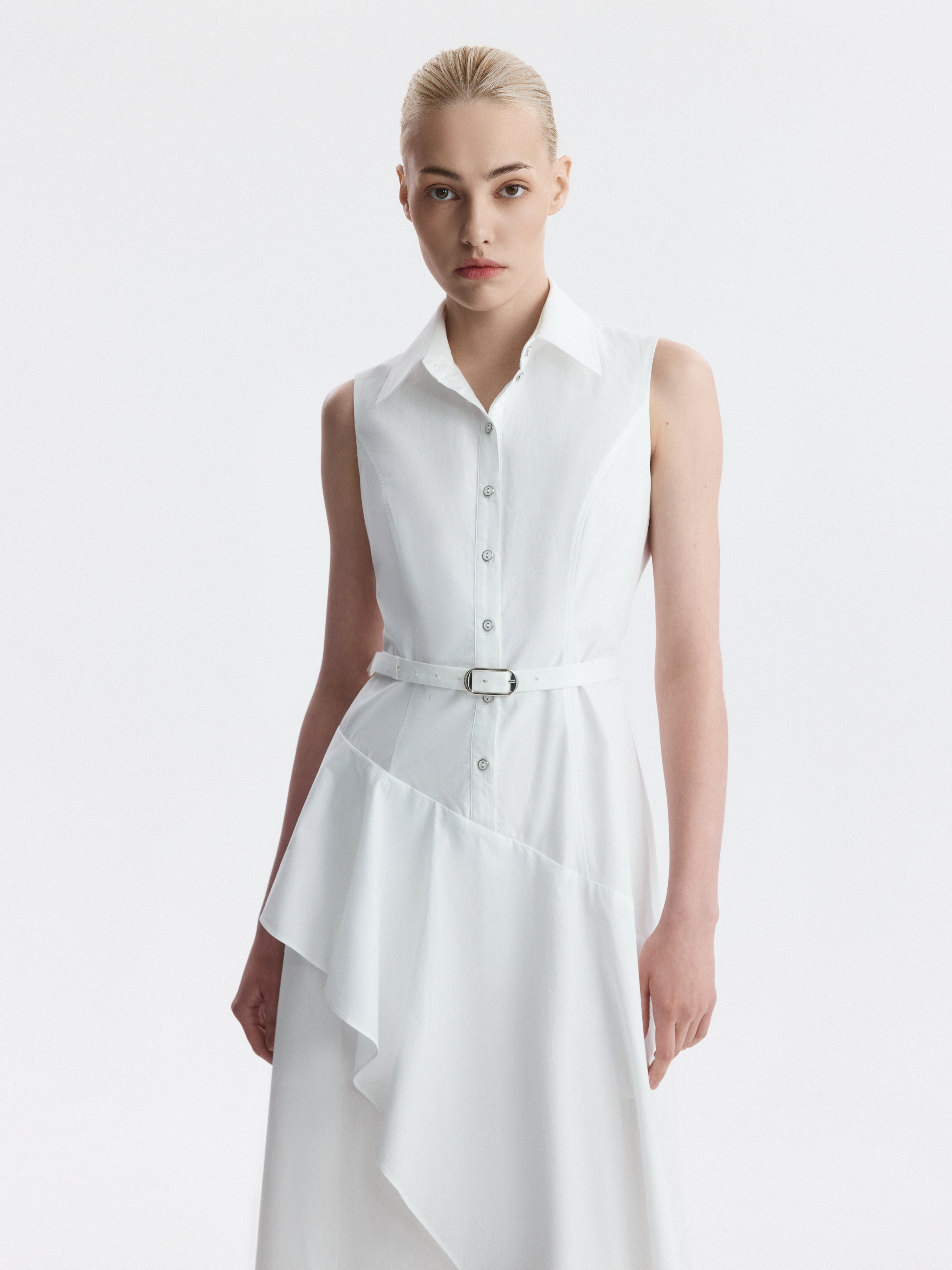 Ассиметричное платье без рукавов подойдет для любого сценария. Тонкий гладкий поплин из натурального хлопка с мягкой подкладкой обеспечивает комфорт на весь день. Приталенную модель можно дополнительно подчеркнуть поясом. Волан на подоле придает образу фактуру и динамику.