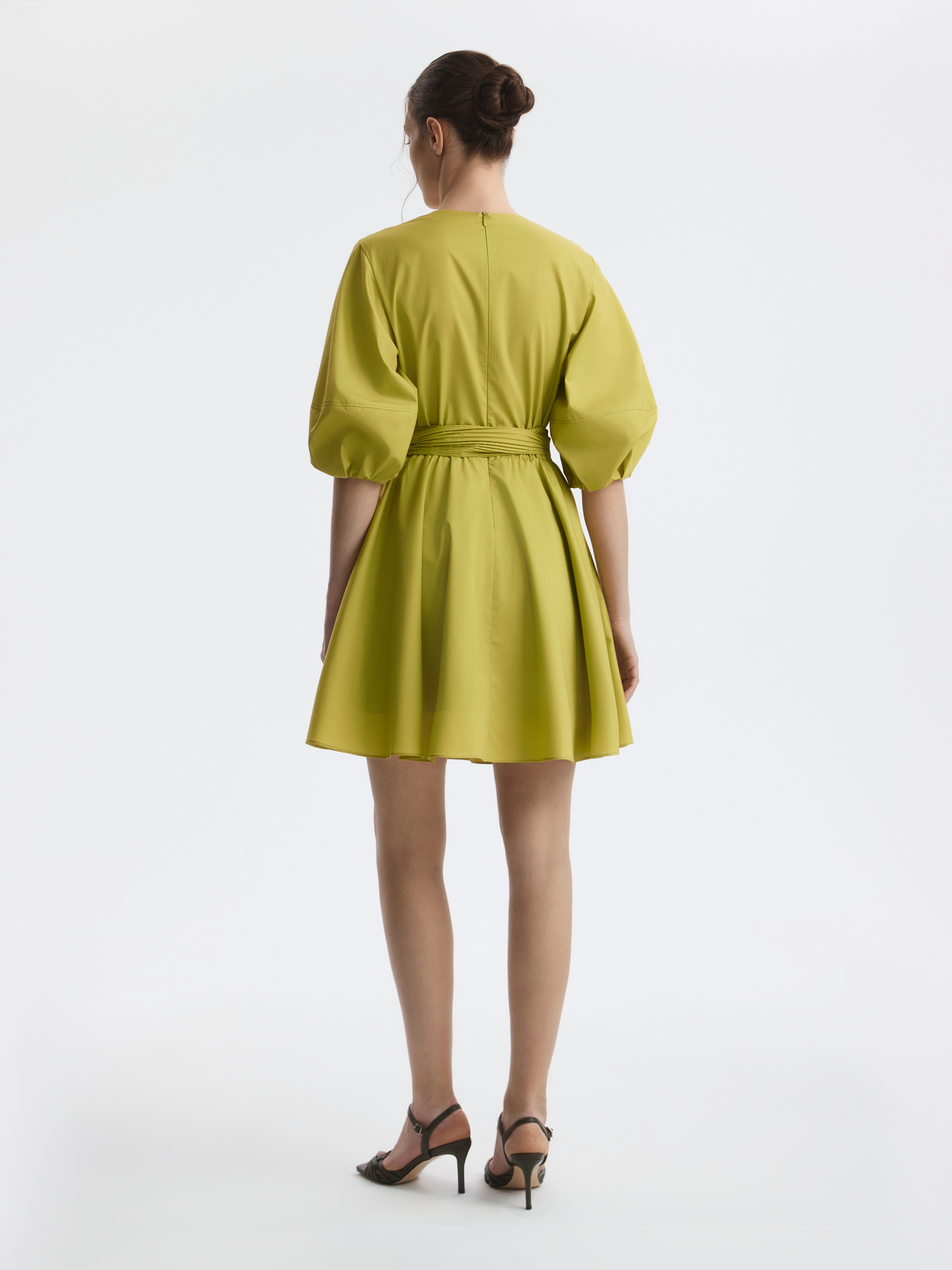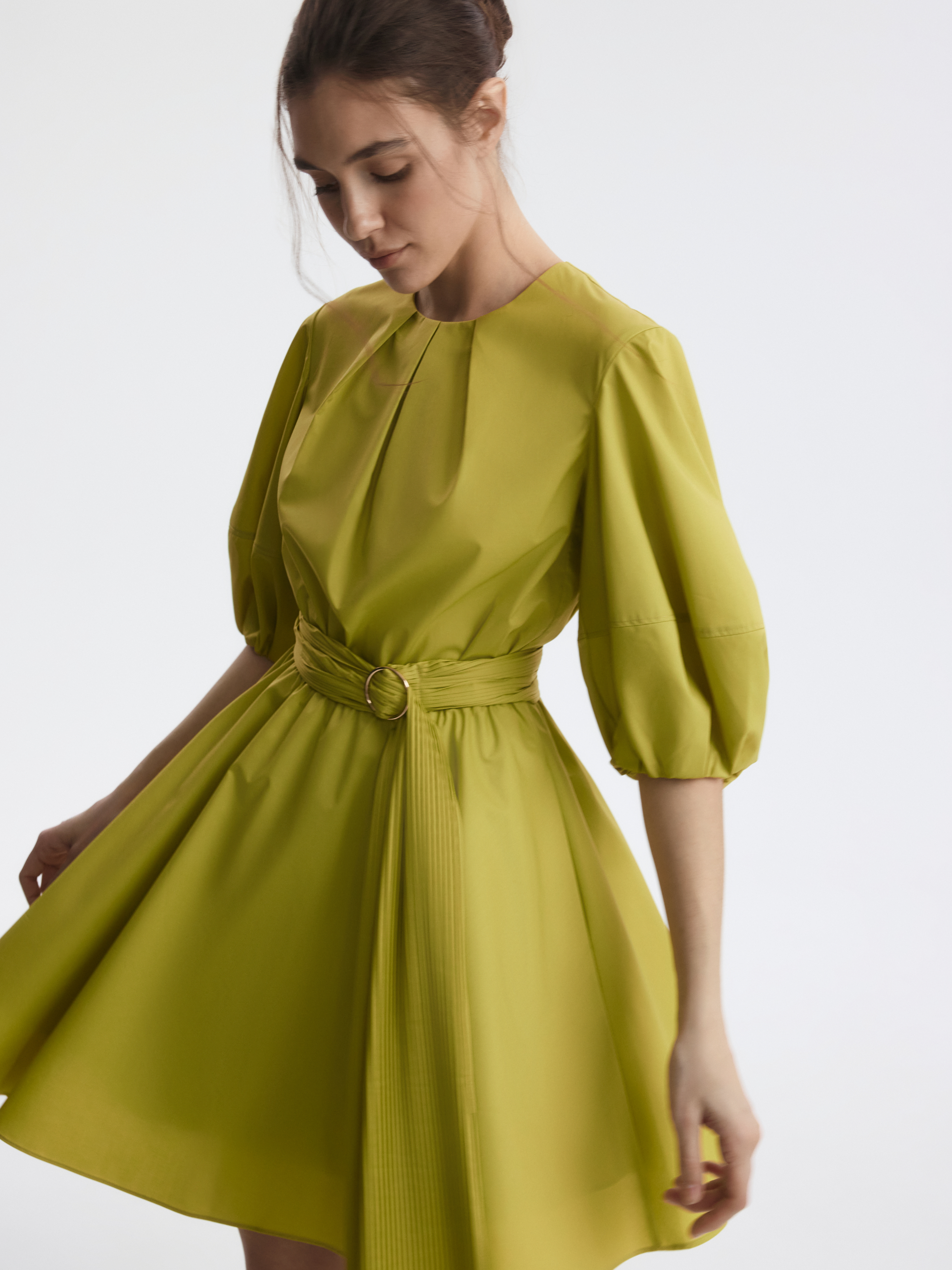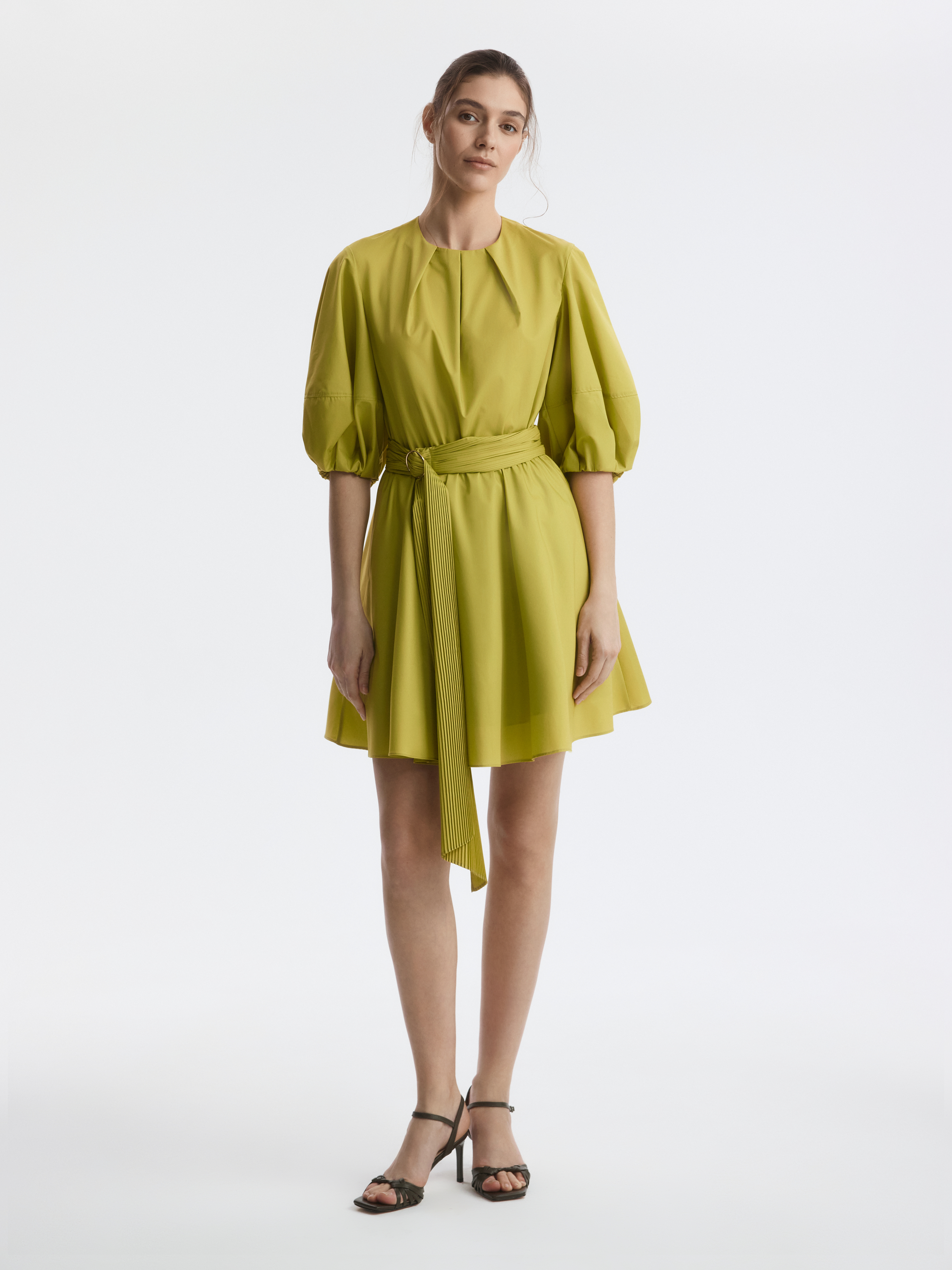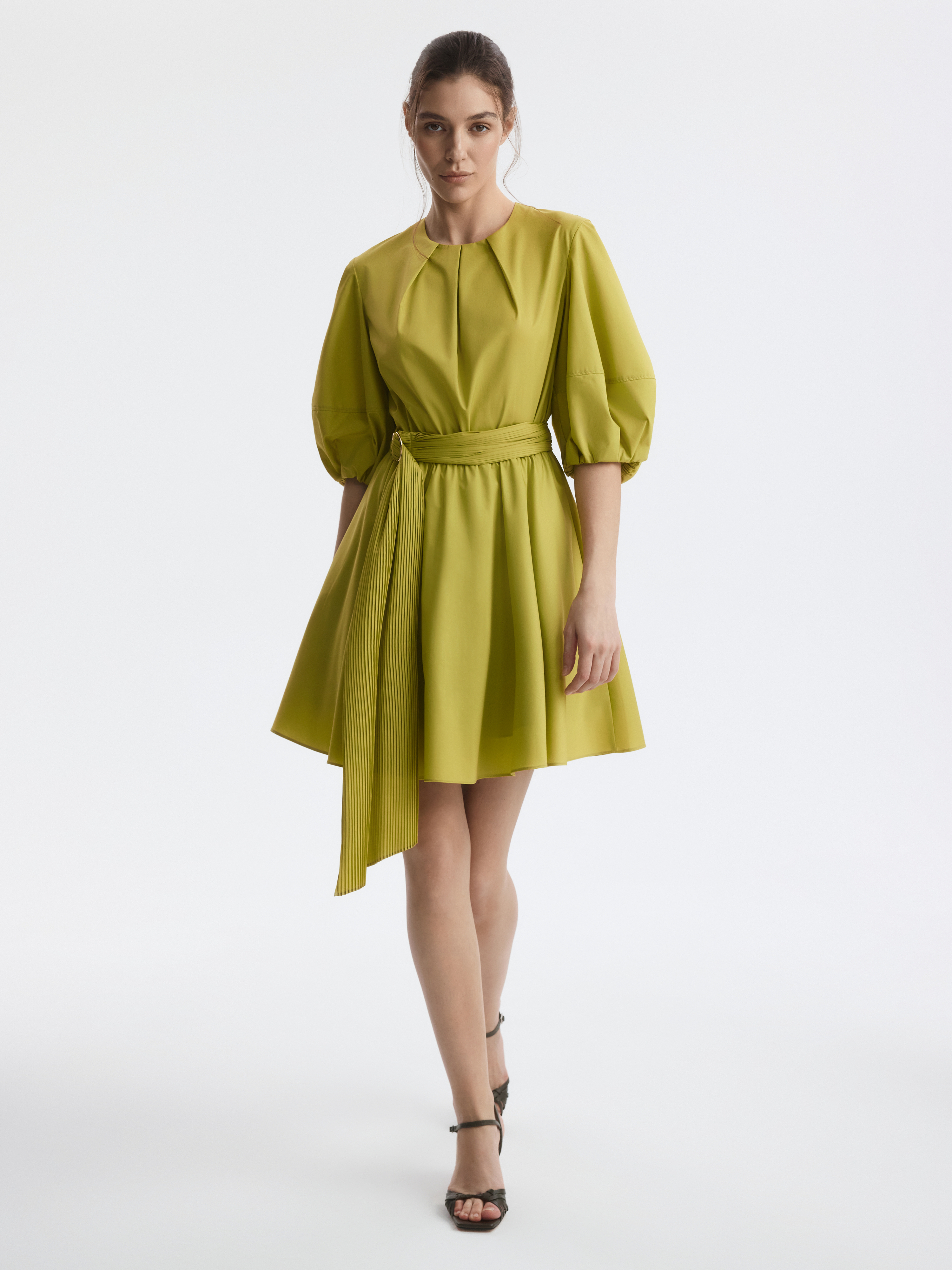 Расклешенное платье-мини с пышными рукавами выглядит женственно и всегда будет кстати в летнем гардеробе. Легкий текстиль на основе хлопка хорошо пропускает воздух и дарит комфорт, а искусственные волокна придают прочность и износоустойчивость. Модель с отрезной талией можно дополнительно подчеркнуть поясом из комплекта.