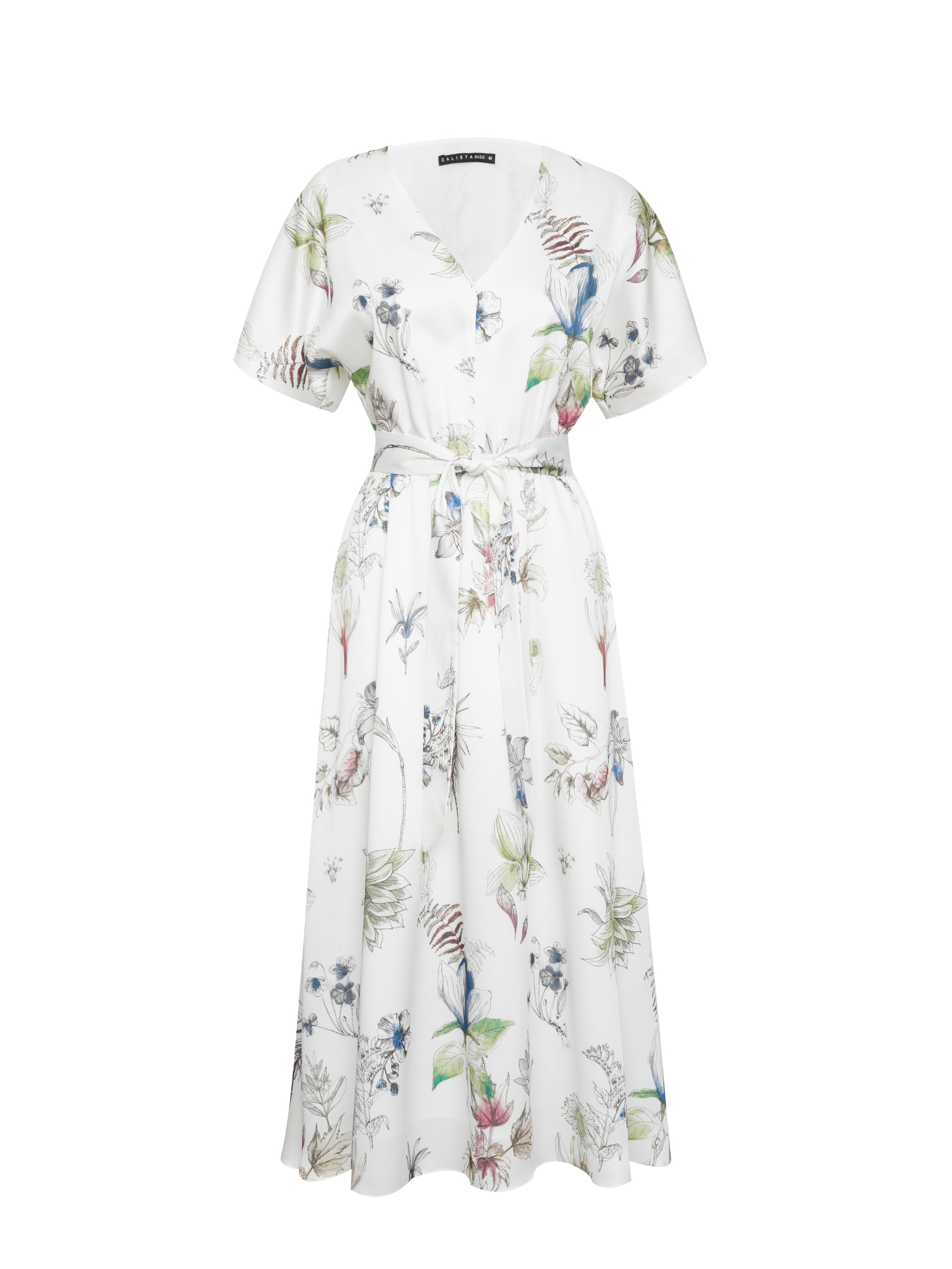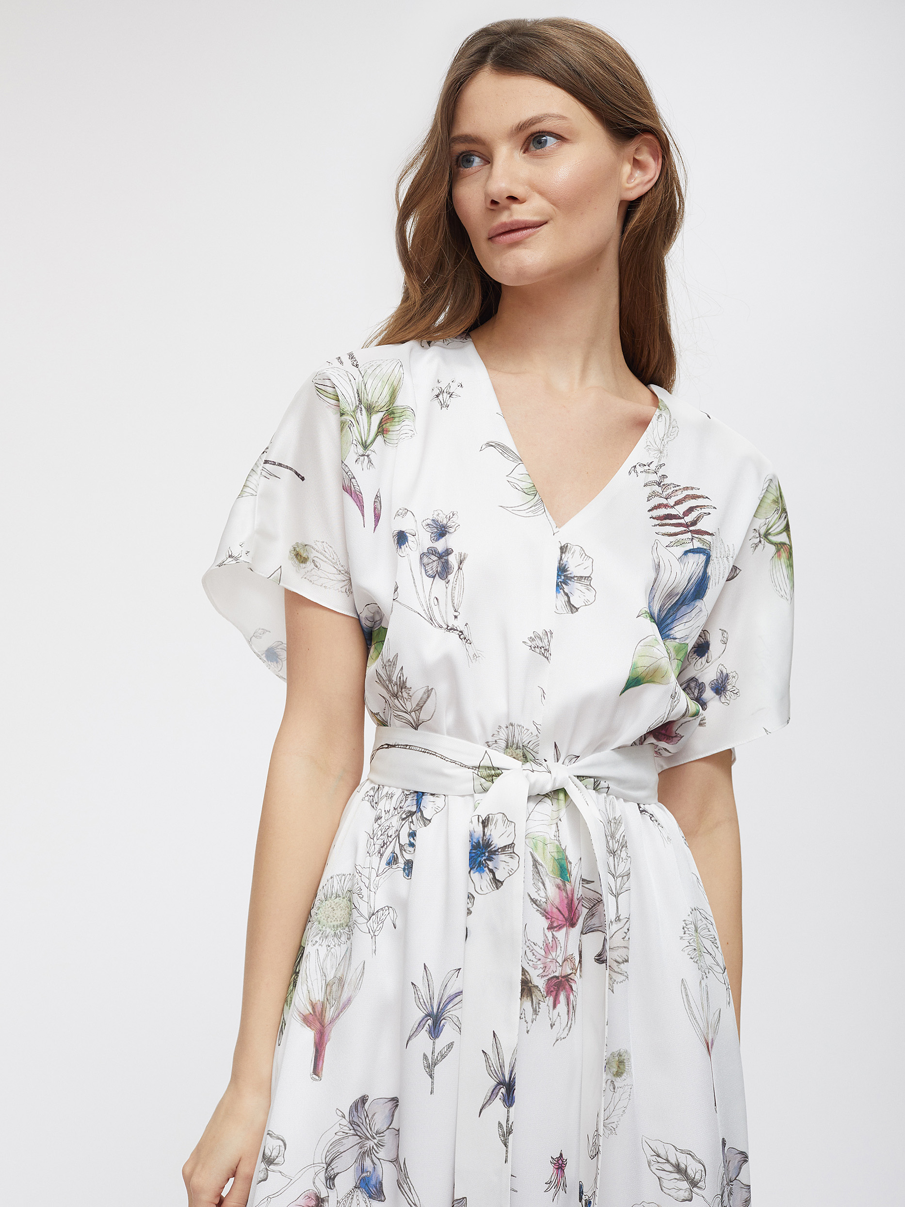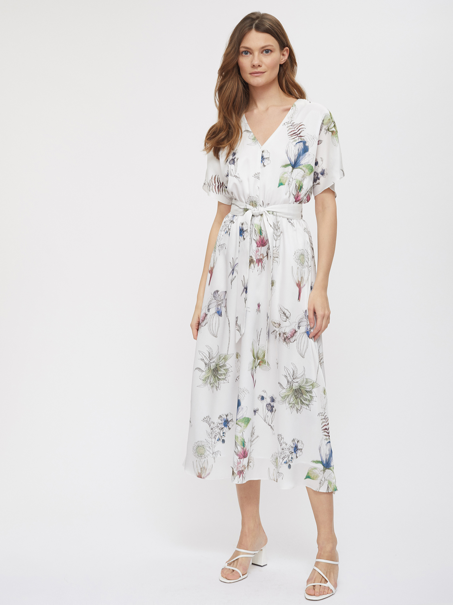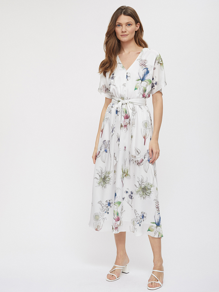 Платье длины миди с принтом. Свободный крой, V-образный вырез, рукава-воланы, подкладка. В комплекте пояс.