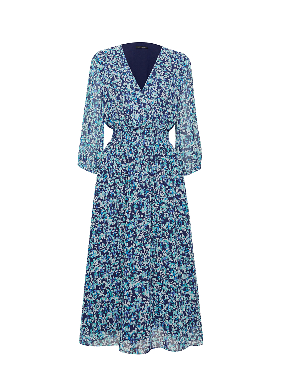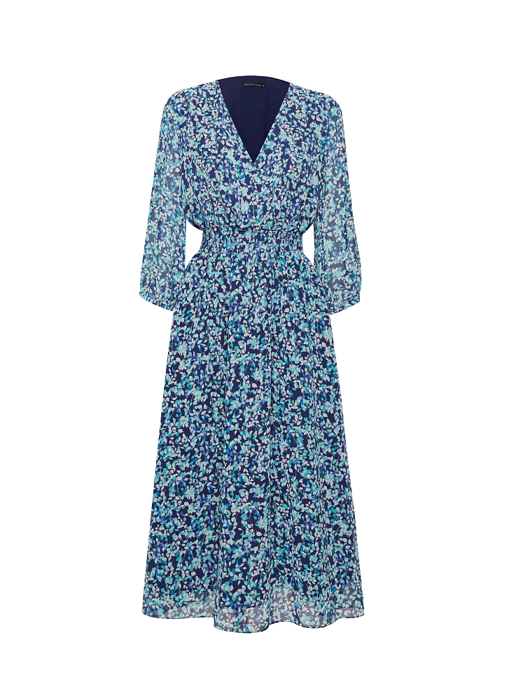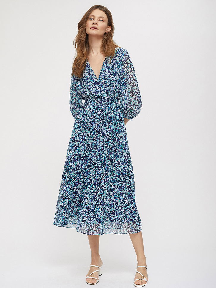 Платье из струящейся ткани длины миди. Приталенный крой, эластичный пояс, V-образный вырез с запахом, объемные рукава длины ¾, подкладка.