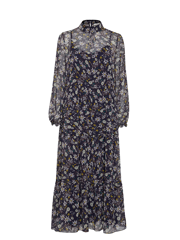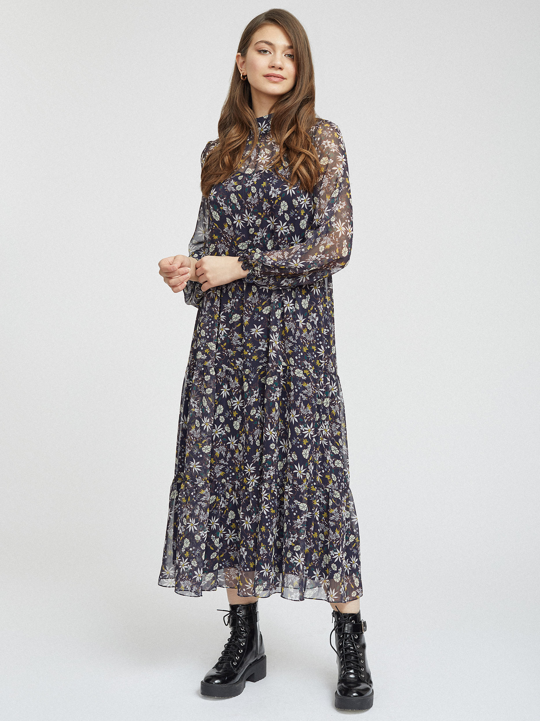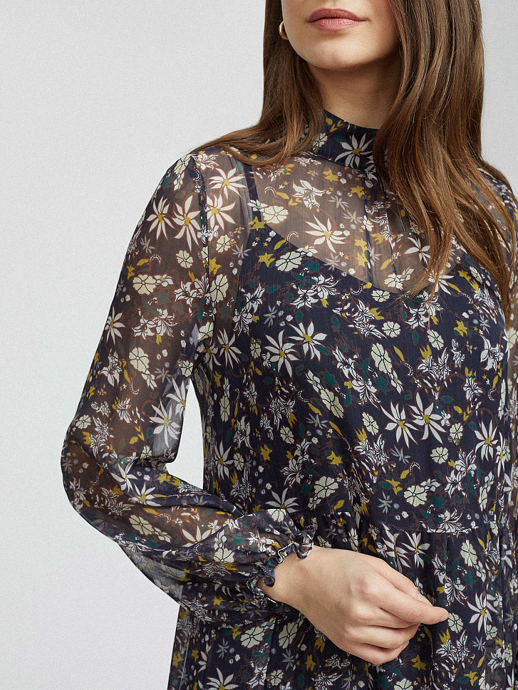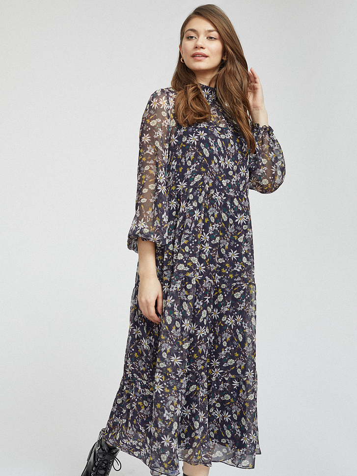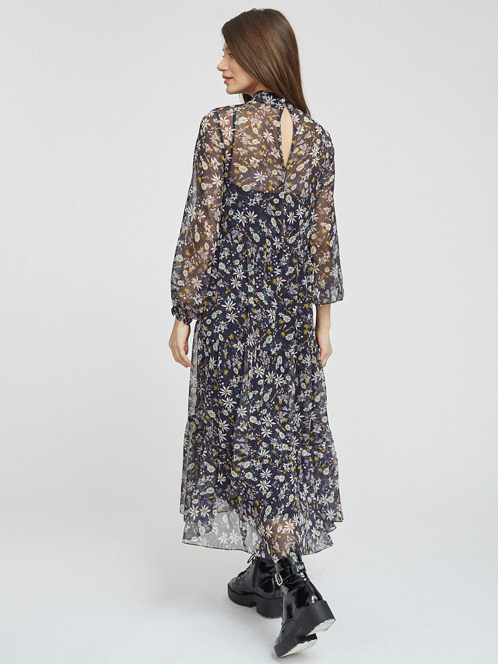 Длинное платье с цветочным принтом, выполненное из легкого шифона. Воротник-стойка, длинные объемные рукава с эластичными манжетами, широкие воланы по нижнему краю, подкладочное платье-комбинация, зафиксированное петлями. Застегивается на пуговицы сзади.