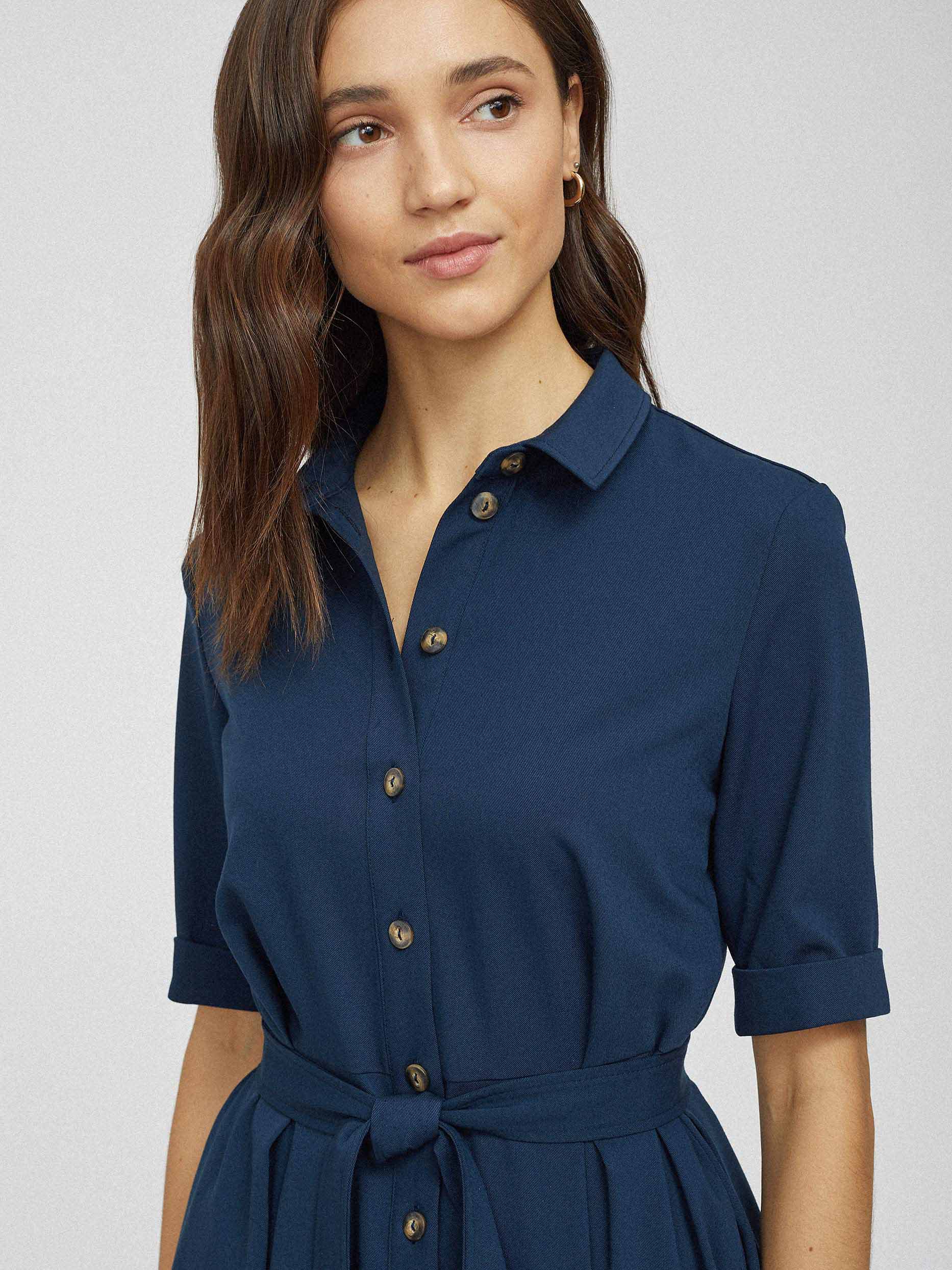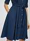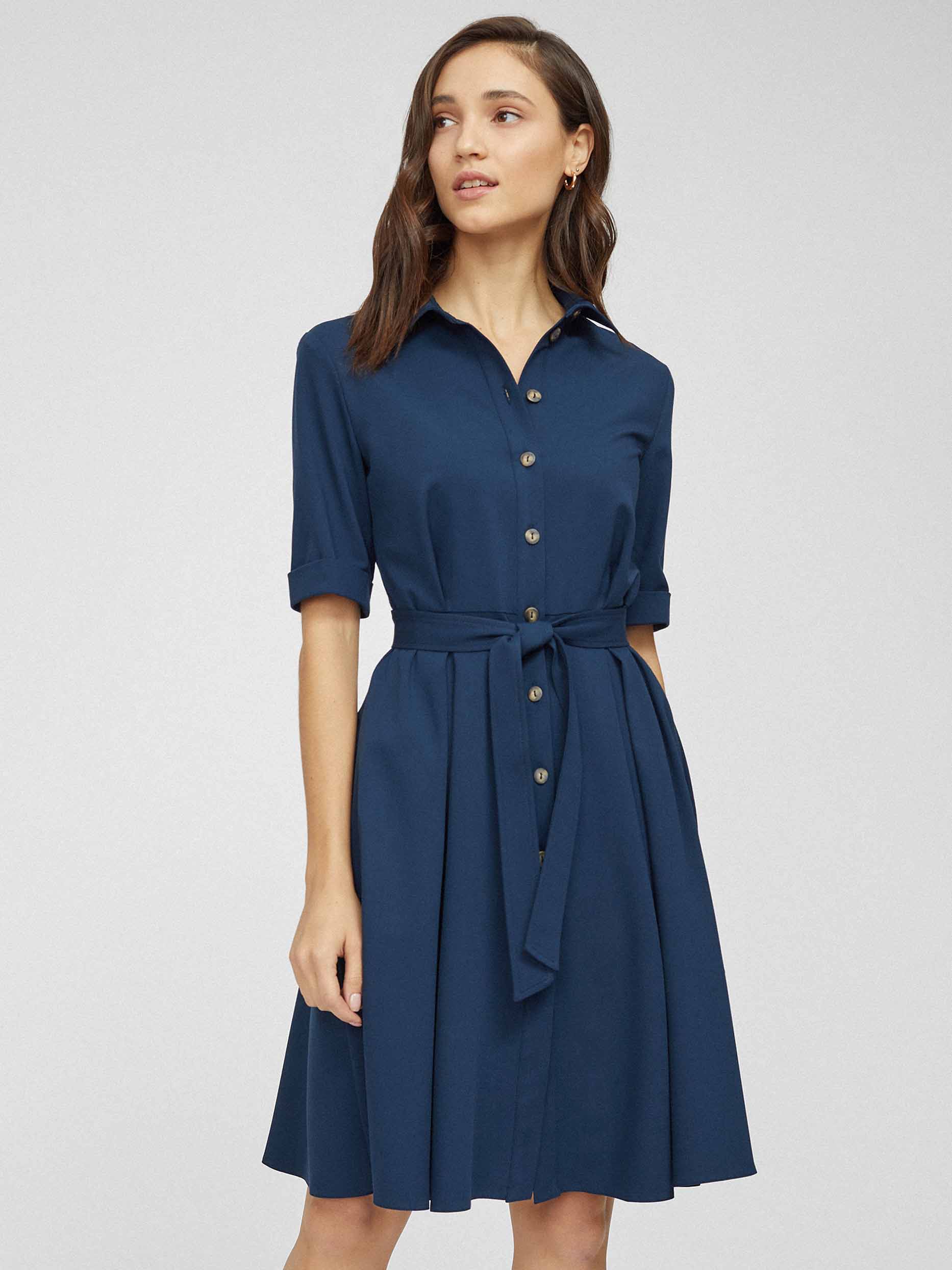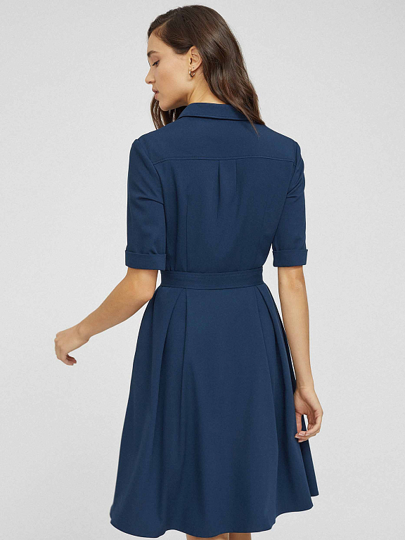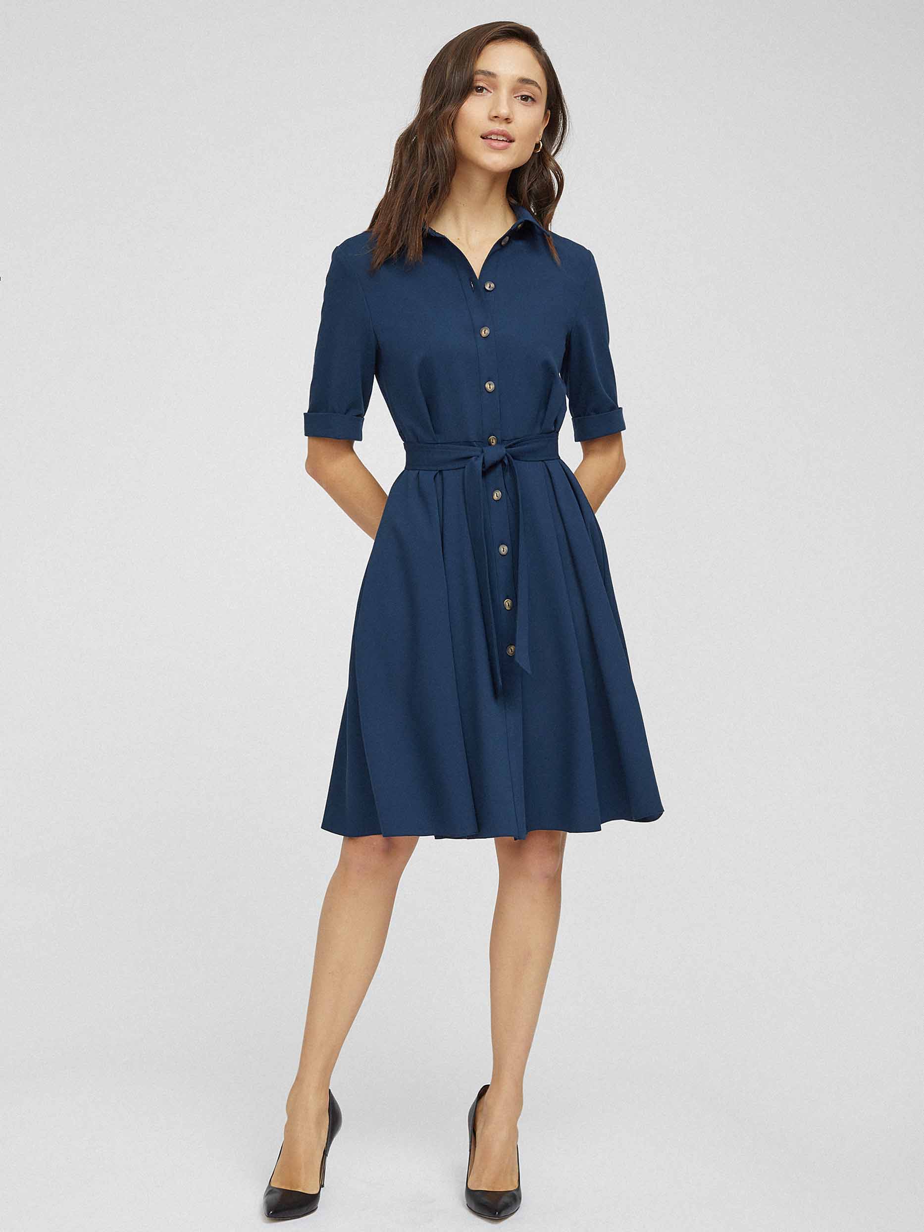 Однотонное короткое платье. Приталенный крой, защипы, короткие рукава с отворотами, классический отложной воротник. Застегивается на ряд пуговиц. В комплекте пояс из основной ткани.