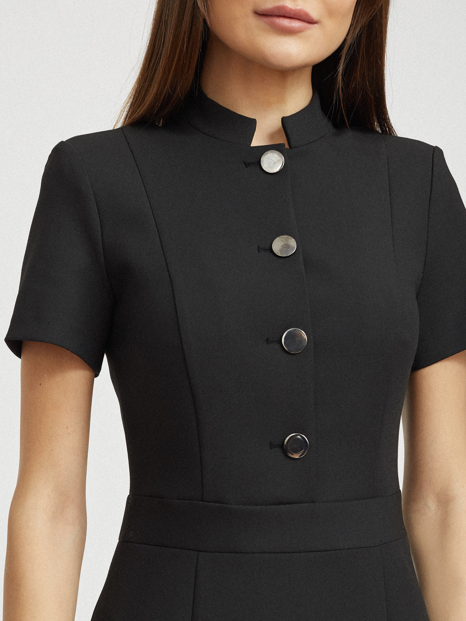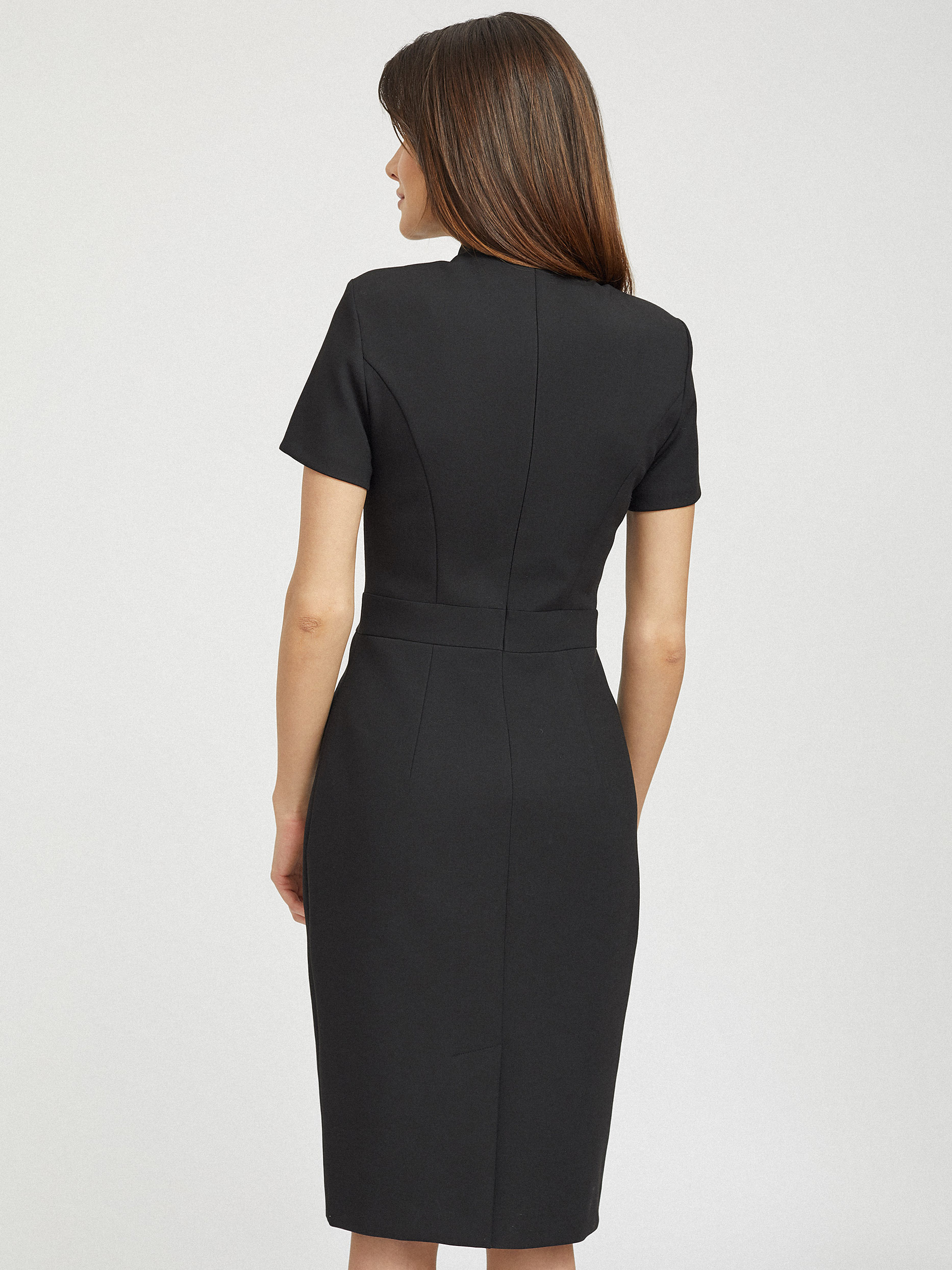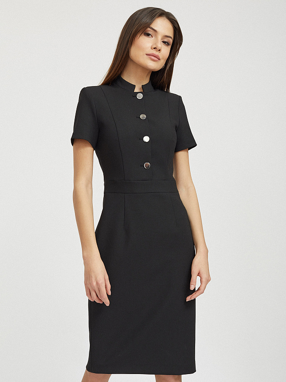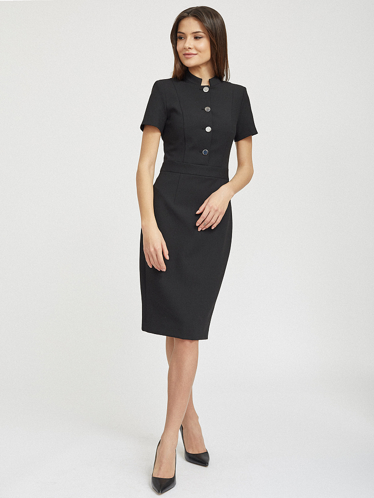 Однотонное платье приталенного кроя. Фигурный вырез, короткие рукава, подплечники, шлица, подкладка. Застегивается на потайную молнию и ряд пуговиц.