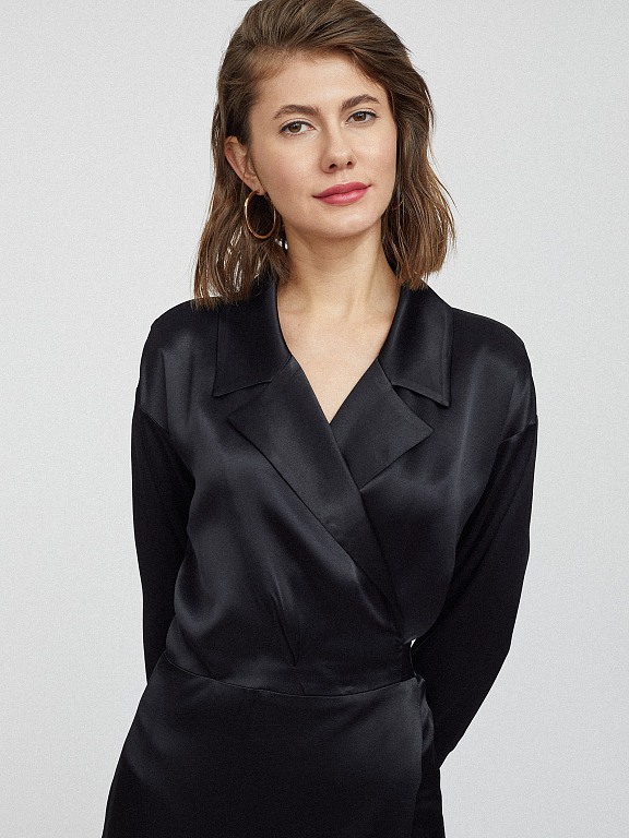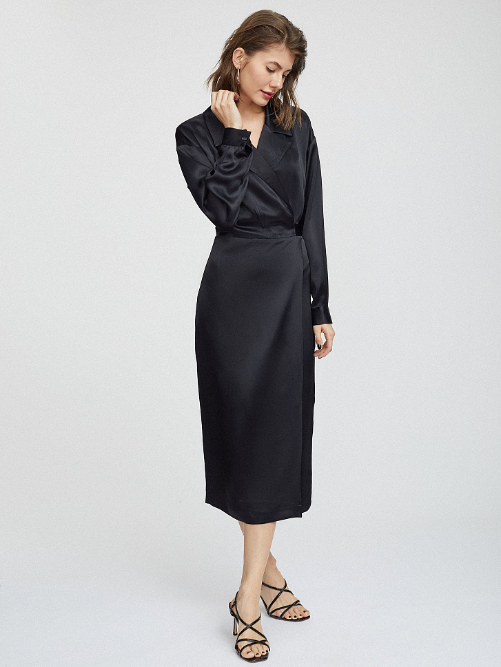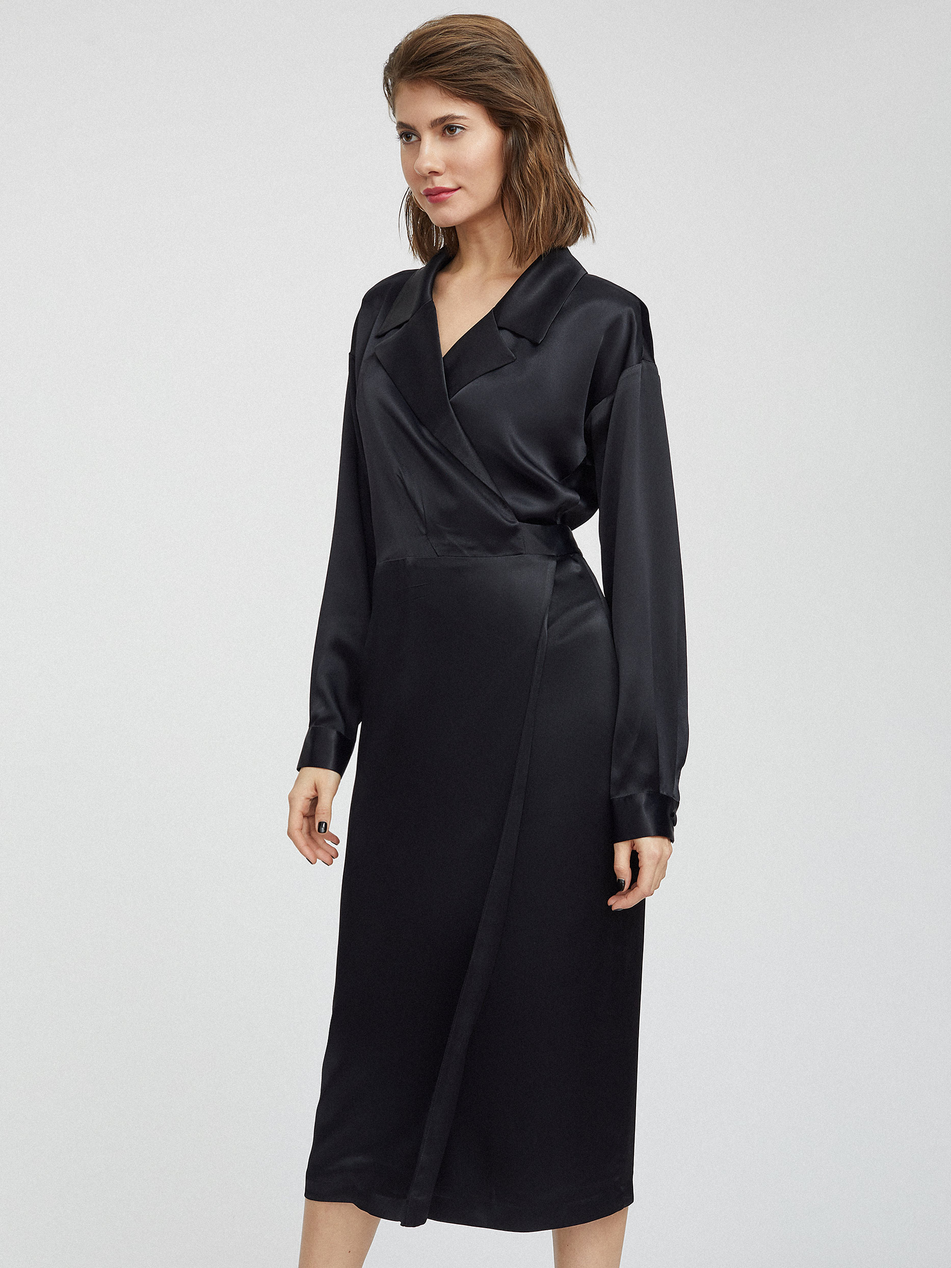 Однотонное атласное платье на запах. Отложной воротник с лацканами, спущенная линия плеч, длинные объемные рукава с широкими манжетами на пуговицах, завязывающиеся ленты на талии, подкладка.