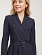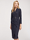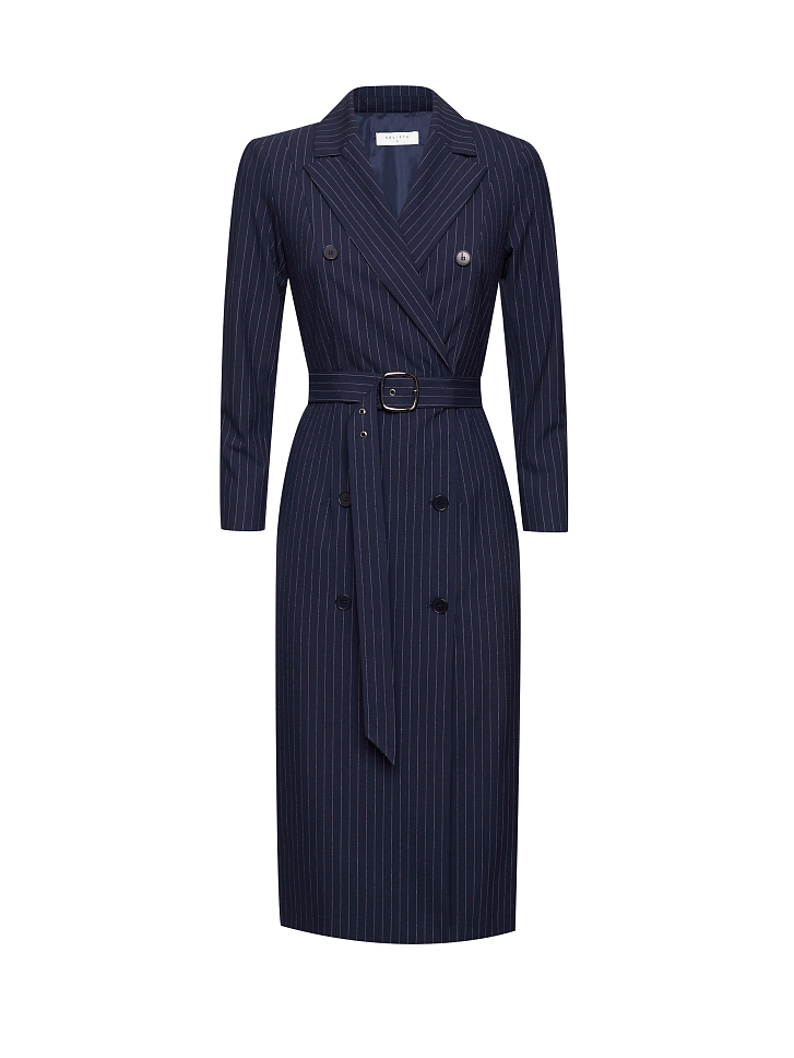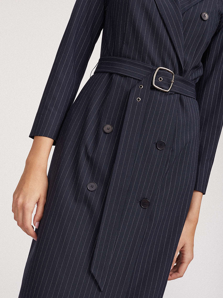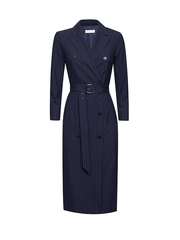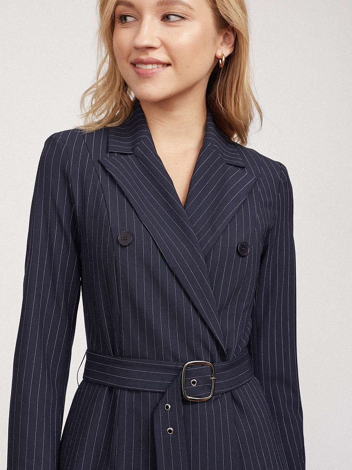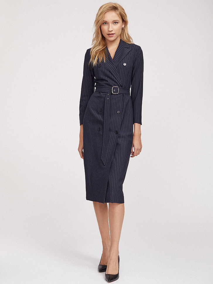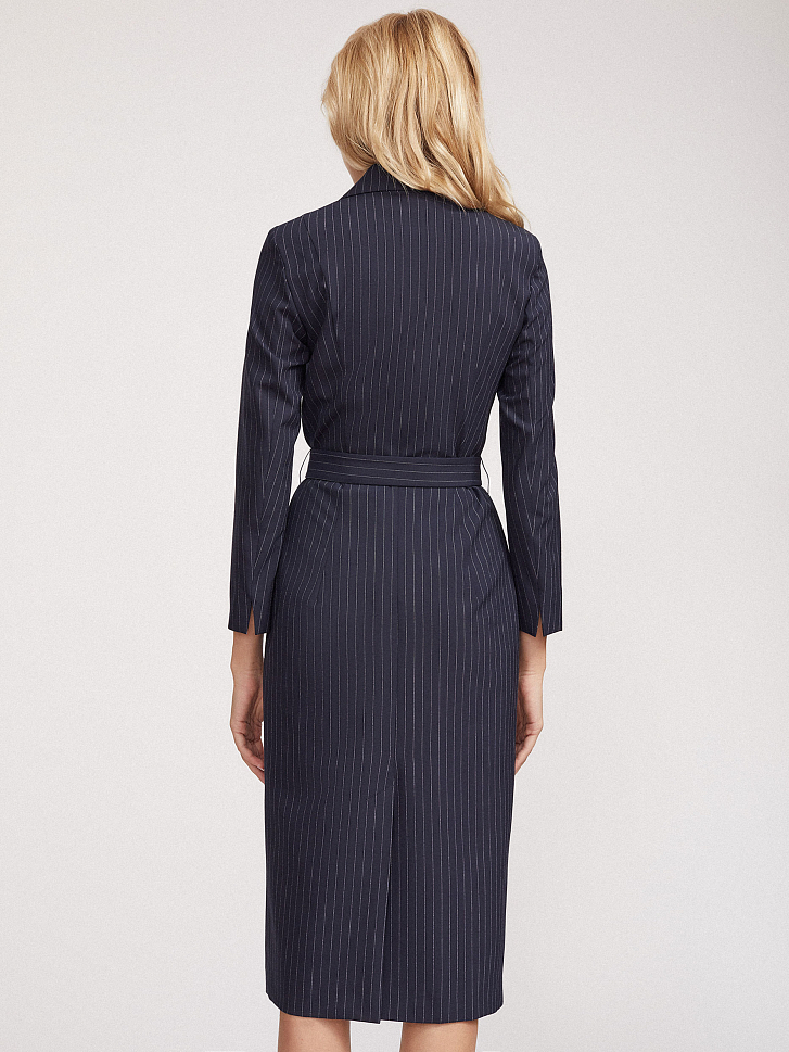 Приталенное платье в тонкую полоску, выполненное из смесовой вискозы. Лацканы, укороченные рукава с разрезами по бокам, двубортная застежка на пуговицы мраморной расцветки, подкладка.