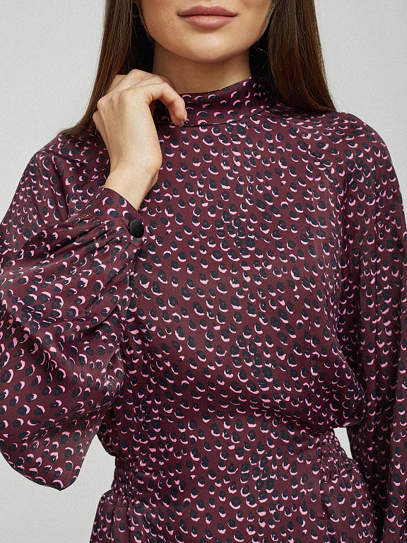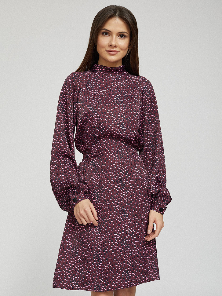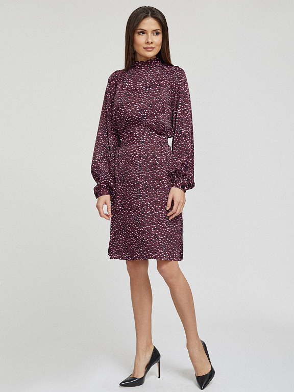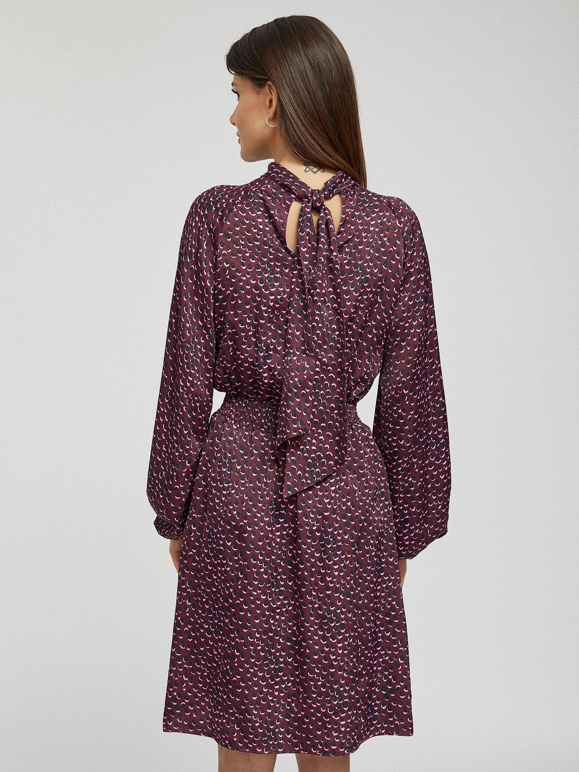 Платье с абстрактным принтом, выполненное из струящейся легкой ткани. Воротник-стойка с широкими лентами, длинные объемные рукава с манжетами на пуговицах, эластичная талия.