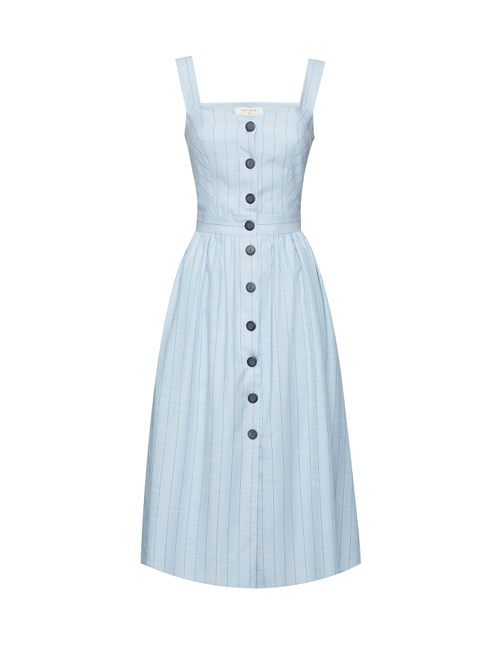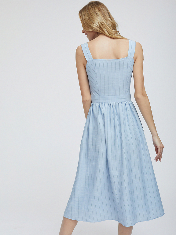 Сарафан из тенсела и хлопка в полоску. Приталенный крой, широкие бретели, застежка на ряд пуговиц.