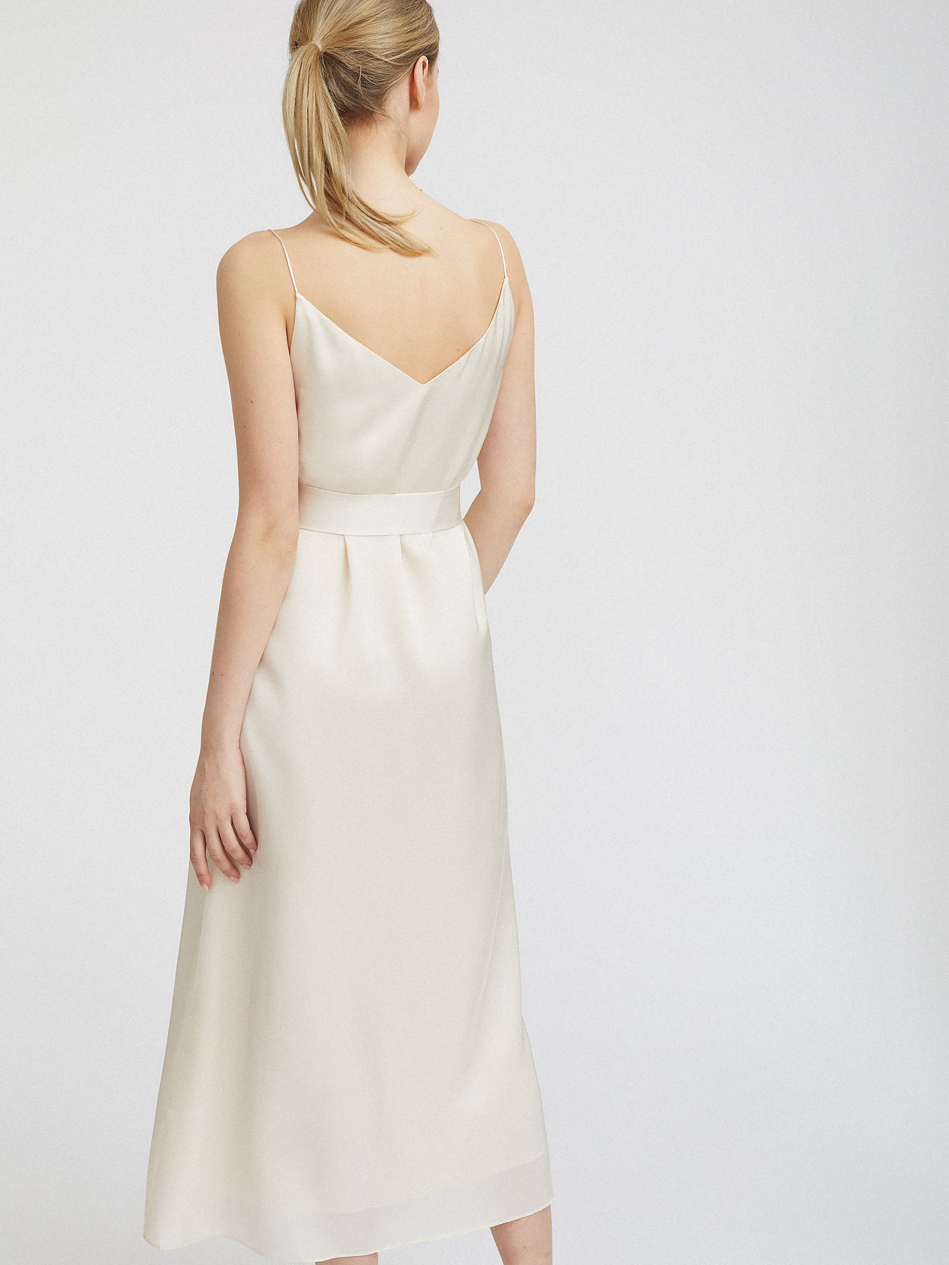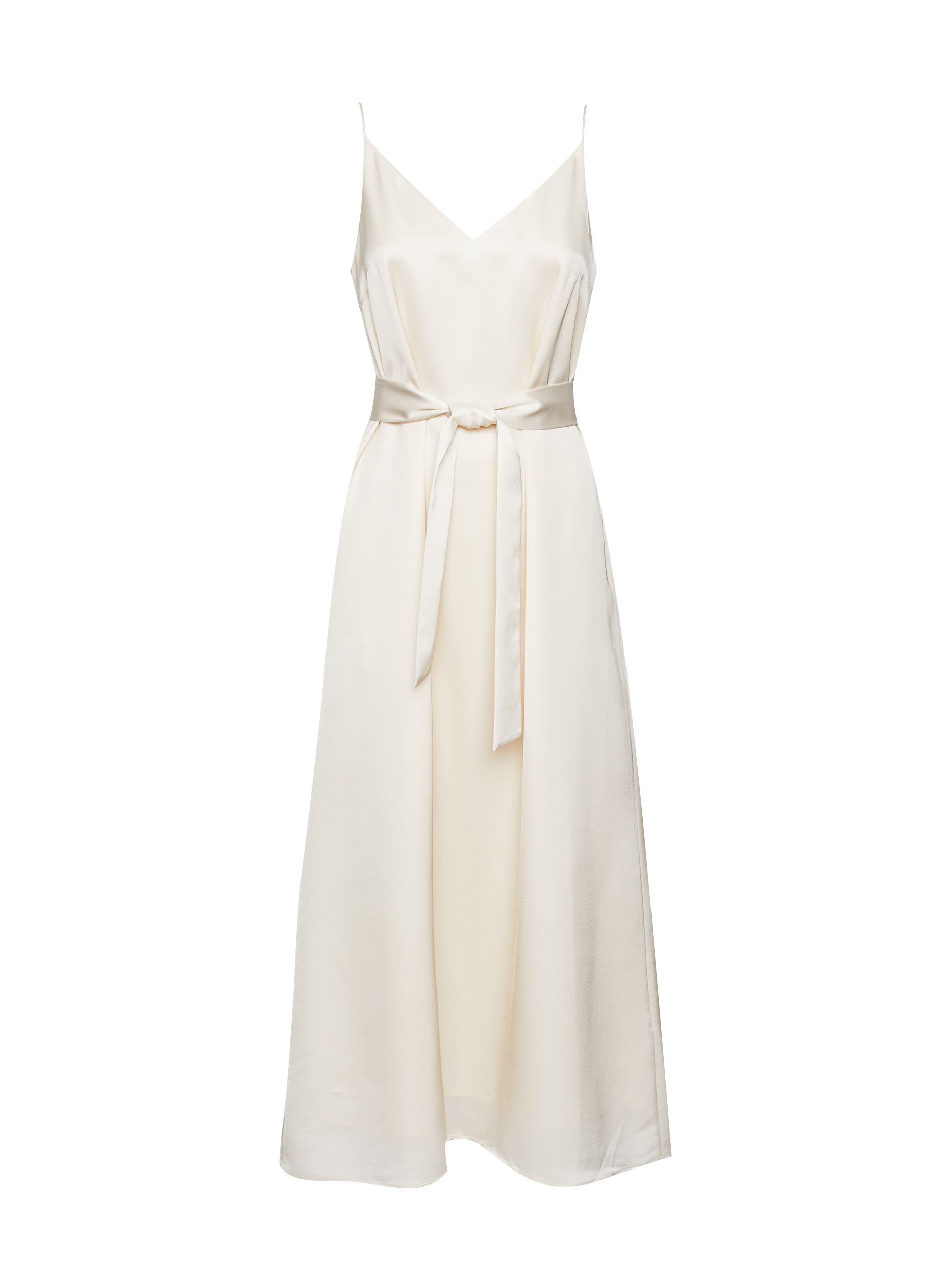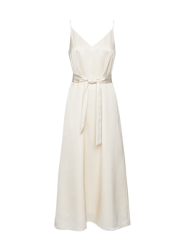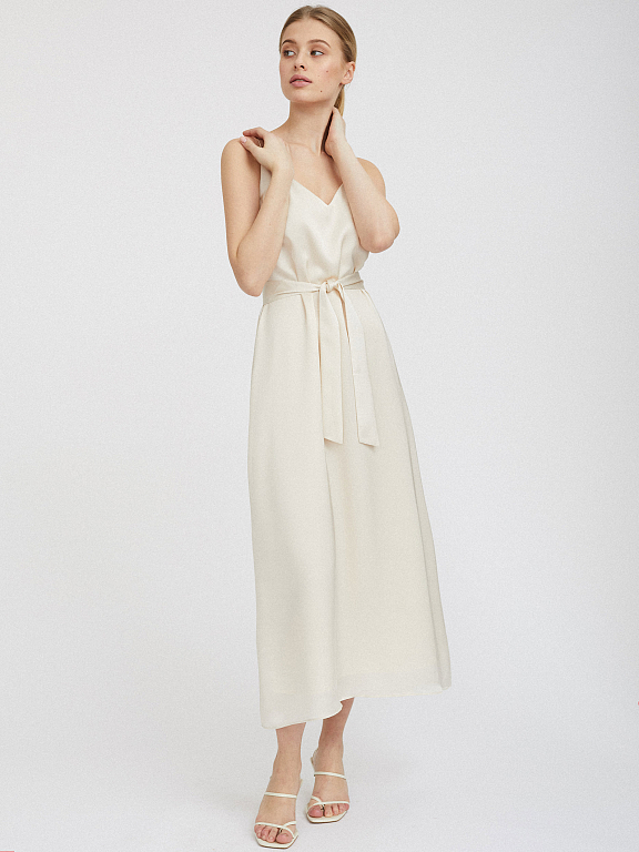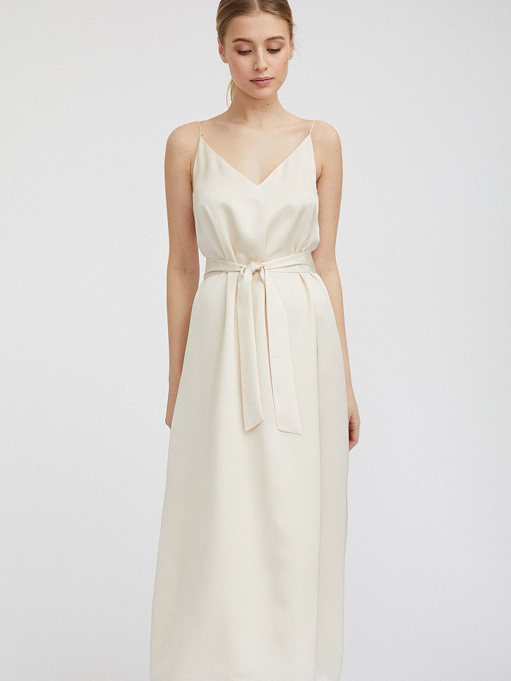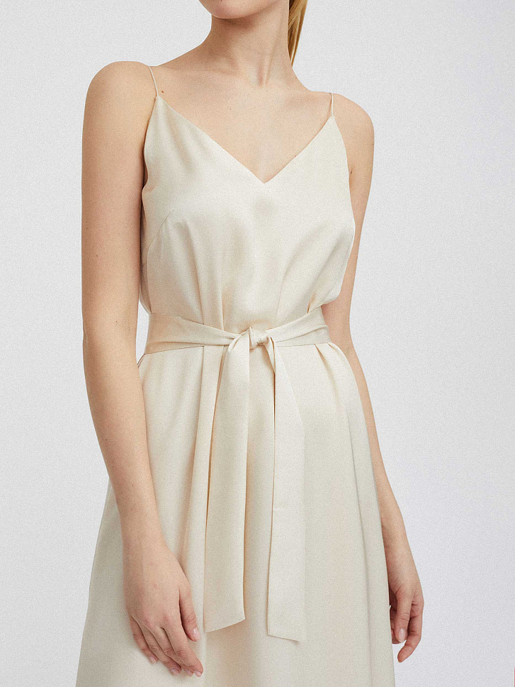 Однотонное платье-комбинация длины миди. Широкий крой, тонкие бретели, подкладка. В комплекте пояс из этой же ткани.