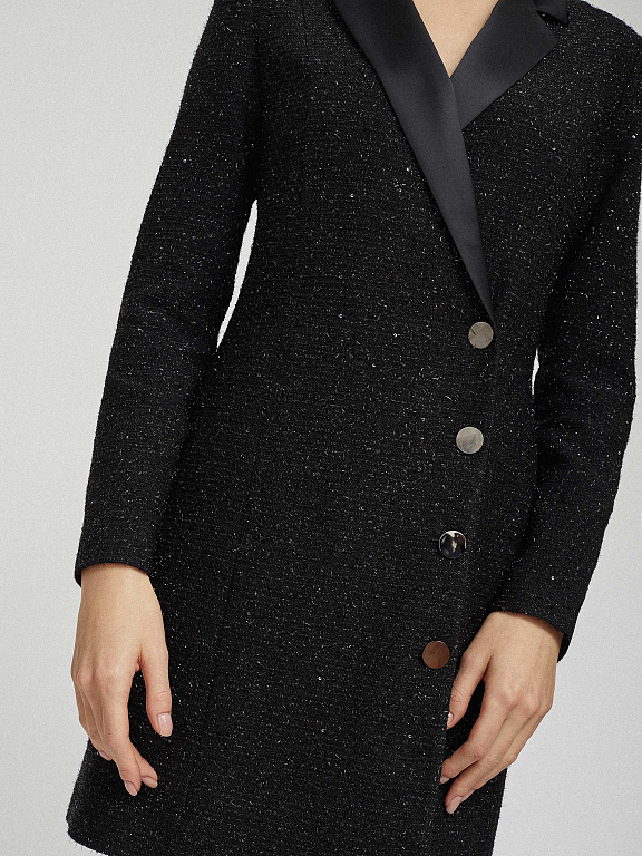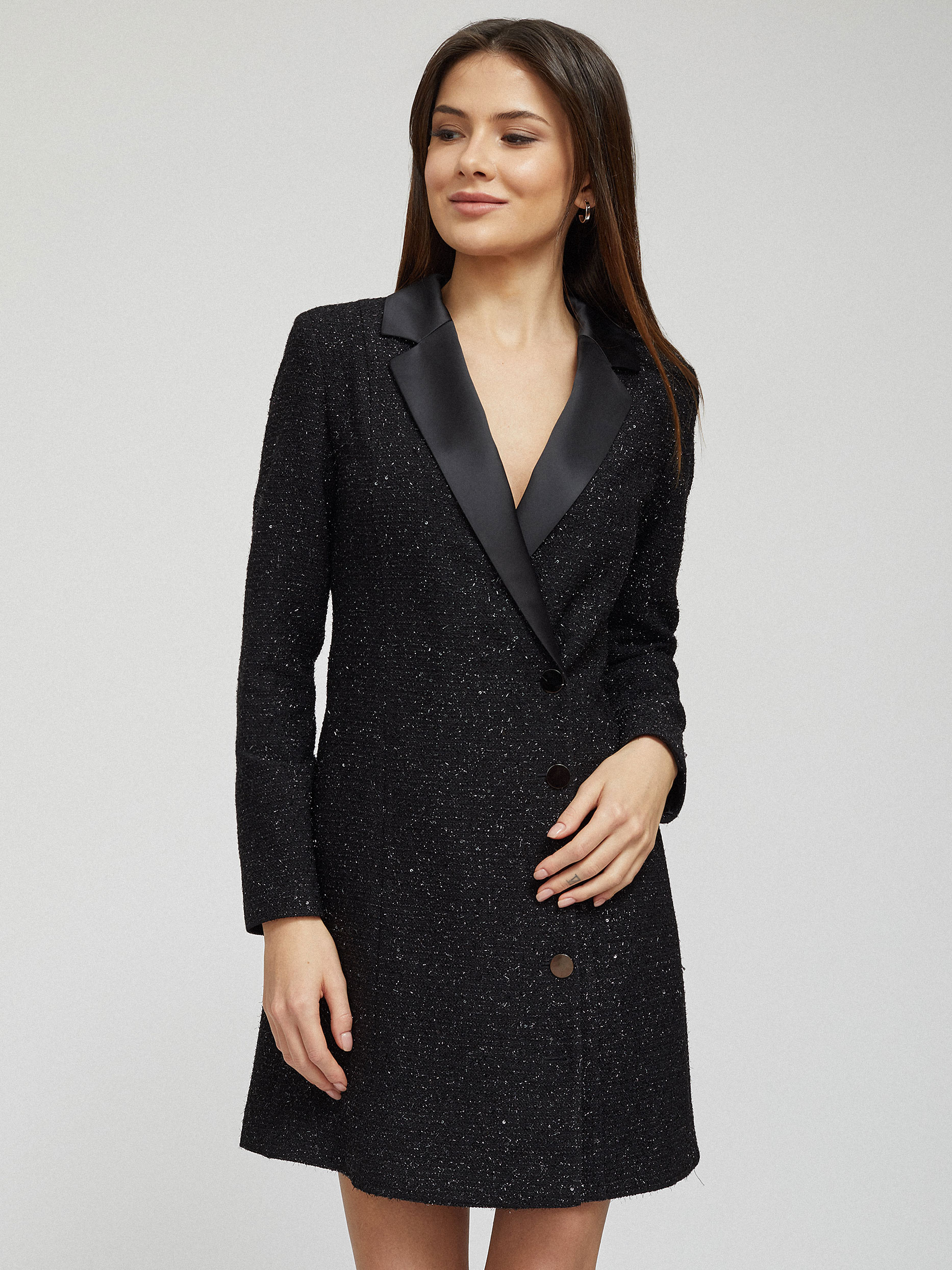 Платье длины мини на запах. Приталенный крой, атласный отложной воротник с остроконечными лацканами, подплечники, подкладка. Застегивается на ряд металлических пуговиц.