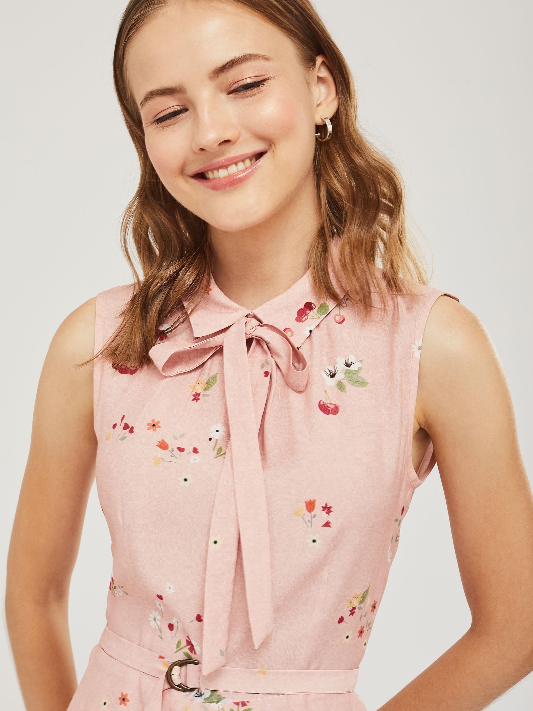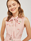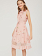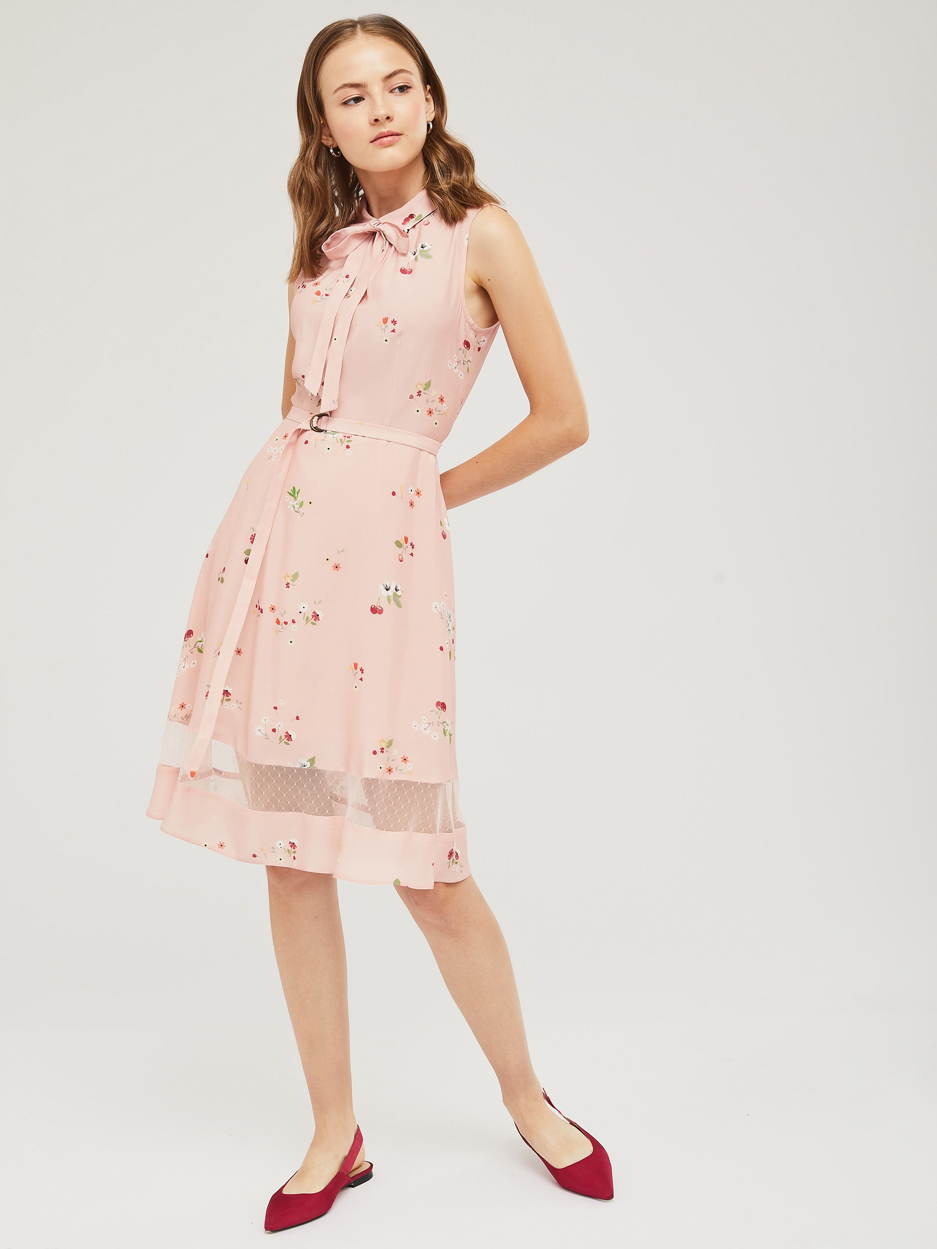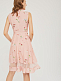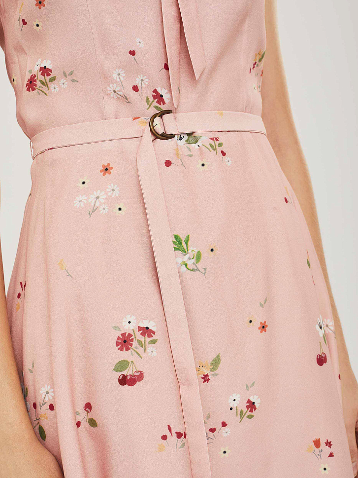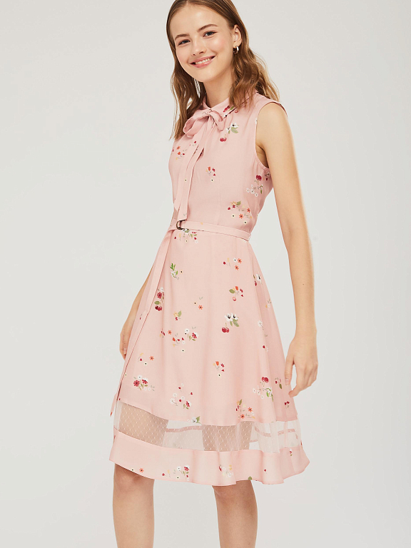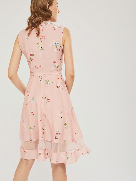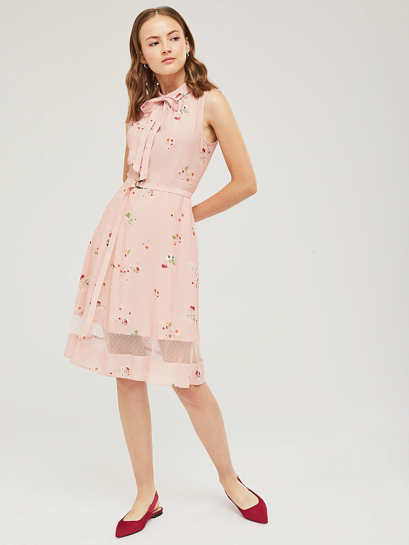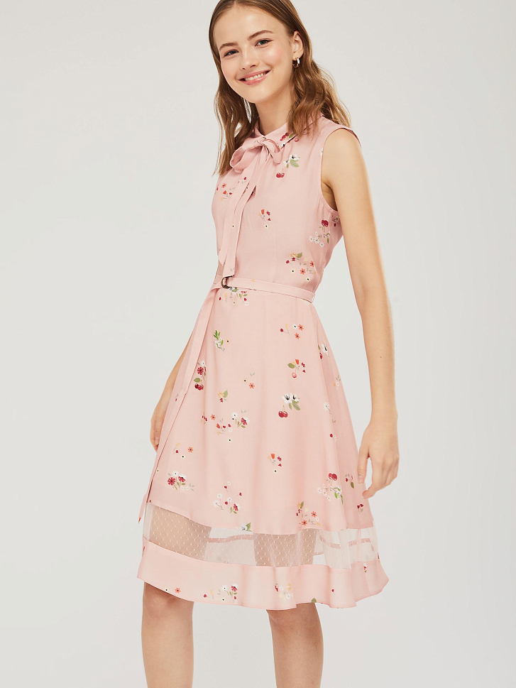 Приталенное платье без рукавов с отложным воротником и завязками на бант. Платье со вставкой из сетки по нижнему краю. Изделие со съёмным поясом и пряжкой. Застёжка на потайную молнию сзади. Изделие без подкладки.  Рост модели 176 см, размер 42 (российский)