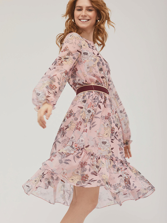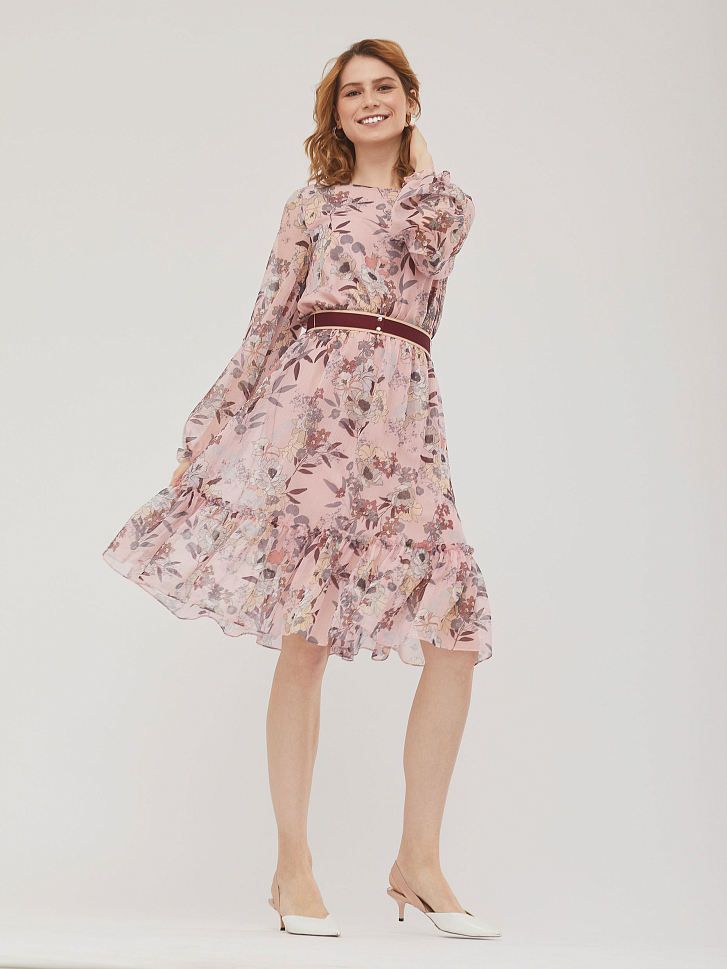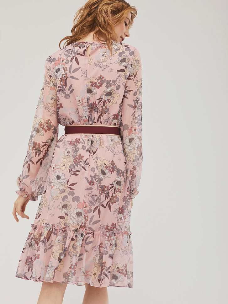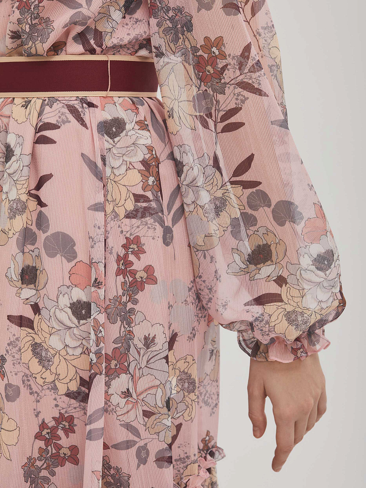 Приталенное платье с воланом и цветочным принтом. Круглый вырез горловины и объемные рукава, собранные на резинку.  Изделие присборенное на резинку на талии и съёмным поясом из плотной репсовой ленты с застёжкой на кнопки. Изделие на подкладке. Рост модели 173 см, размер 42 (российский). Плотность ткани: 250 г/м2