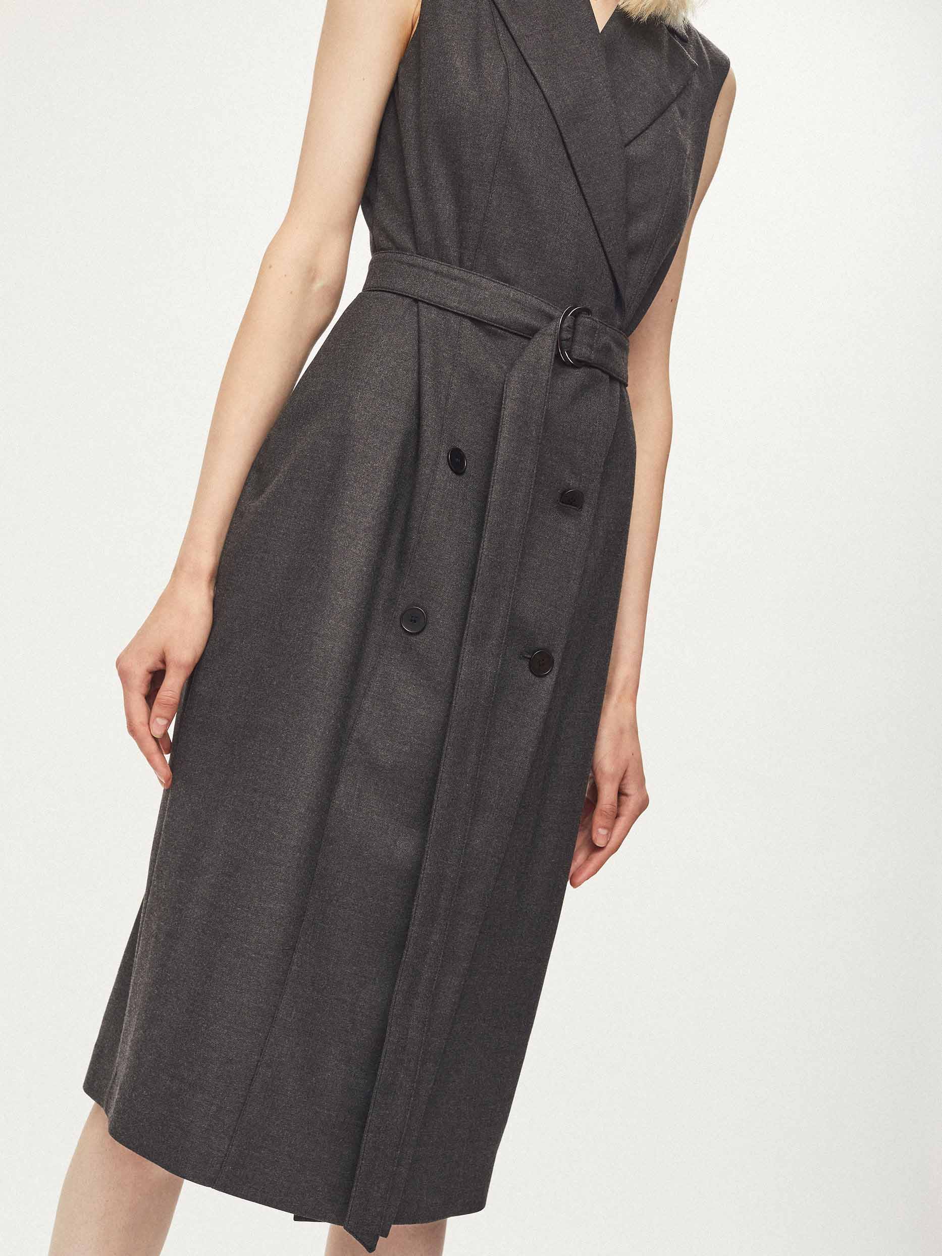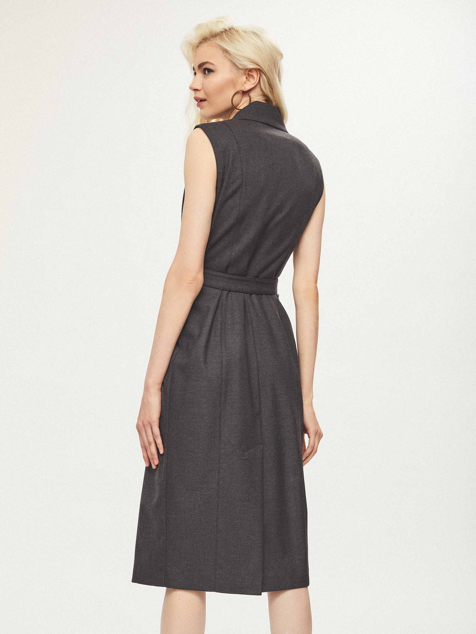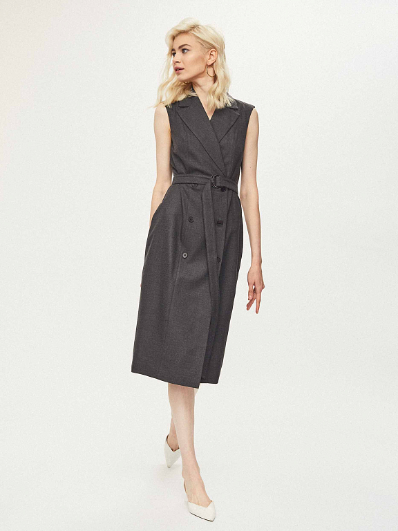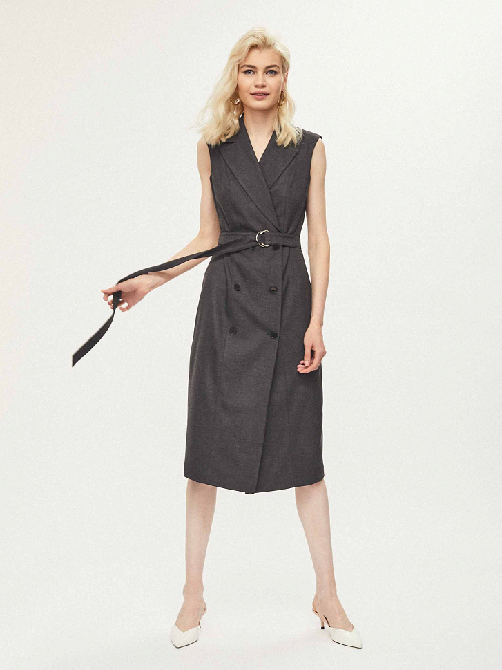 Приталенное платье без рукавов с лацканами и поясом в тон. Двубортная застежка на крупные пуговицы, шлица сзади. Изделие на подкладке.
