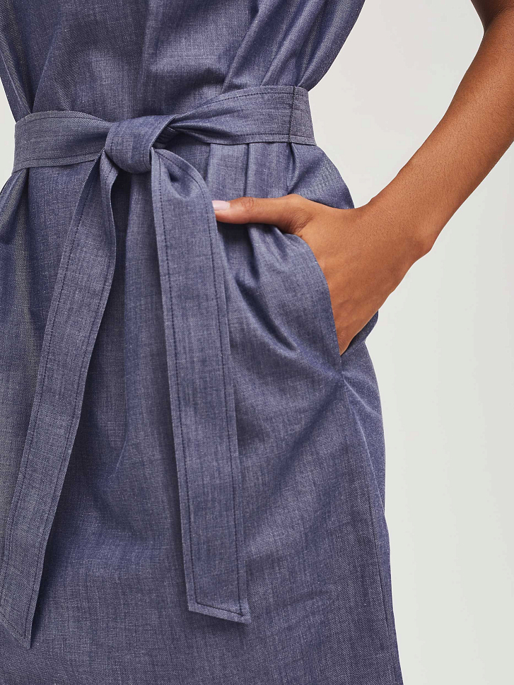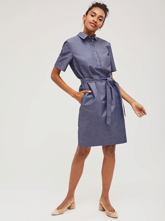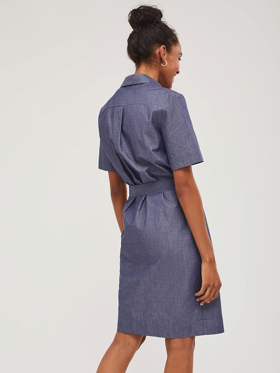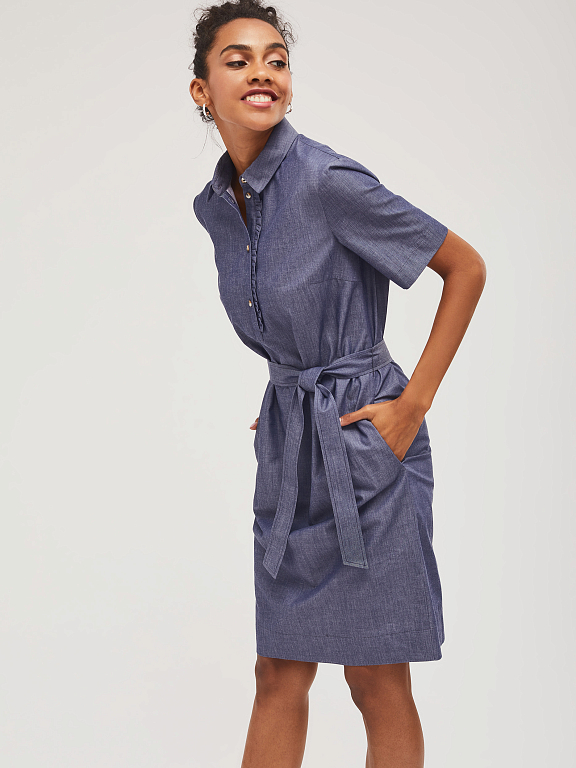 Хлопковое платье прямого силуэта с планкой на пуговицах с декоративной сборкой. Изделие со съёмным поясом из основной ткани. На спинке кокетка. Изделие без подкладки.  Рост модели 173 см, размер 42 (российский)