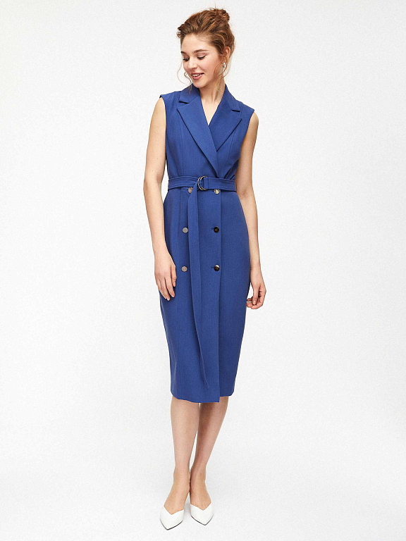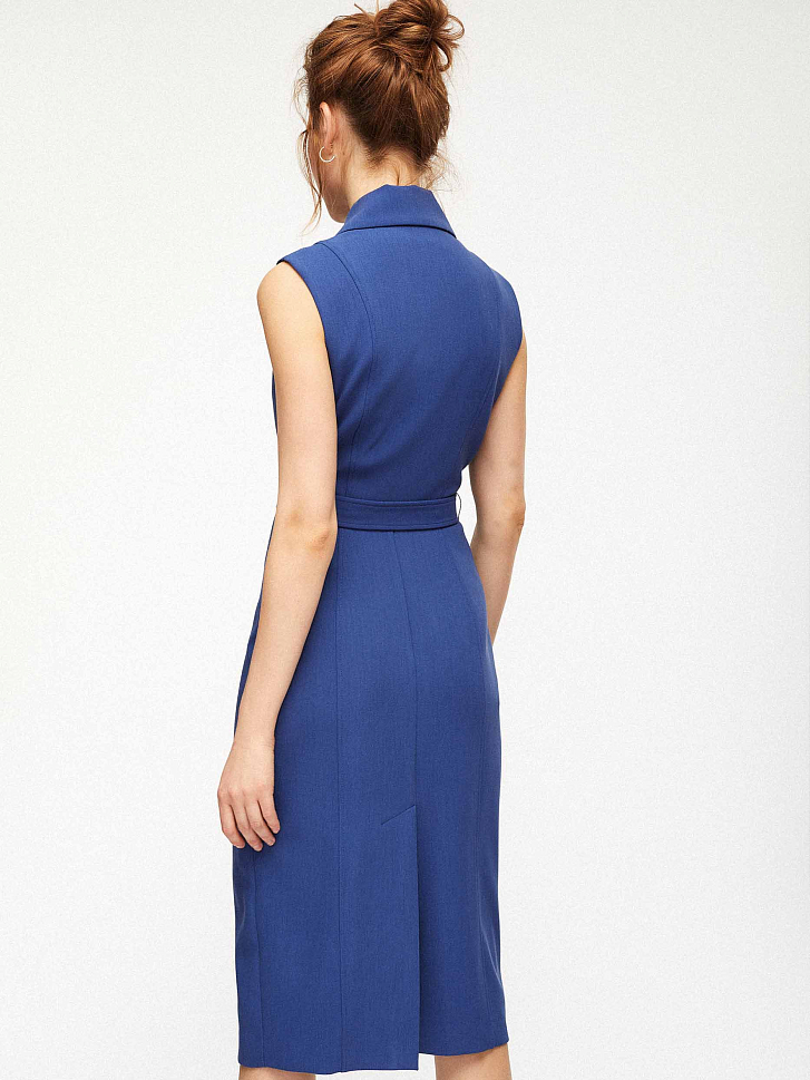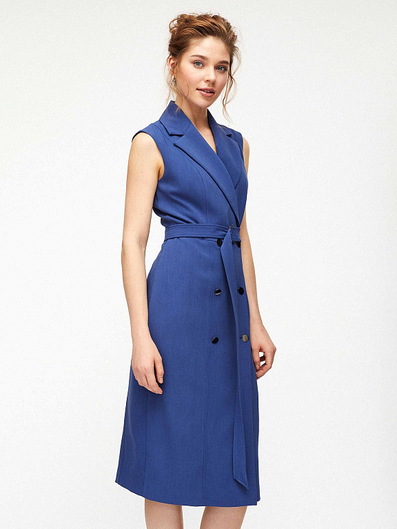 Платье с запахом, двубортной застежкой на металлические пуговицы, V-образным вырезом и поясом в тон.