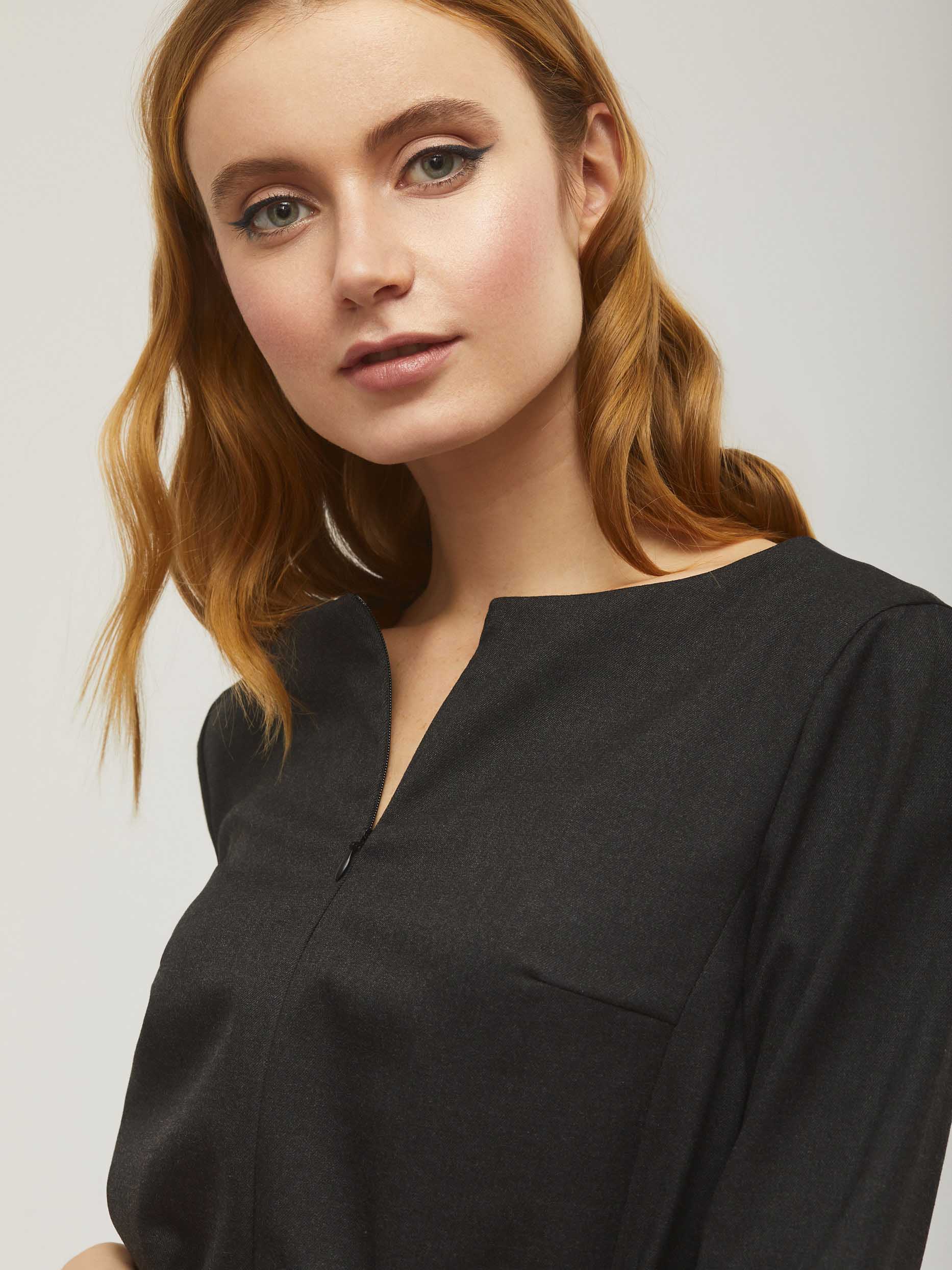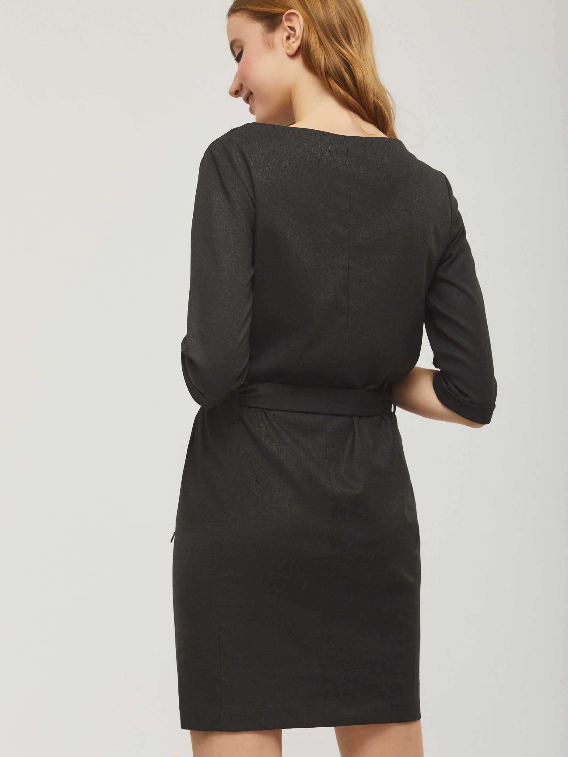 Прямое лаконичное платье с поясом на талии в цвет. Рукава длиной 3/4 с  пристроченными отворотами. Модель с вырезом горловины "лодочка" и застёжкой  на потайную молнию спереди.  Платье  с  карманами на молнии в рельефах. Изделие без подкладки. Рост модели 172 см, размер 42 (российский)