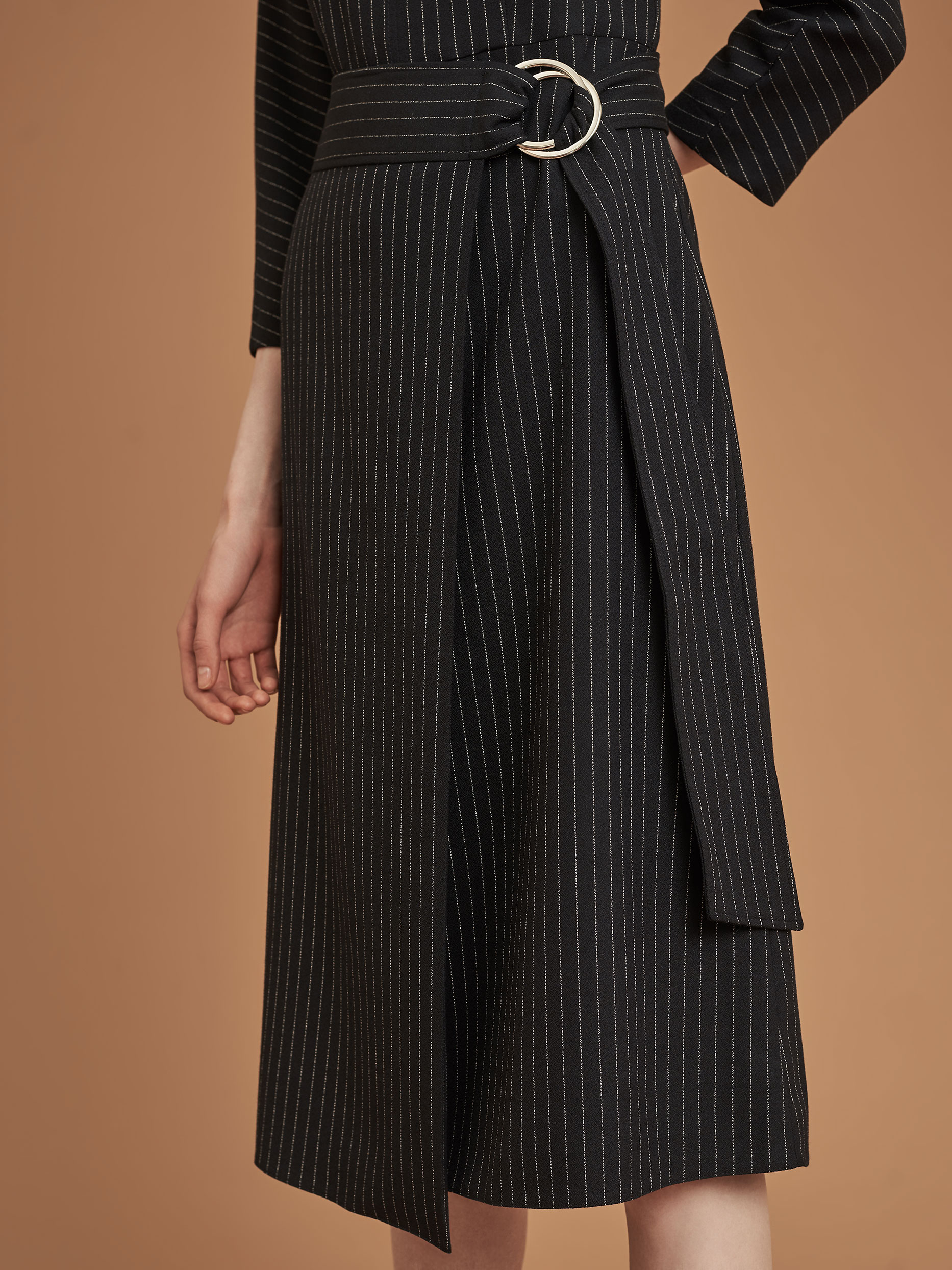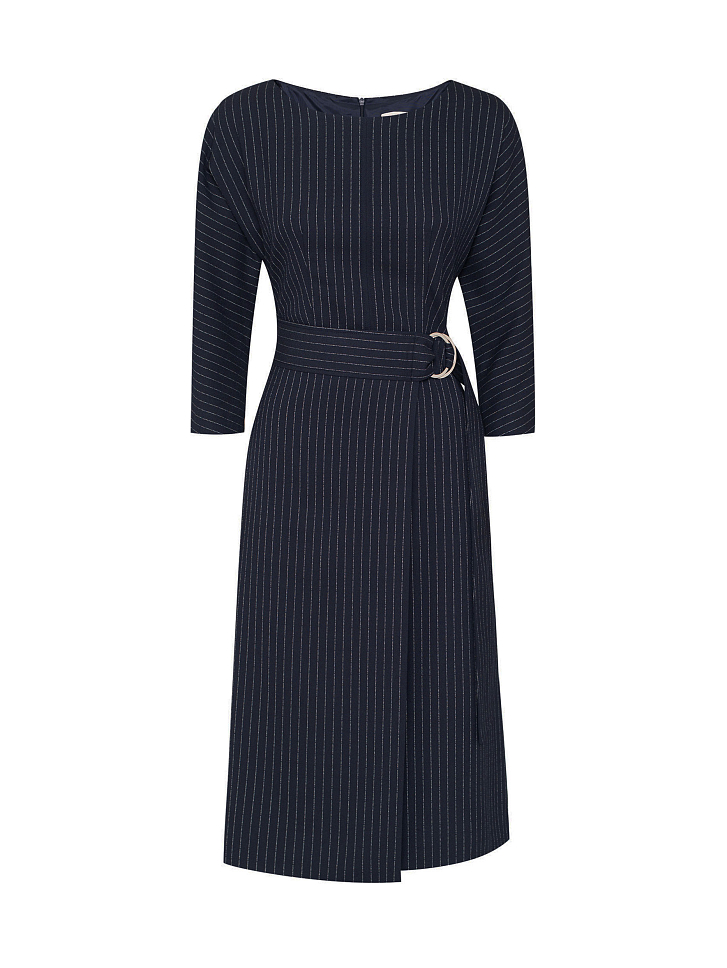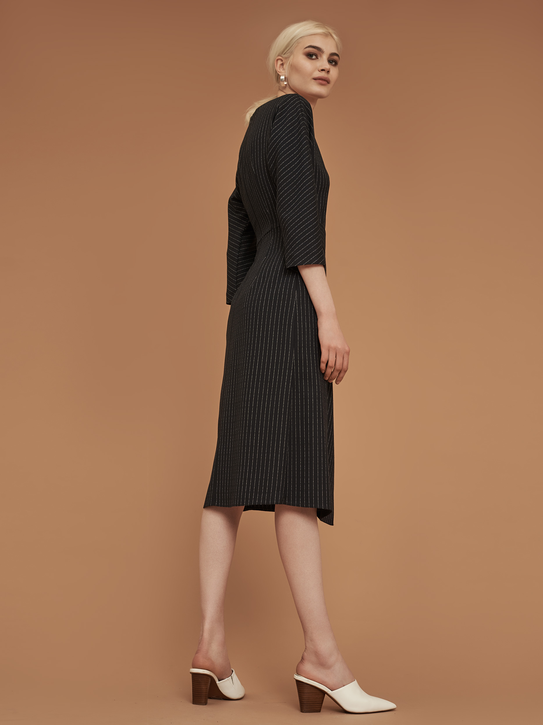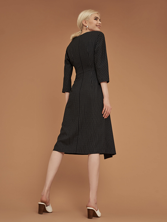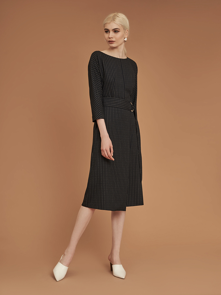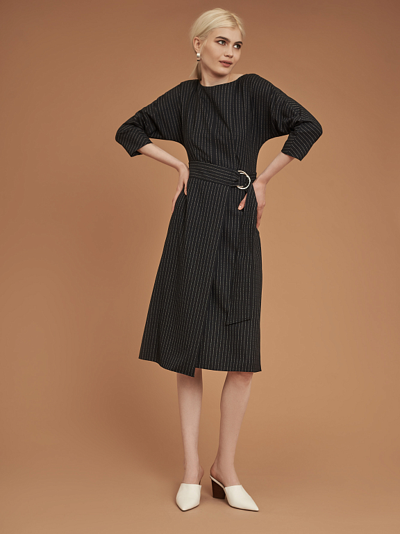 Приталенное платье длины миди. Юбка на запах с поясом в тон, округлый вырез, укороченные рукава с широкой проймой. Застегивается на потайную молнию на спине.