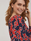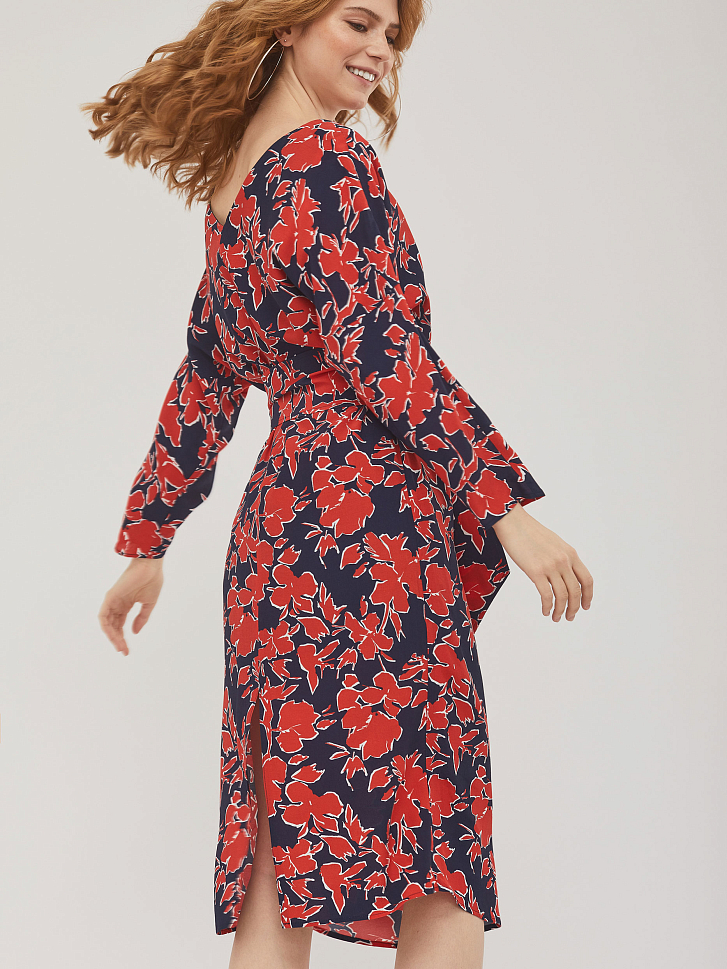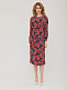 Платье из вискозы длины "миди" с принтом. Изделие со спущенной линией плеча и длинными рукавами. Вырез горловины "лодочка", широкий пояс на талии с металлическими кольцами. Сзади разрез. Изделие на подкладке. Рост модели 173 см, размер 42 (российский). Плотность ткани: 148 г/м2