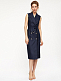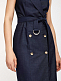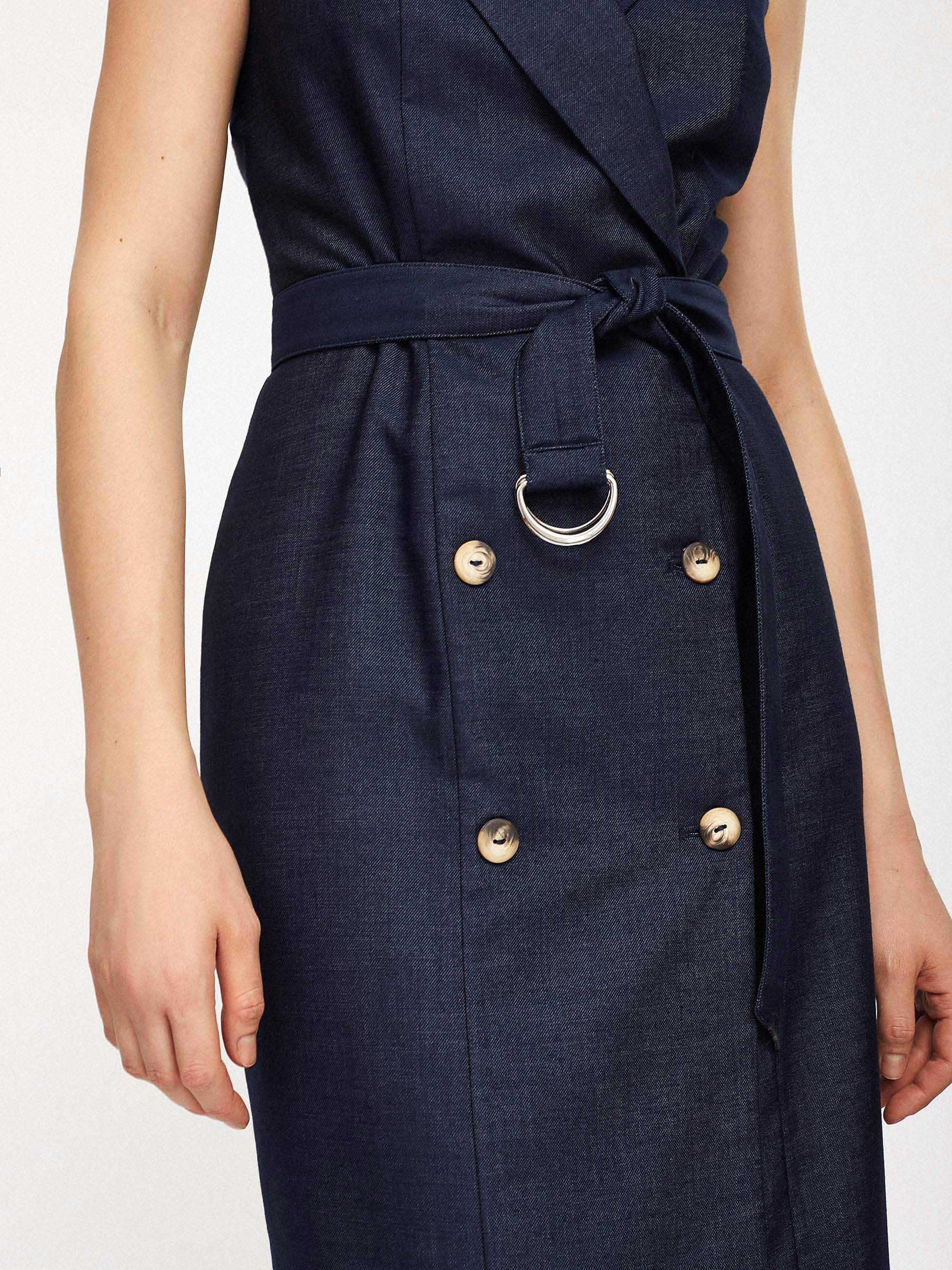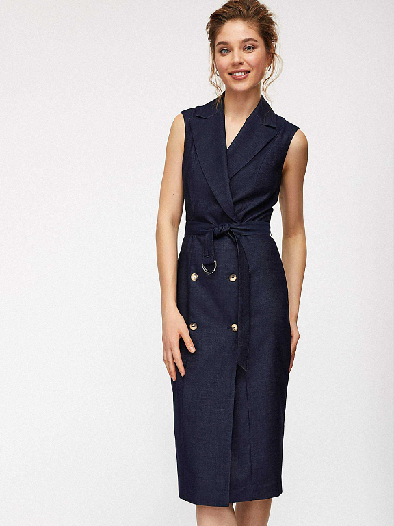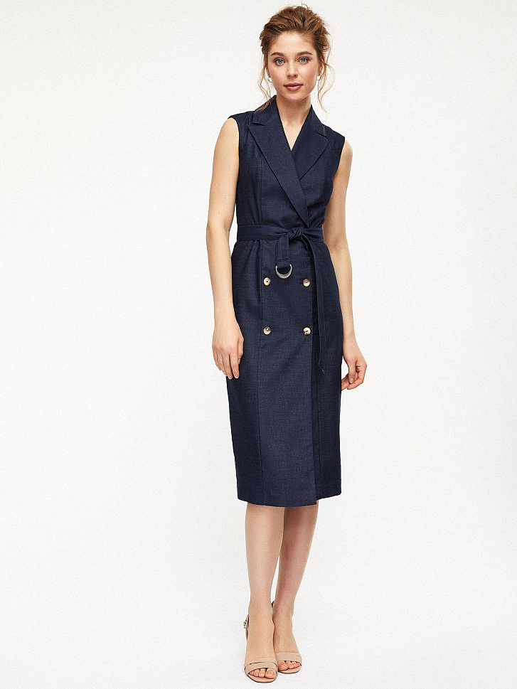 Платье-жилет прямого кроя с поясом в тон. Лацканы, длина миди, шлица. Застегивается на два ряда контрастных пуговиц.