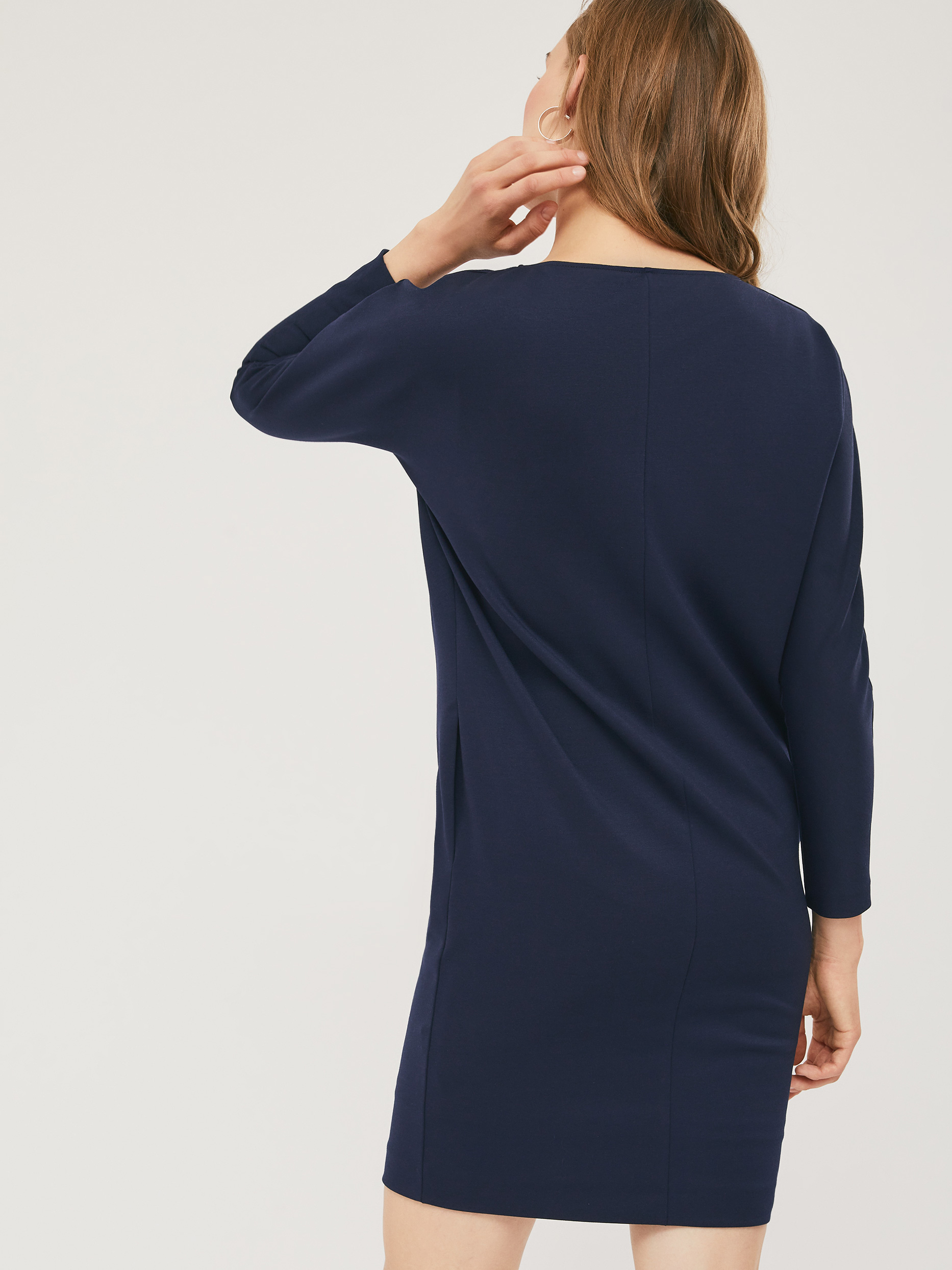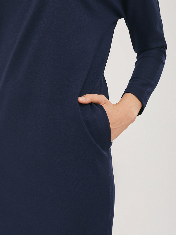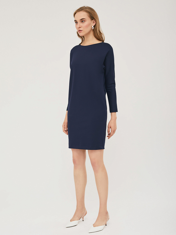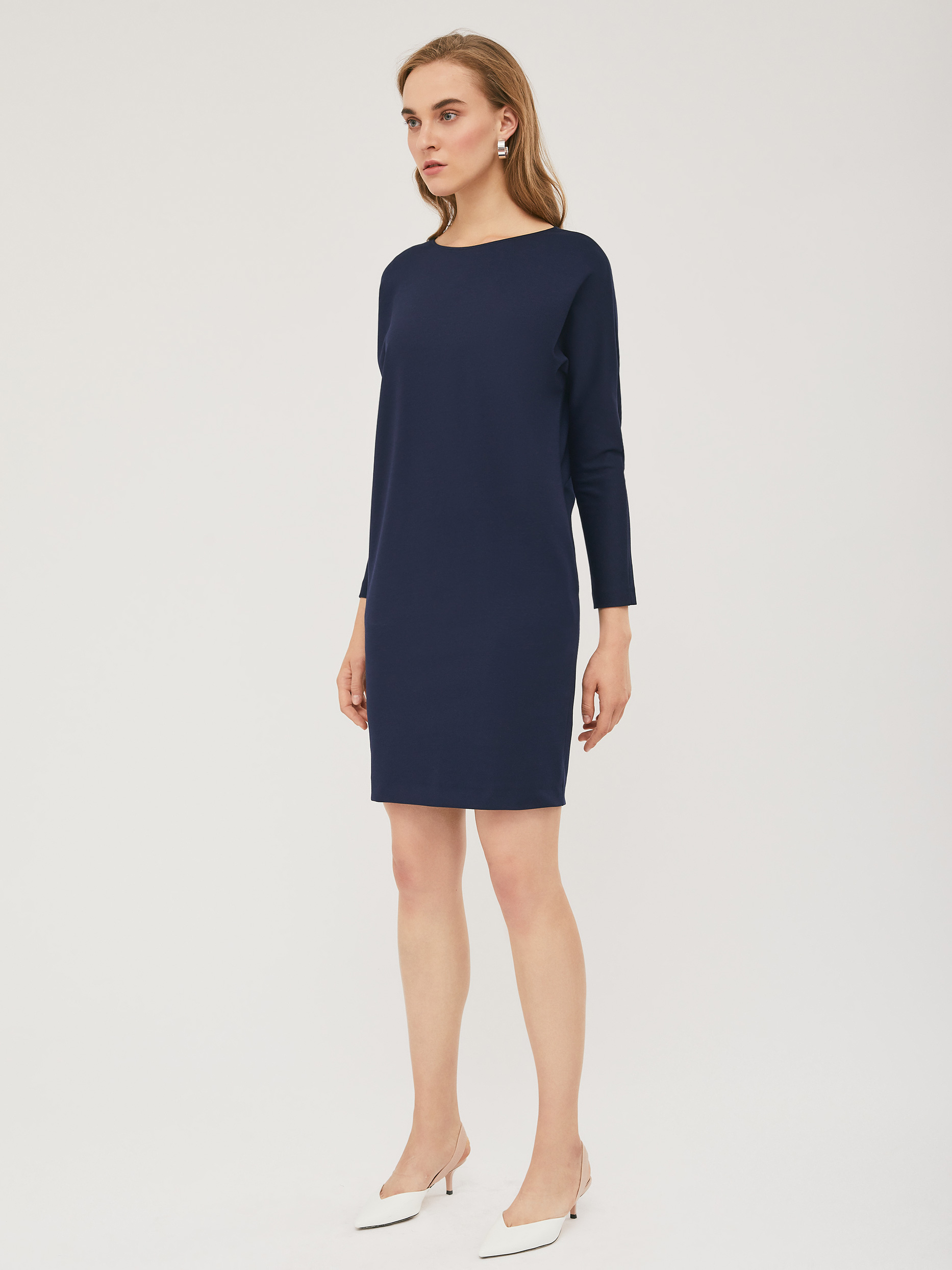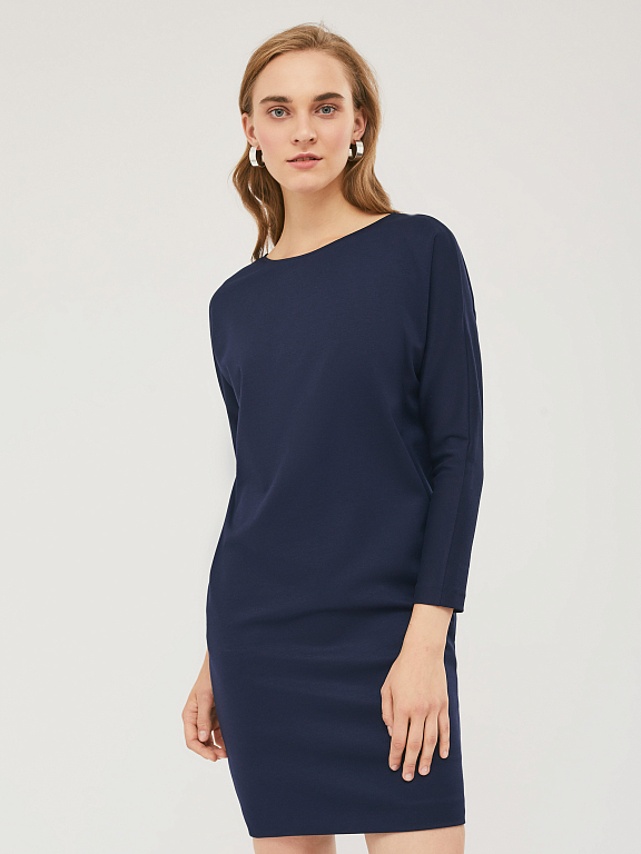 Платье прямого кроя длины мини. Вырез-лодочка, укороченные рукава с широкой проймой, прорезные карманы в боковых швах.