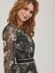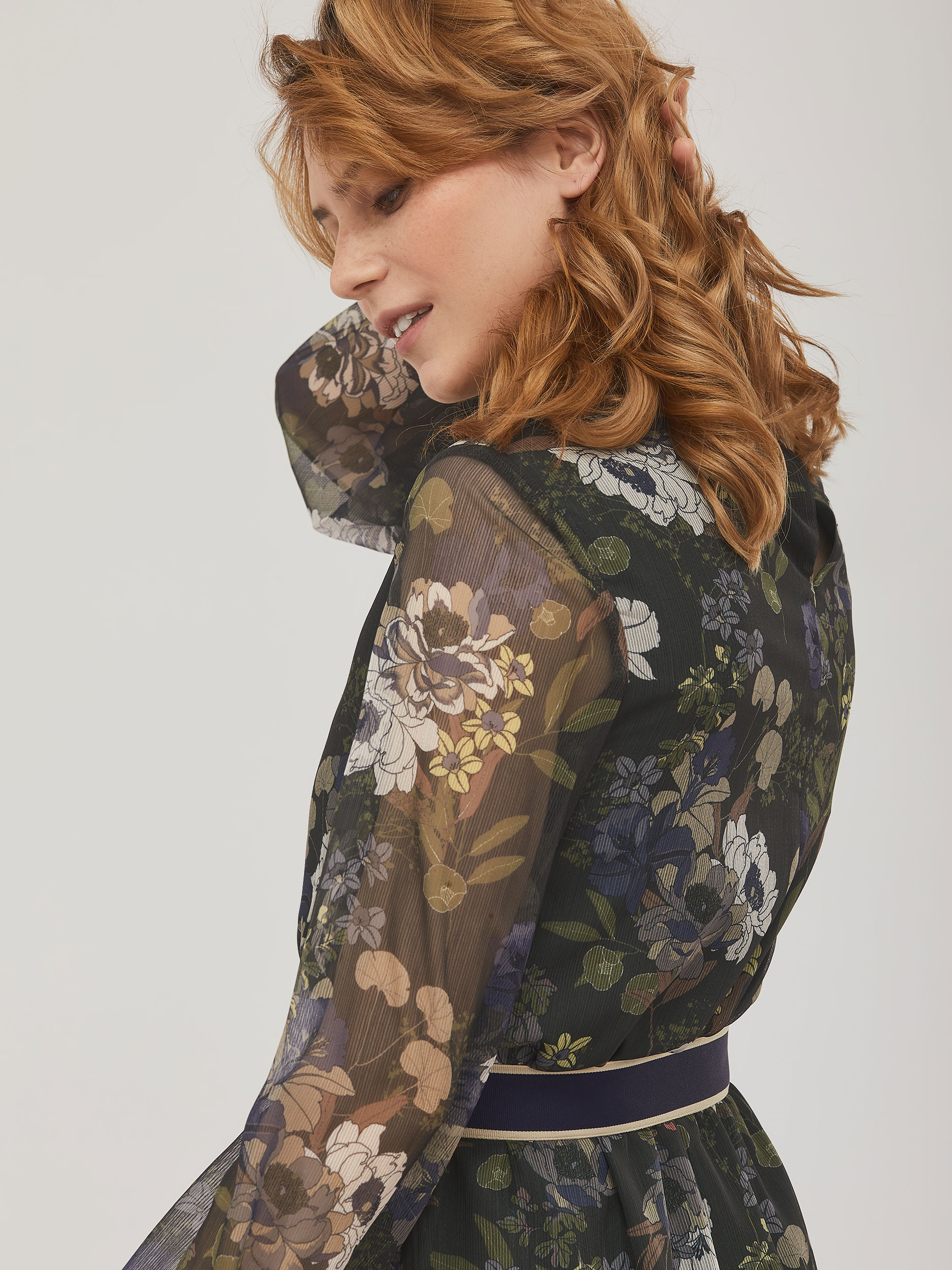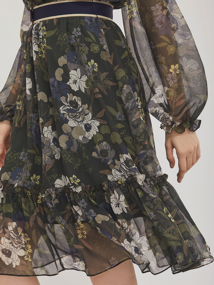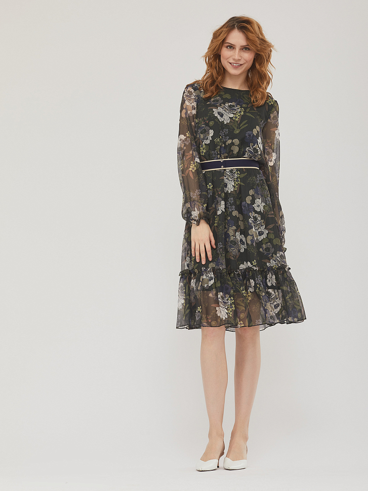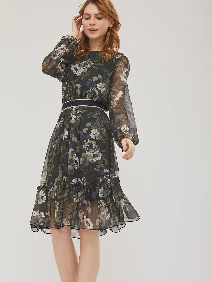 Приталенное платье с воланом и цветочным принтом. Круглый вырез горловины и объемные рукава, собранные на резинку.  Изделие присборенное на резинку на талии и съёмным поясом из плотной репсовой ленты с застёжкой на кнопки. Изделие на подкладке. Рост модели 173 см, размер 42 (российский). Плотность ткани: 250 г/м2