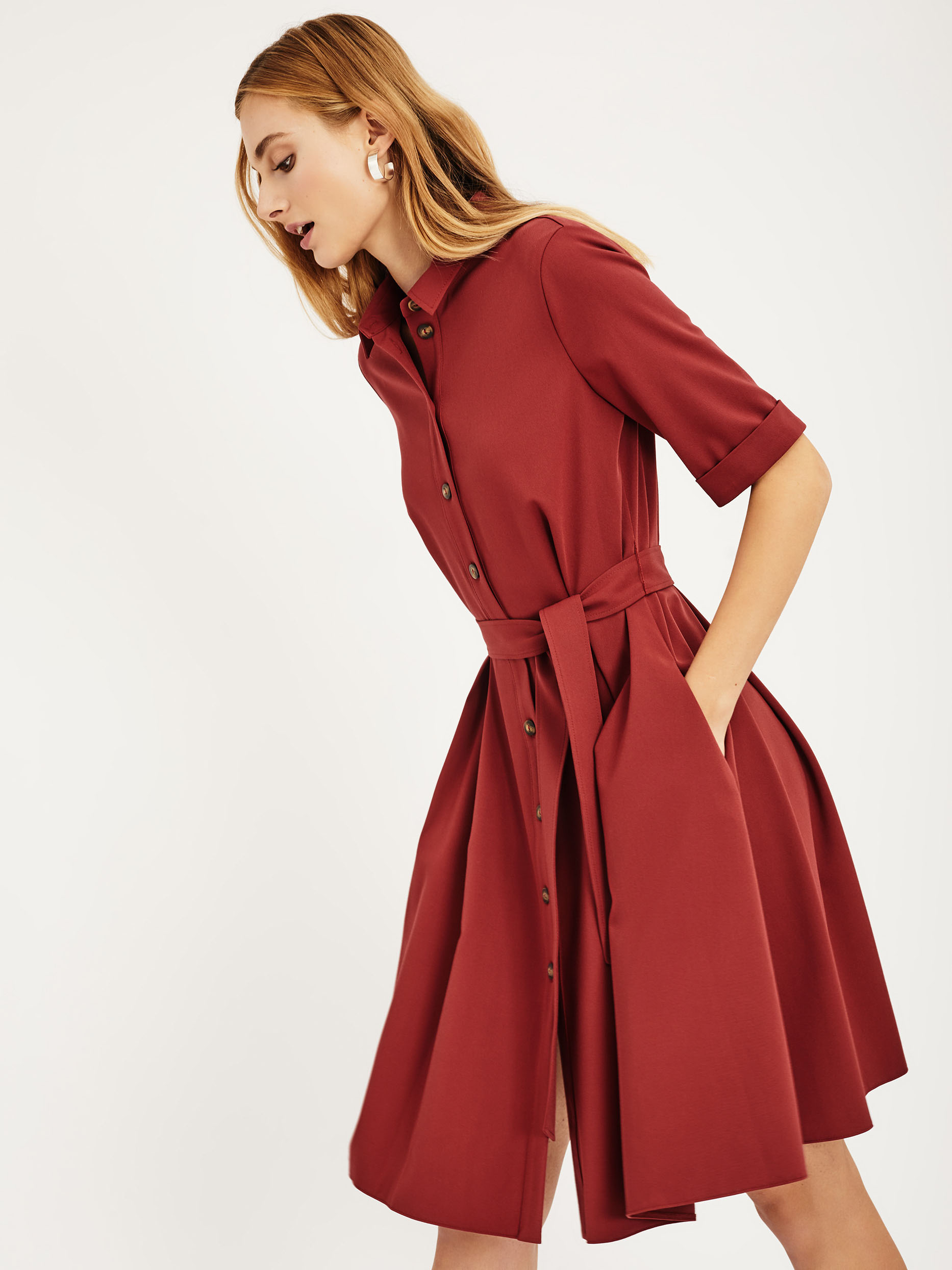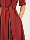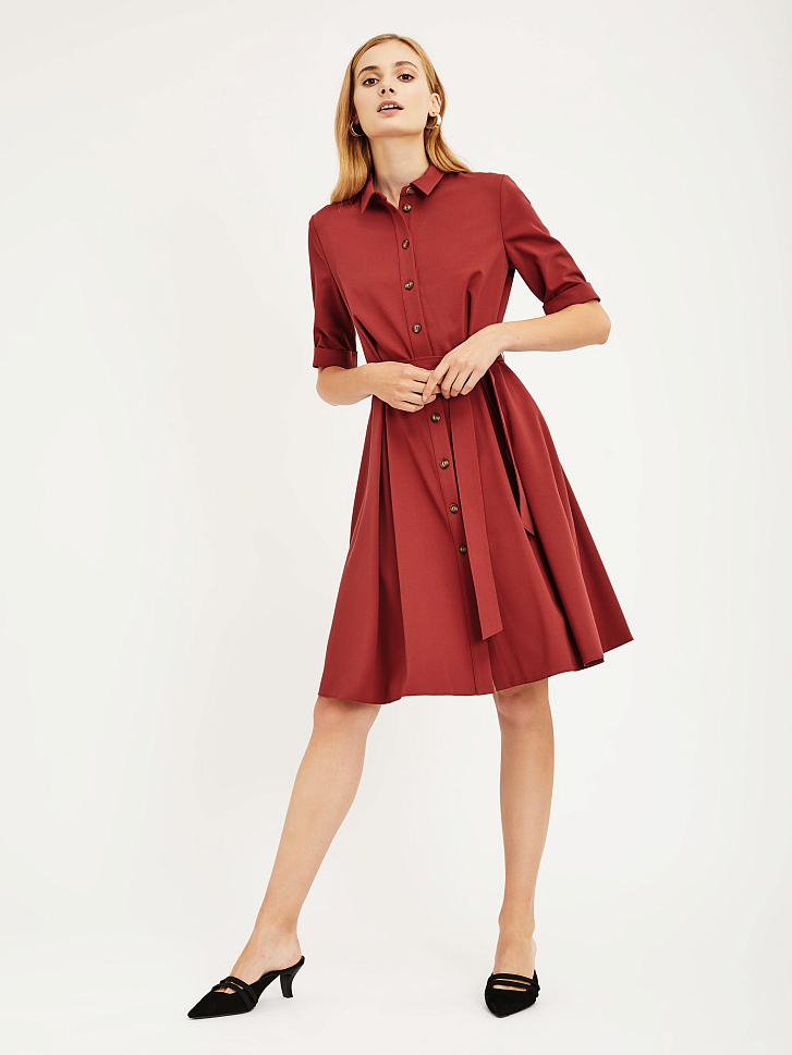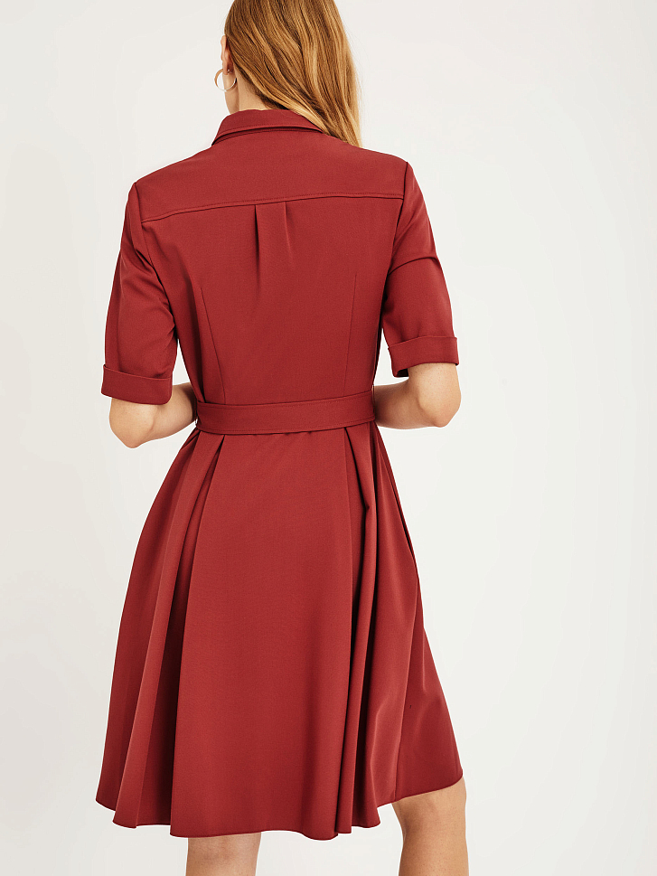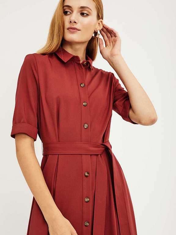 Платье-рубашка приталенного силуэта с отложным воротником. Изделие на пуговицах спереди и поясом на талии. Рукава длиной до локтя с зашитыми отворотами. Платье с карманами в боковых швах. На спинке кокетка. Изделие без подкладки.  Рост модели 172 см, размер 42 (российский)