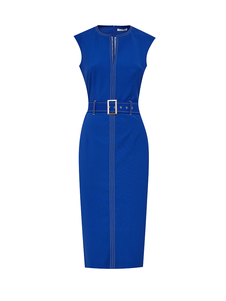 Платье облегающего силуэта с контрастной строчкой и поясом из этой же ткани. Фигурный вырез, шлица, застежка на потайную молнию.