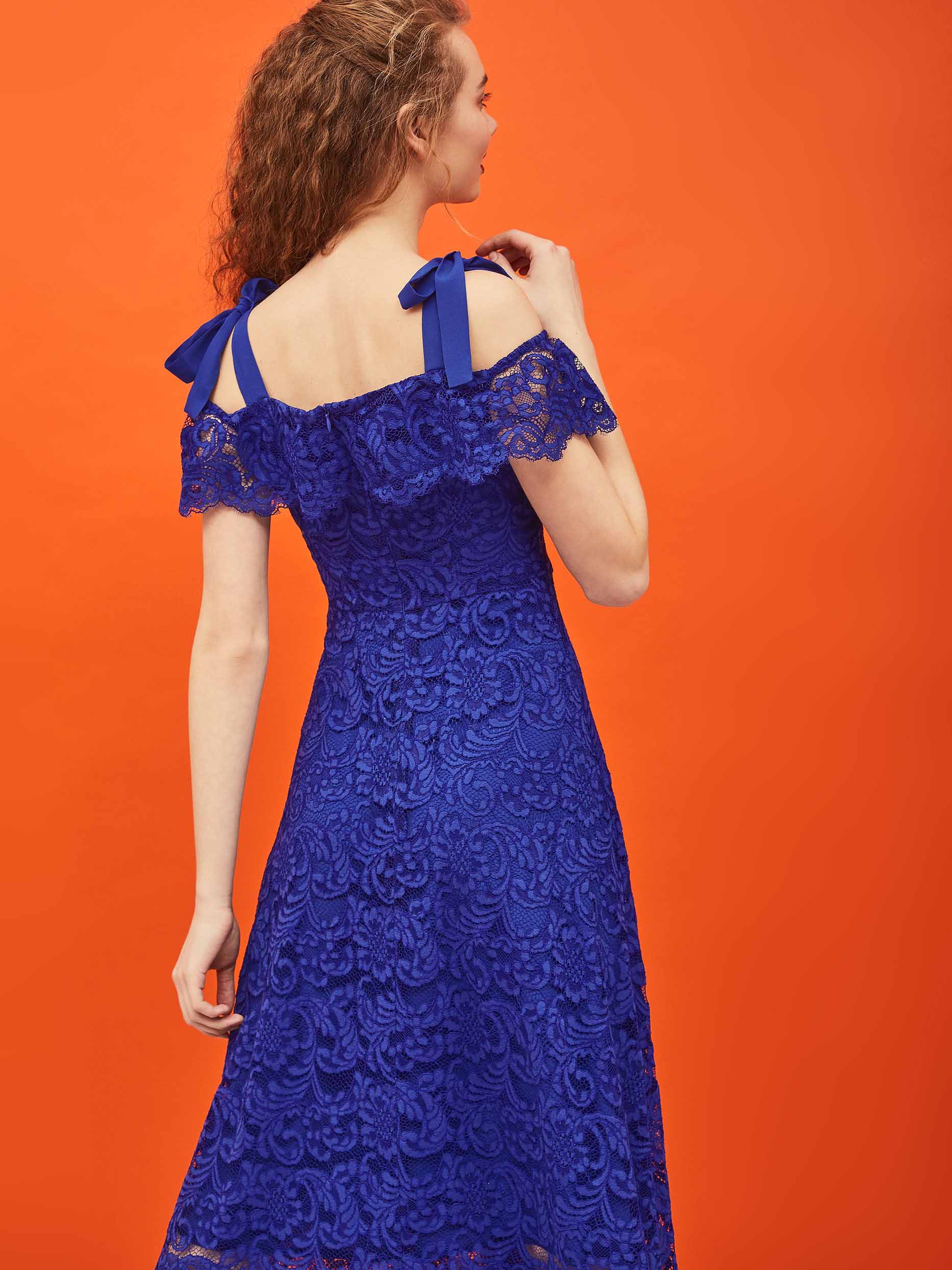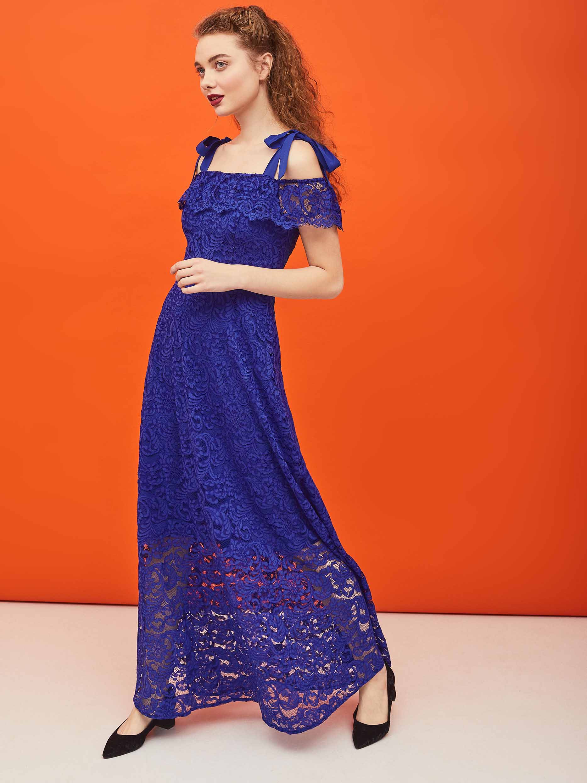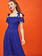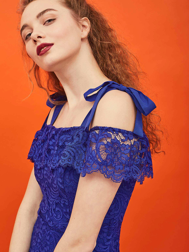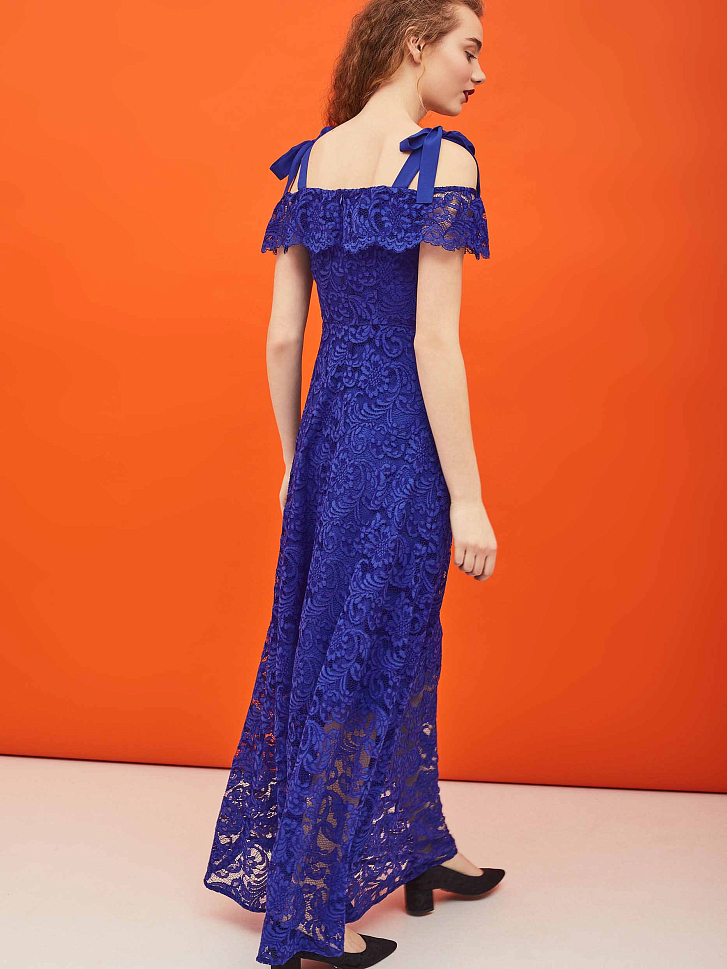 Платье из кружевной ткани  длины макси. Изделие  с открытыми плечами и завязками на бант из шифона. Отрезное по талии с расклешённой юбкой. Застёжка на потайную молнию сзади. Изделие на подкладке.  Рост модели 177 см, размер 42 (российский)