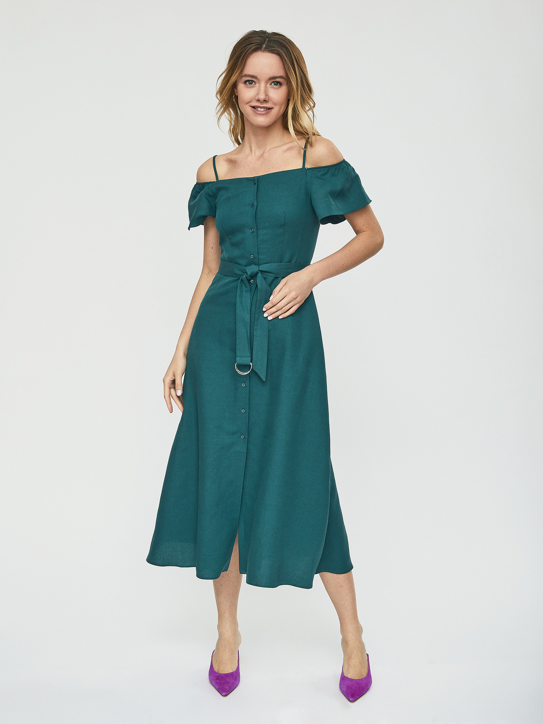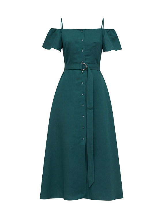 Платье приталенного кроя из смесового льна с тонкими бретелями, спущенными рукавами-воланами и поясом в тон. Застежка на ряд небольших пуговиц.