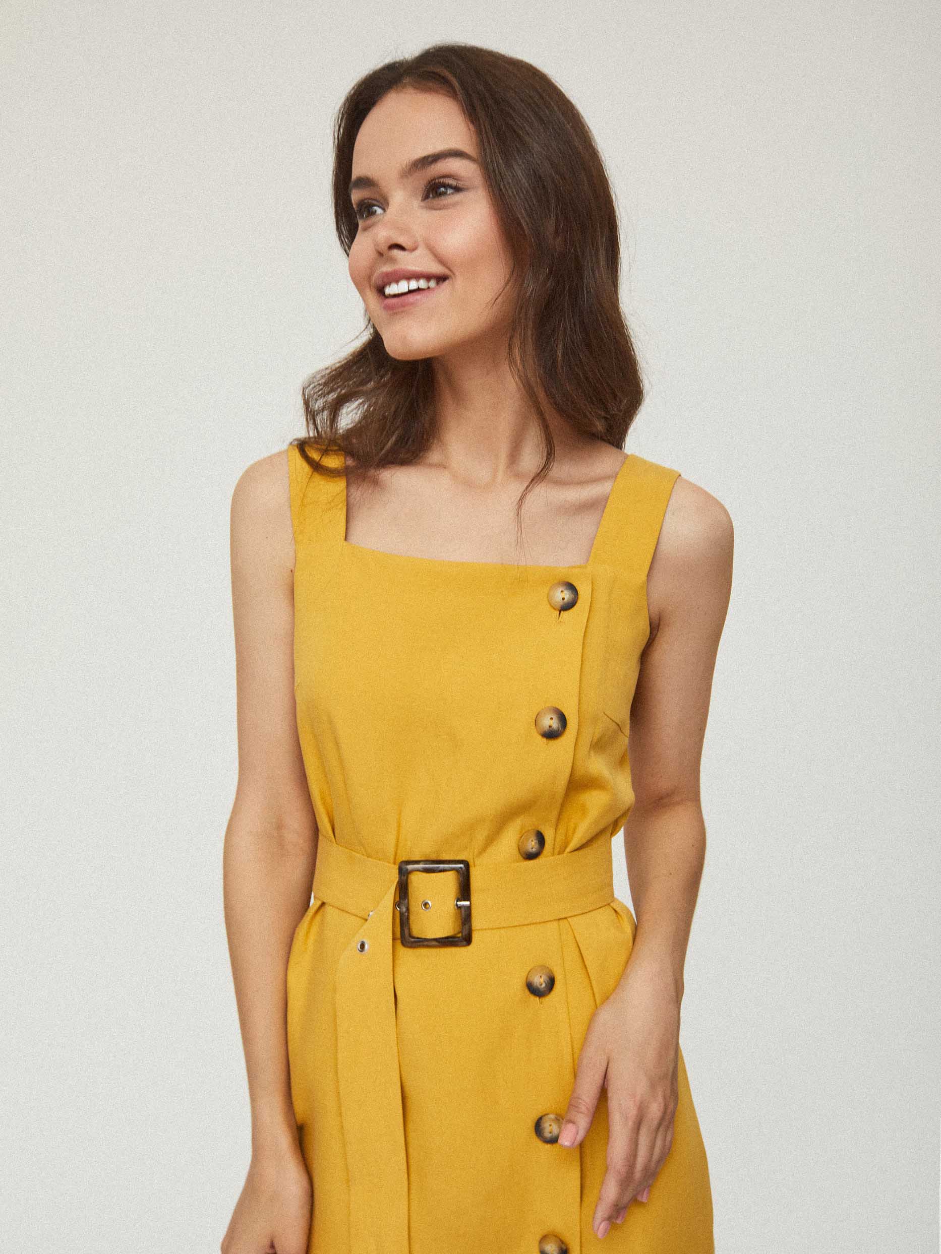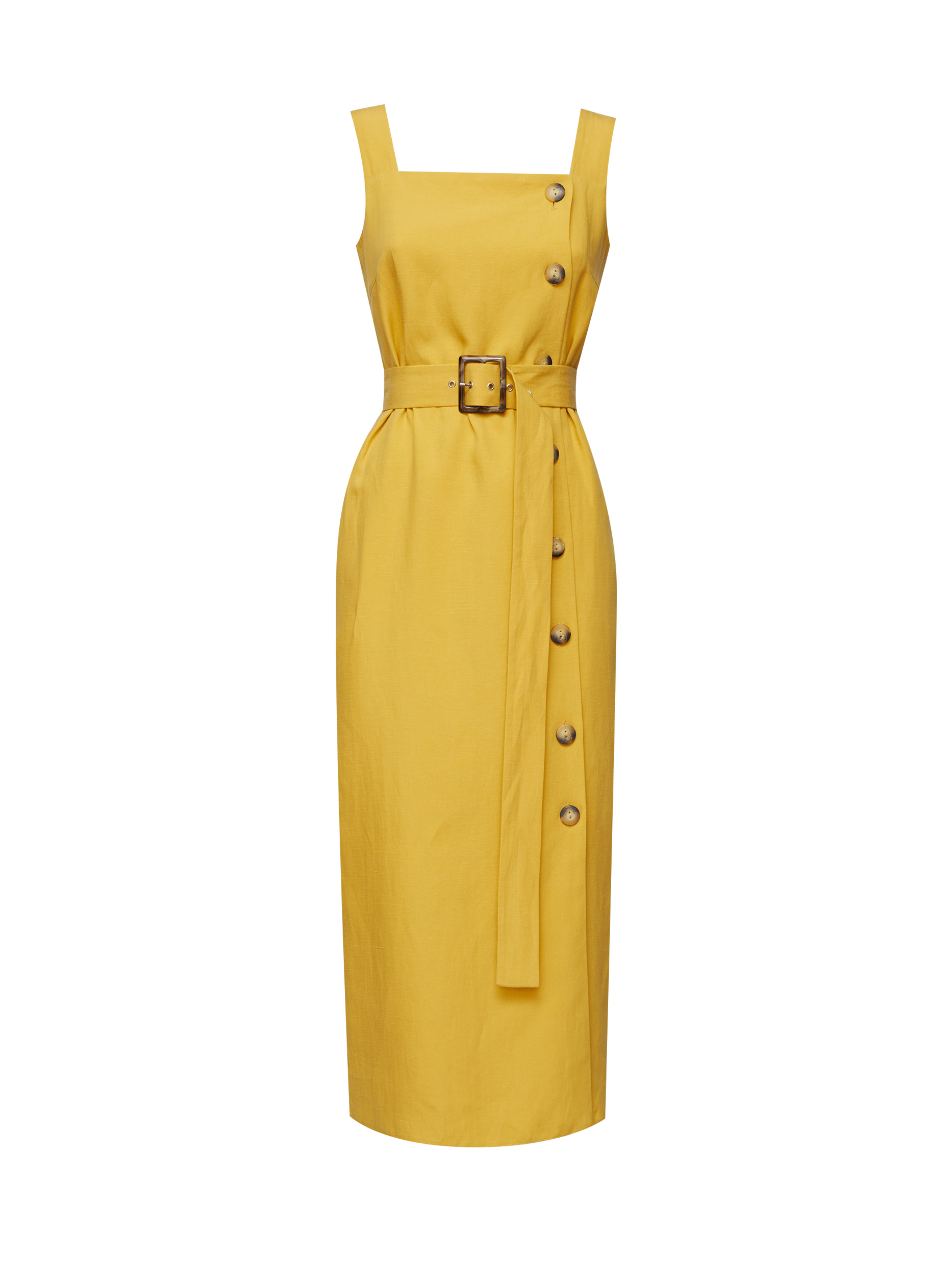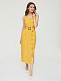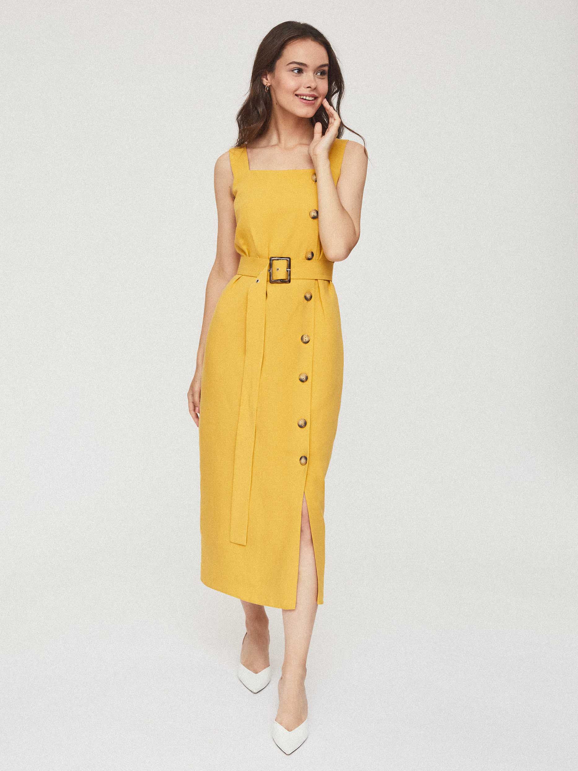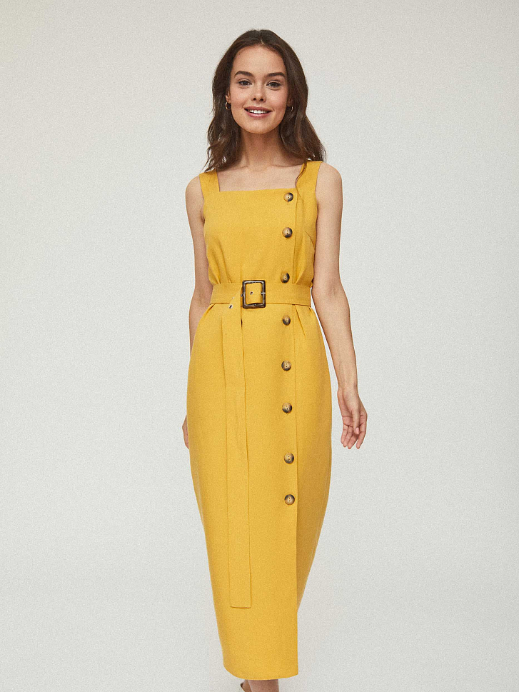 Однотонный сарафан длины миди из смесового льна. Прямой крой, широкие бретели, пояс из этой же ткани в комплекте.
