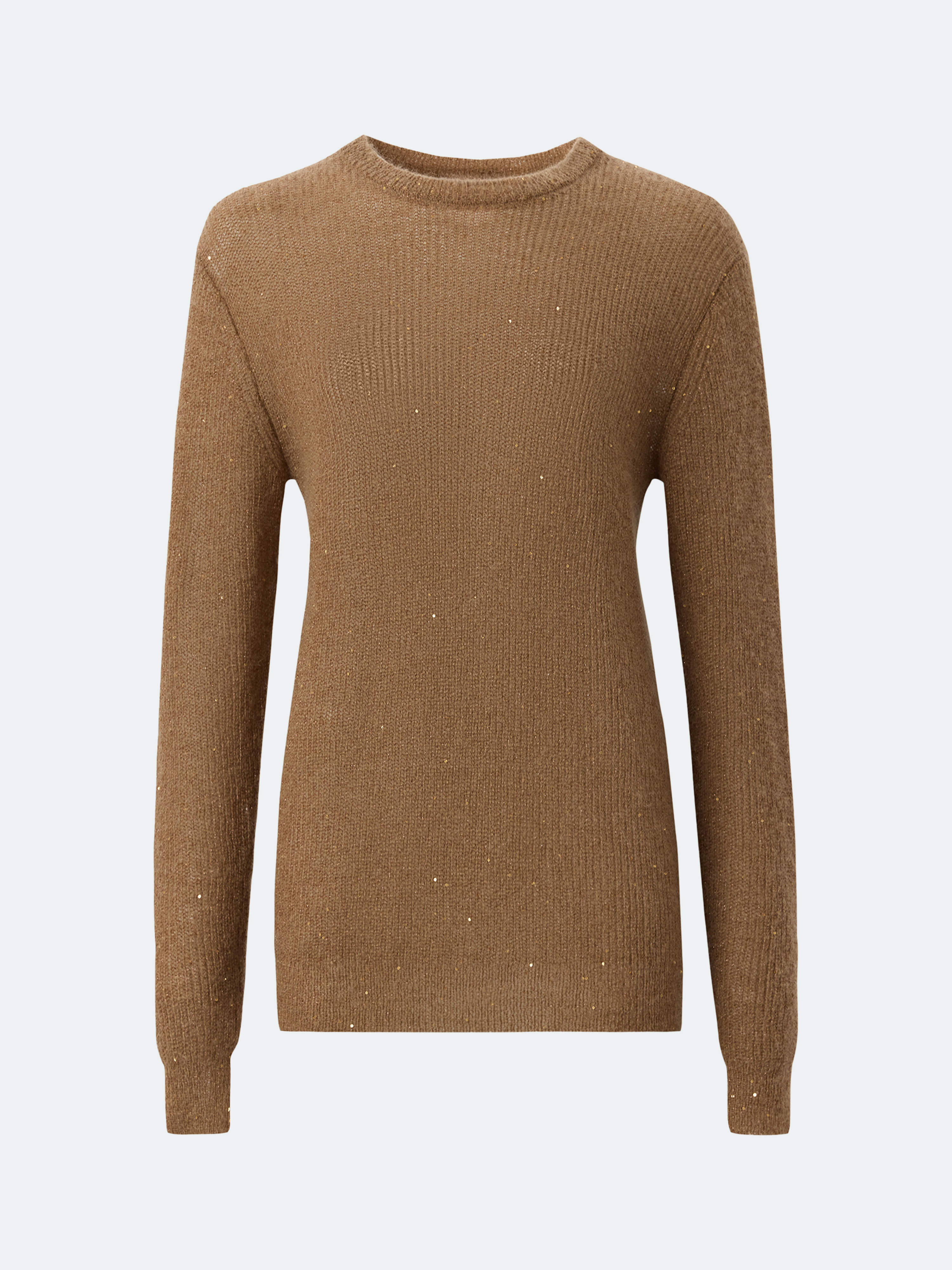Вязаный джемпер поможет в создании множества эффектных сочетаний – пайетки автоматически сделают образ праздничным. Пушистую модель связали из мягкой пряжи с содержанием шерсти и мохера, которые комфортно прилегают и согревают.