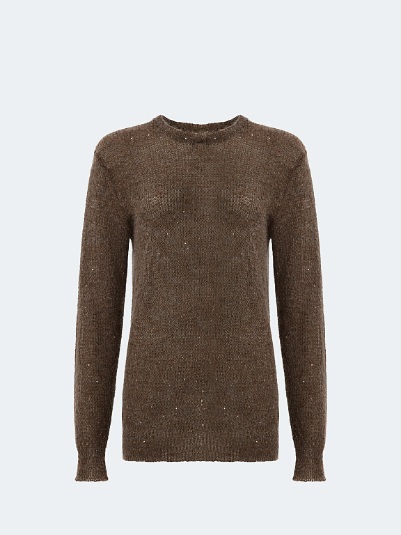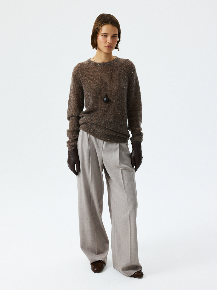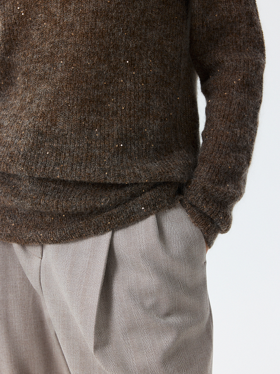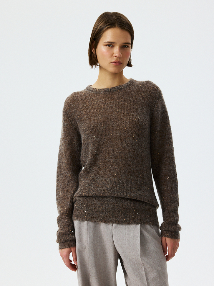 Вязаный джемпер поможет в создании множества эффектных сочетаний – пайетки автоматически сделают образ праздничным. Пушистую модель связали из мягкой пряжи с содержанием шерсти и мохера, которые комфортно прилегают и согревают.