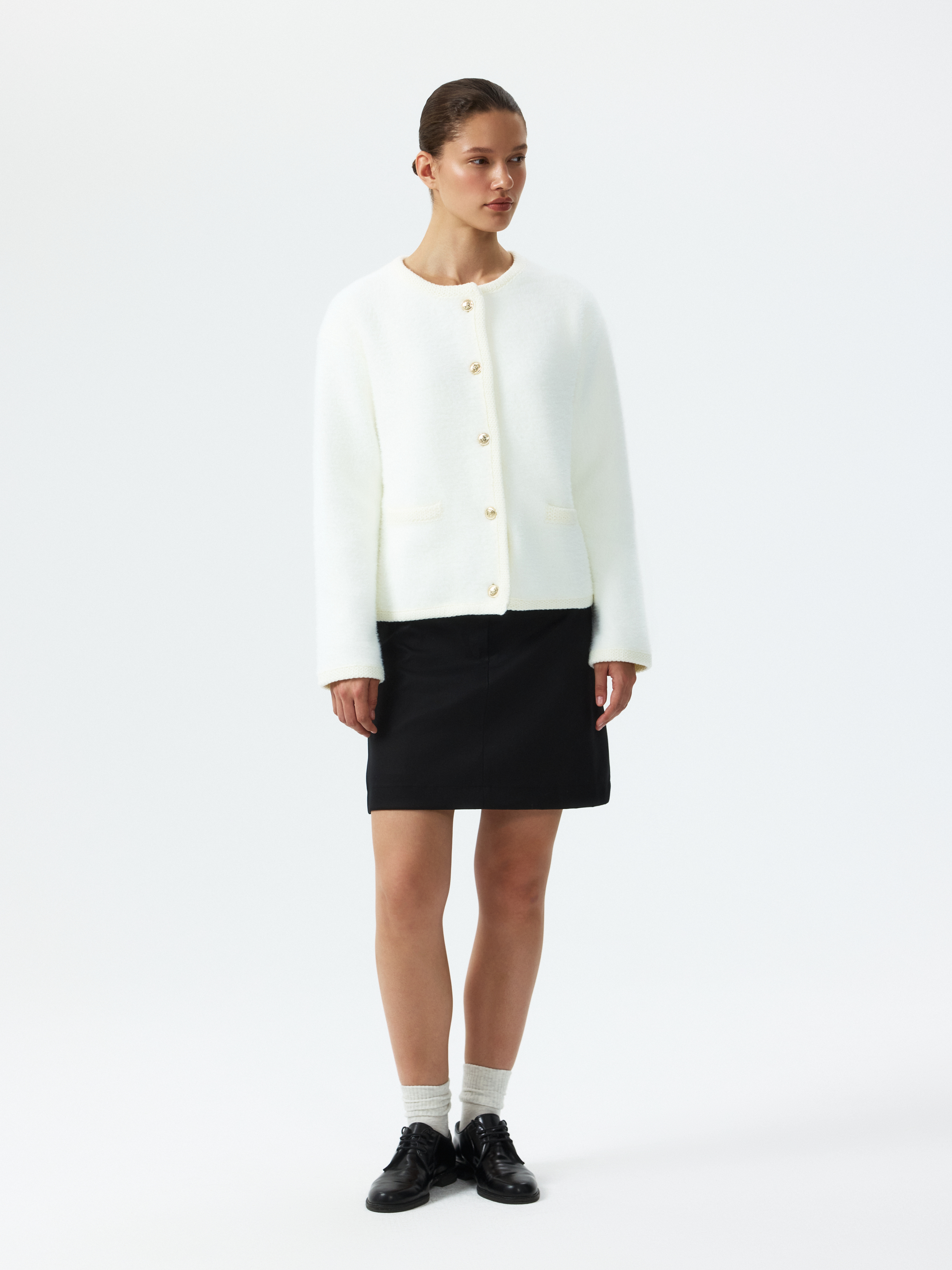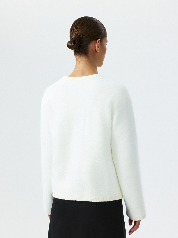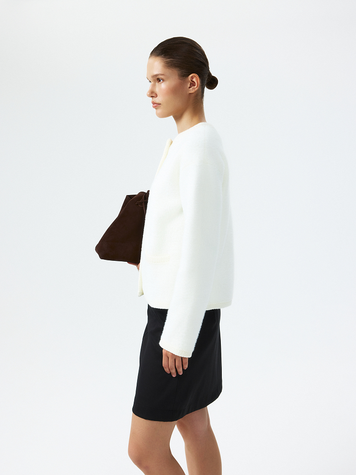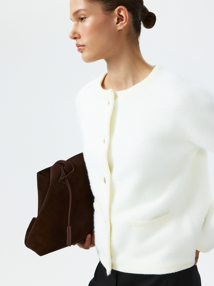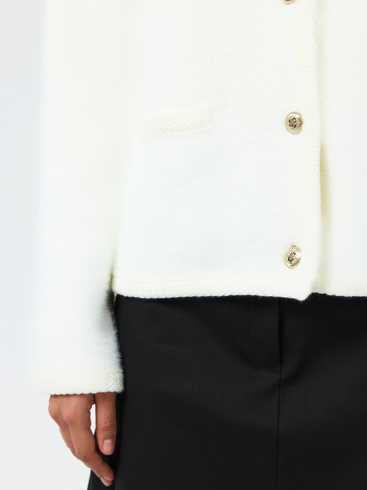 Прямой кардиган с круглым вырезом будет выделяться среди аналогов за счет пушистой фактуры. Металлические пуговицы и ажурная окантовка добавляют акценты. Плотный ворсистый трикотаж тактильно приятный на ощупь и при этом согревающий. Модель уместна и в зимний сезон, и в прохладный летний вечер.
