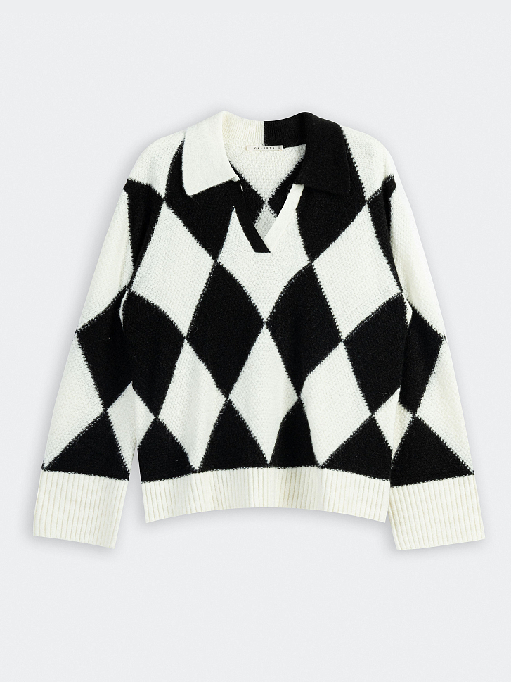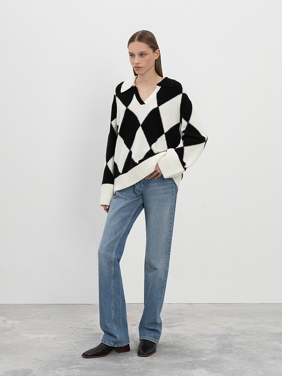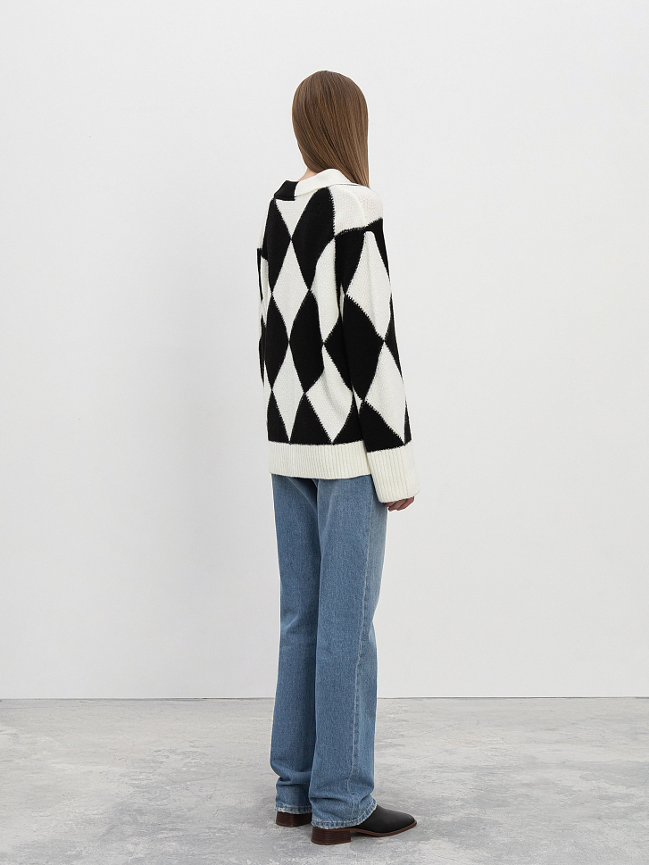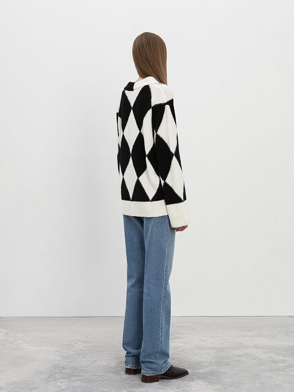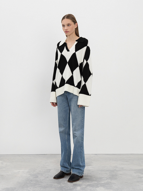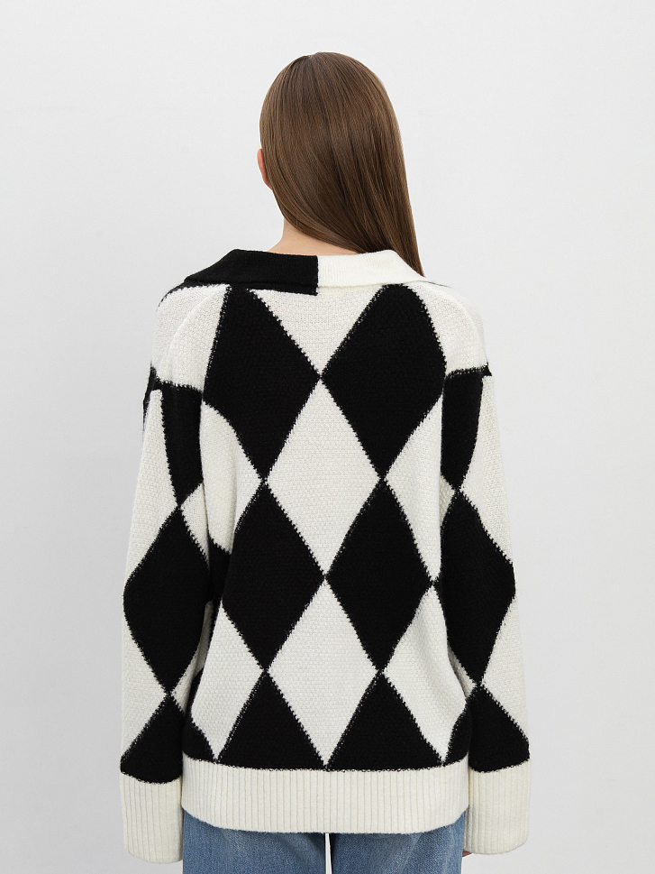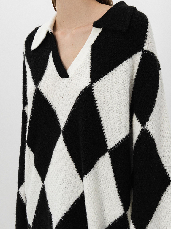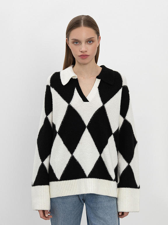 Пуловер, стилизованный под поло, приятно освежит строгий офисный гардероб. Узор из ромбов, расположенных в шахматном порядке и свободный силуэт придают образу расслабленности.  Изделие с удлиненными рукавами обеспечит защиту от холода и легко дополнит образ с широкими брюками или джинсами. Для изготовления модели использовали шерсть альпаки.