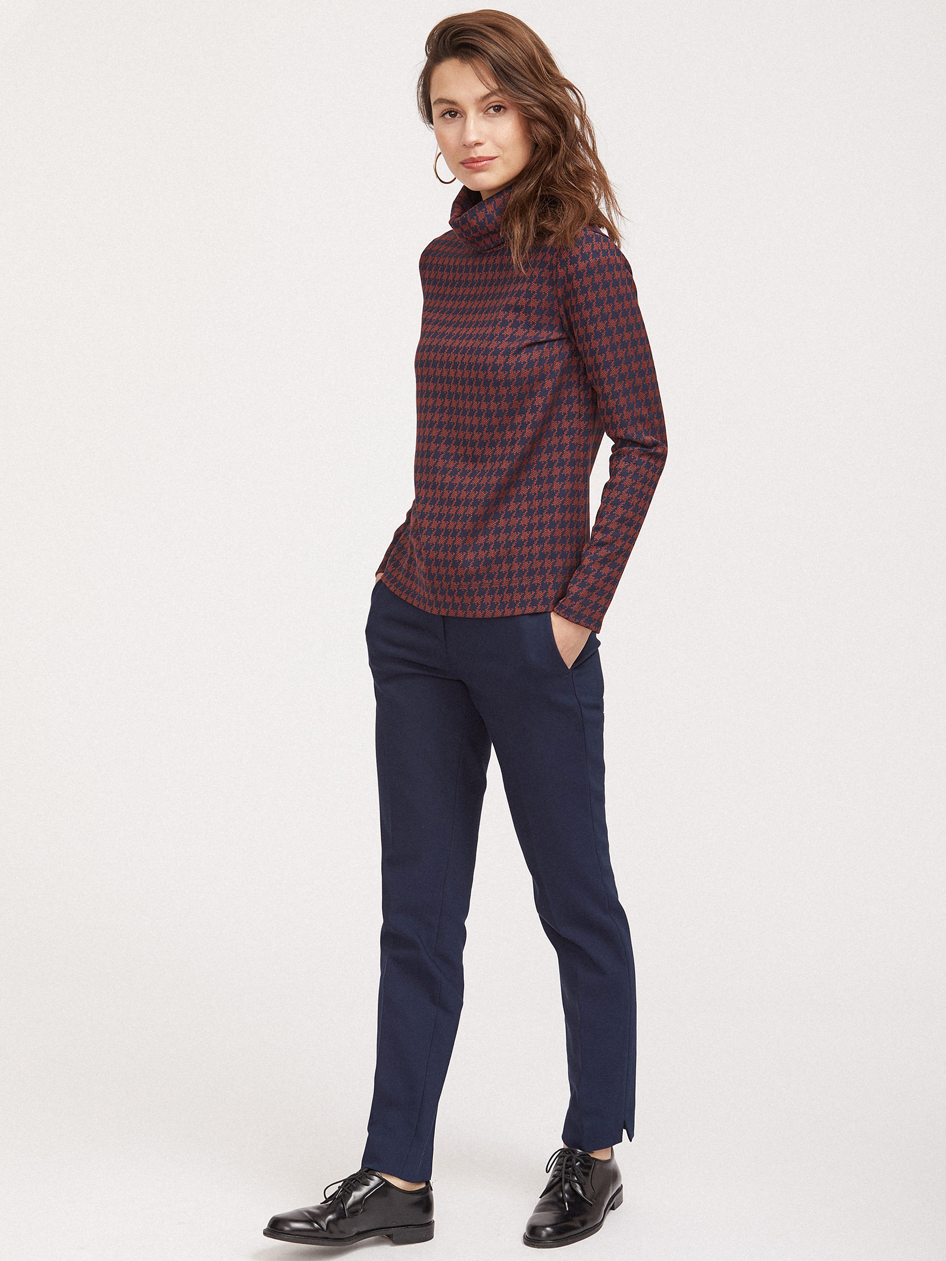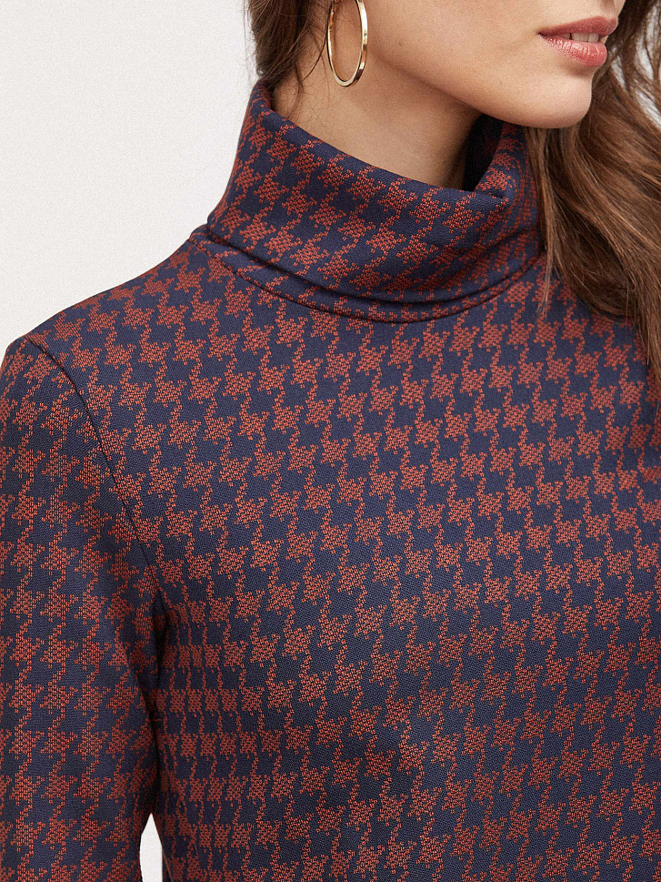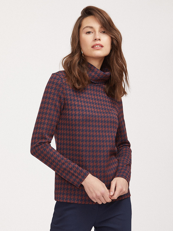 Джемпер свободного силуэта, выполненный из плотного трикотажа. Высокий широкий воротник, длинные рукава, принт «гусиная лапка».