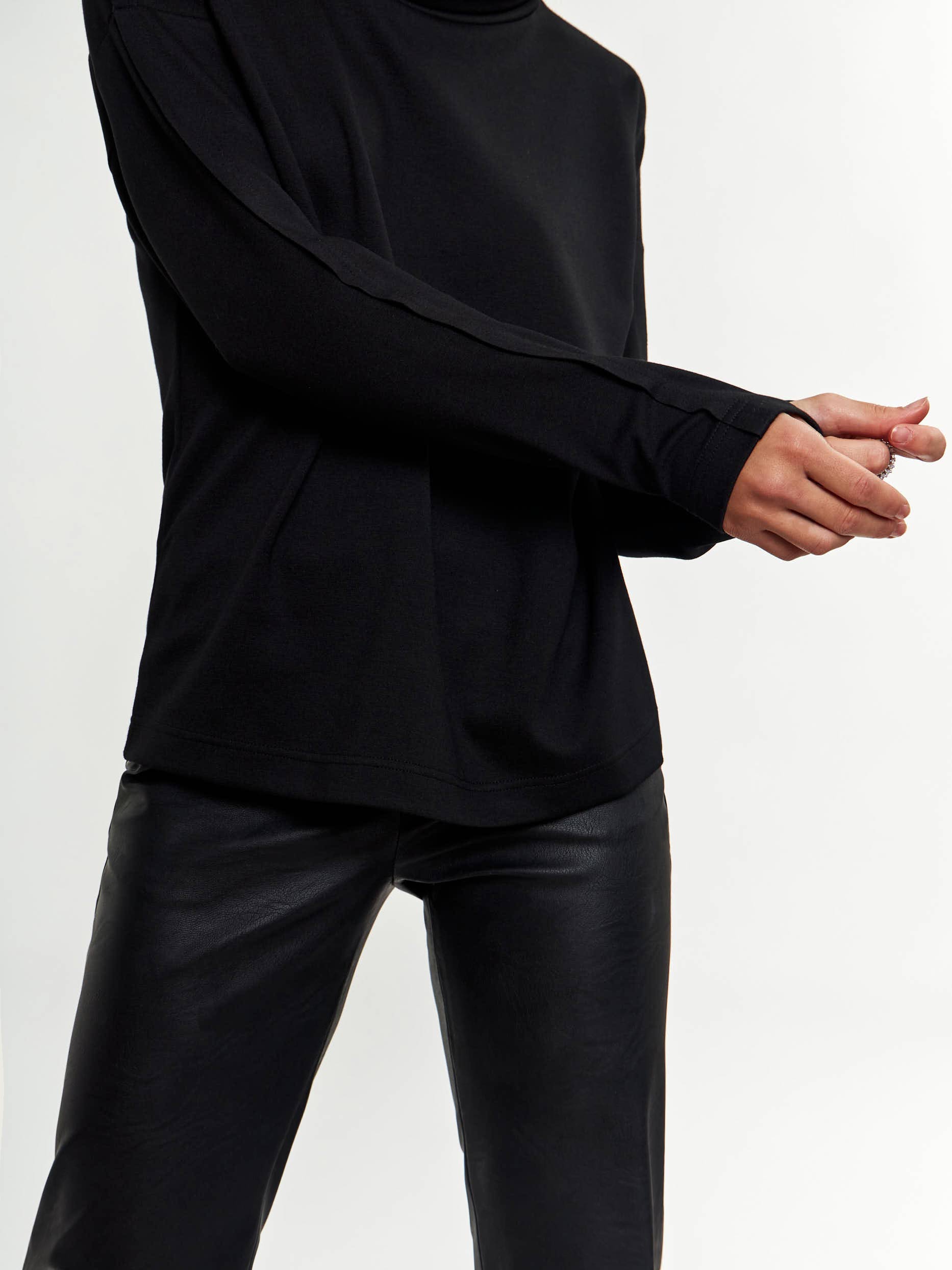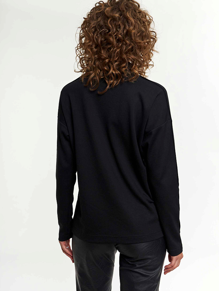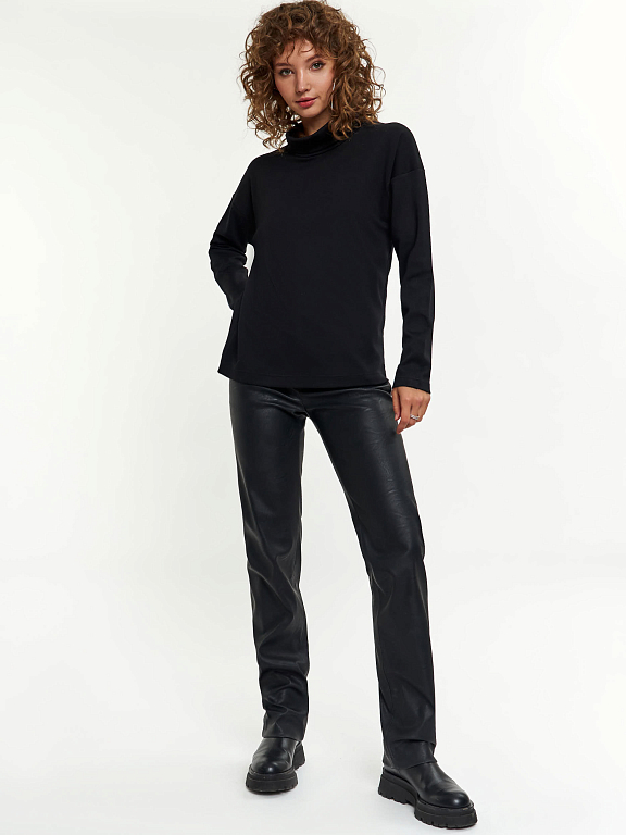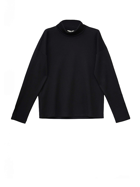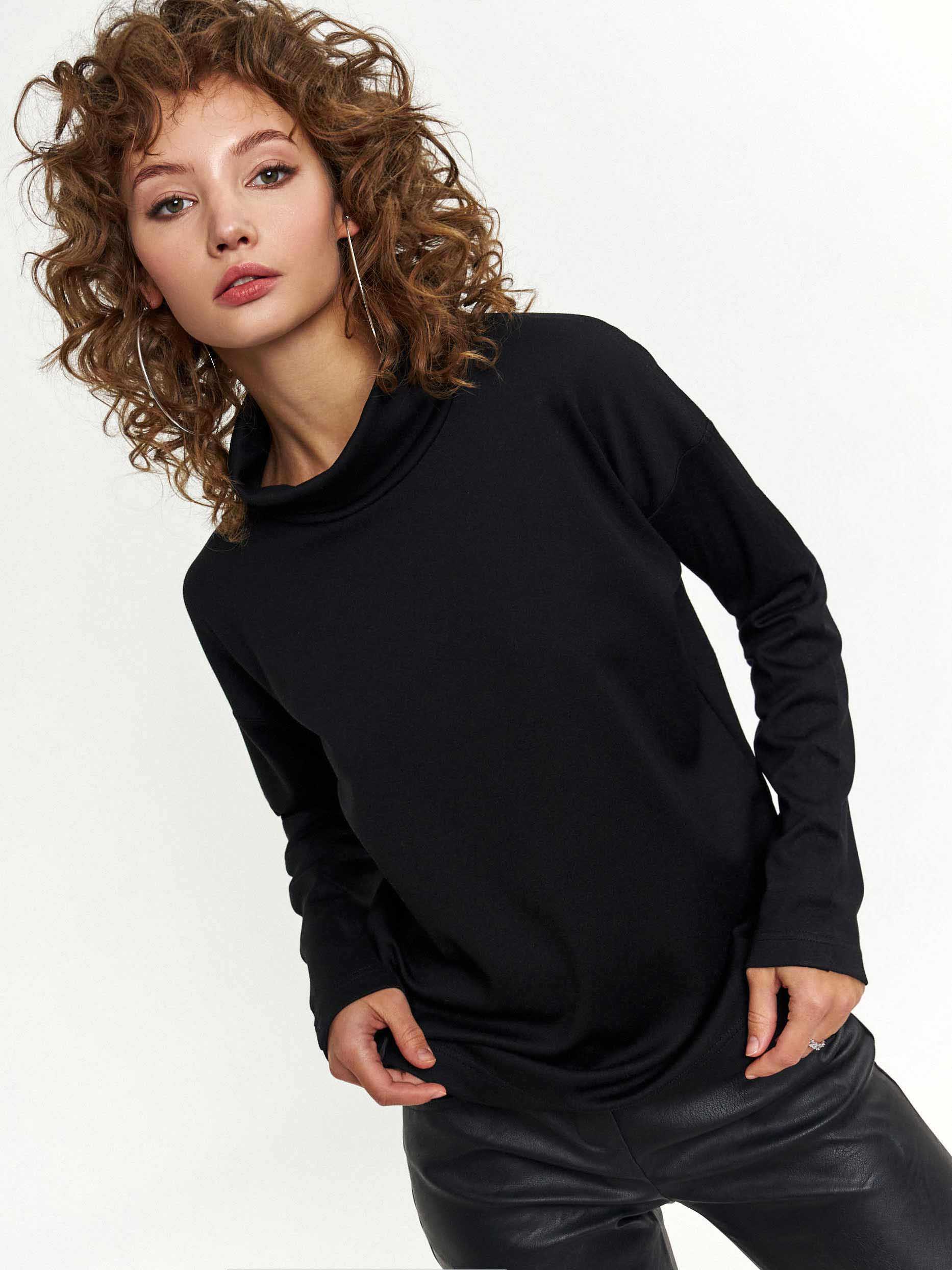 Однотонный джемпер из плотного трикотажа. Широкий крой, высокий воротник, спущенная линия плеч.