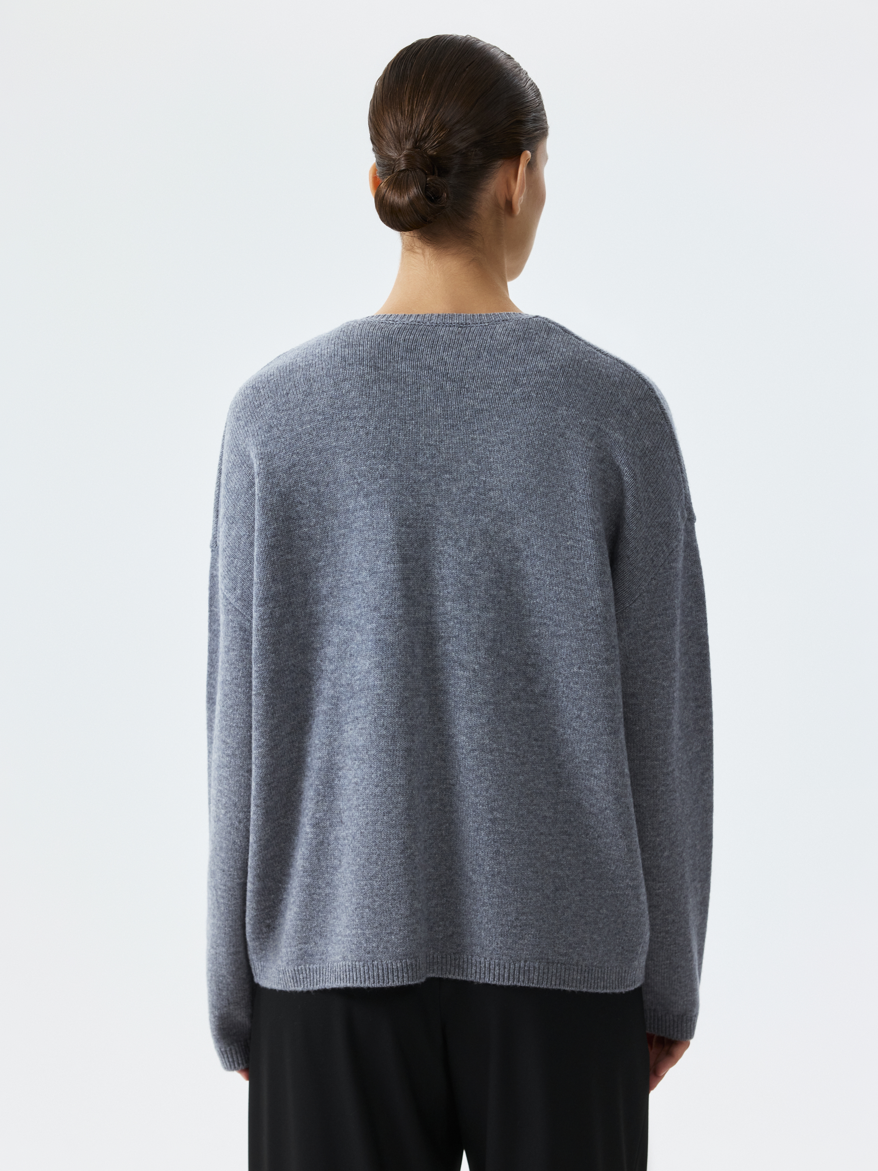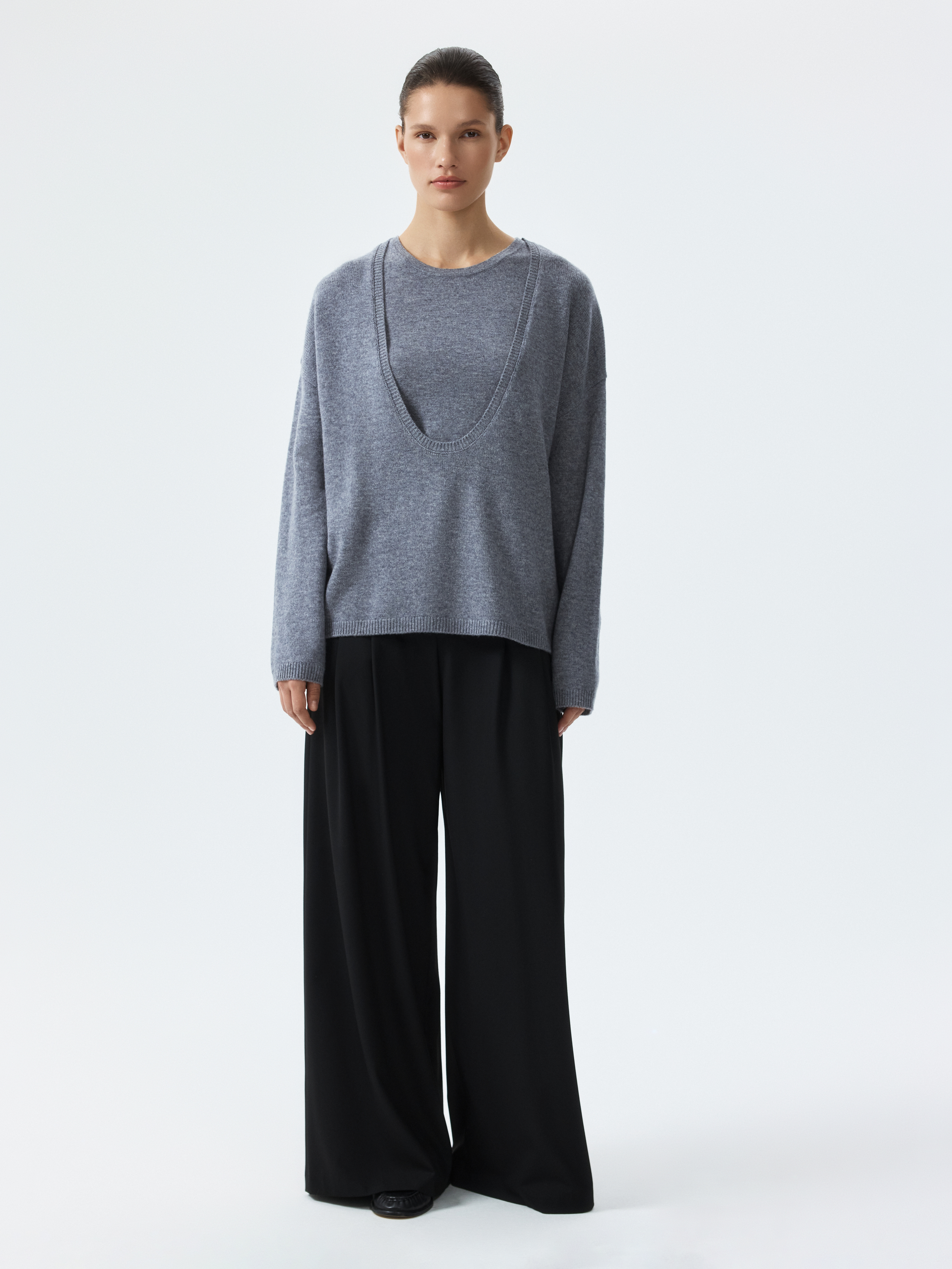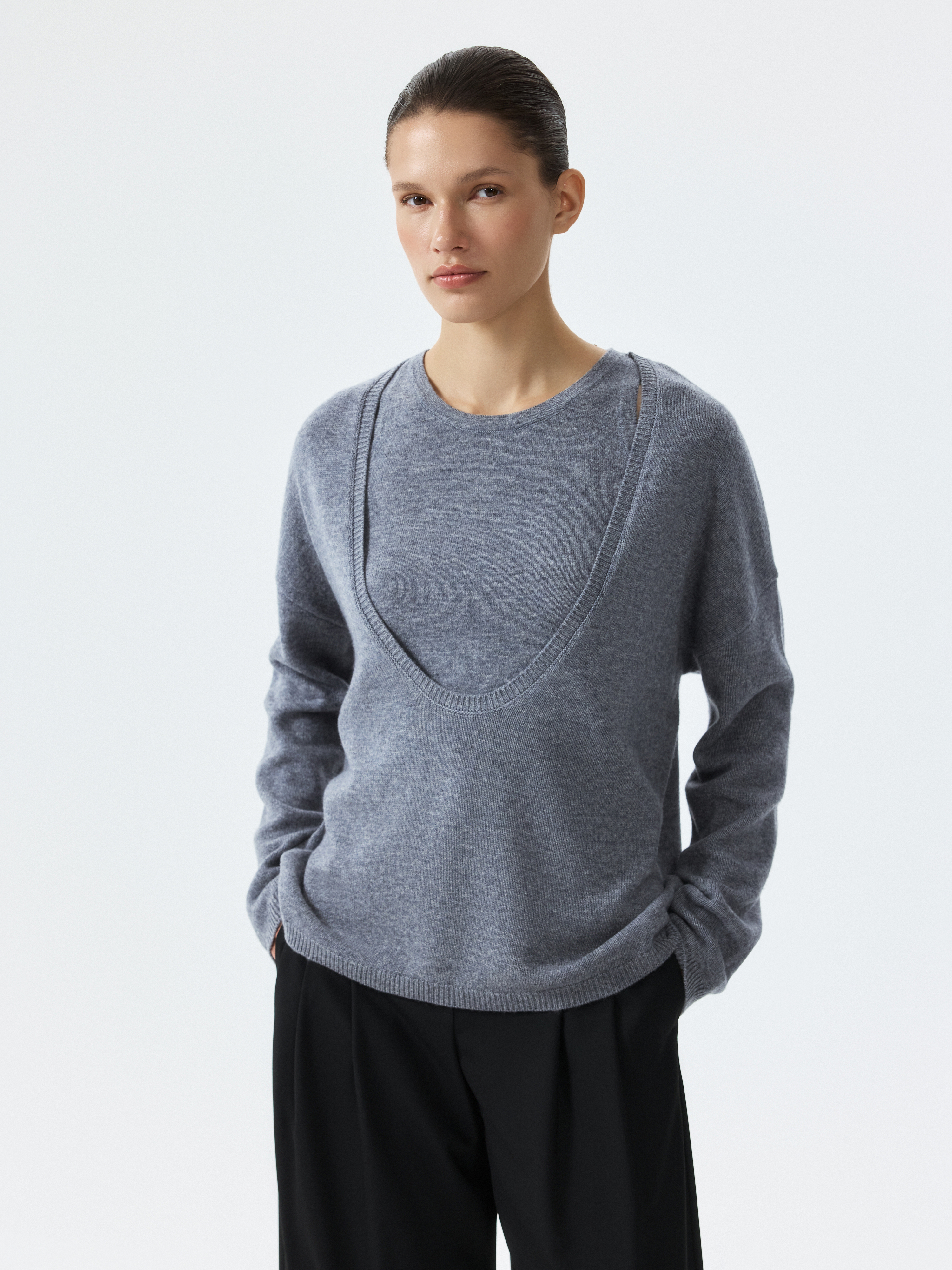 Вязаный джемпер оверсайз позволит наслаждать комфортным кроем и приятным материалом. Легкий трикотаж из мериносовой шерсти мягко прилегает к телу, деликатно согревая, и не колется. Джемпер с глубоким вырезом подходит для многослойных образов – снизу можно надеть комплектный топ или рубашку.
