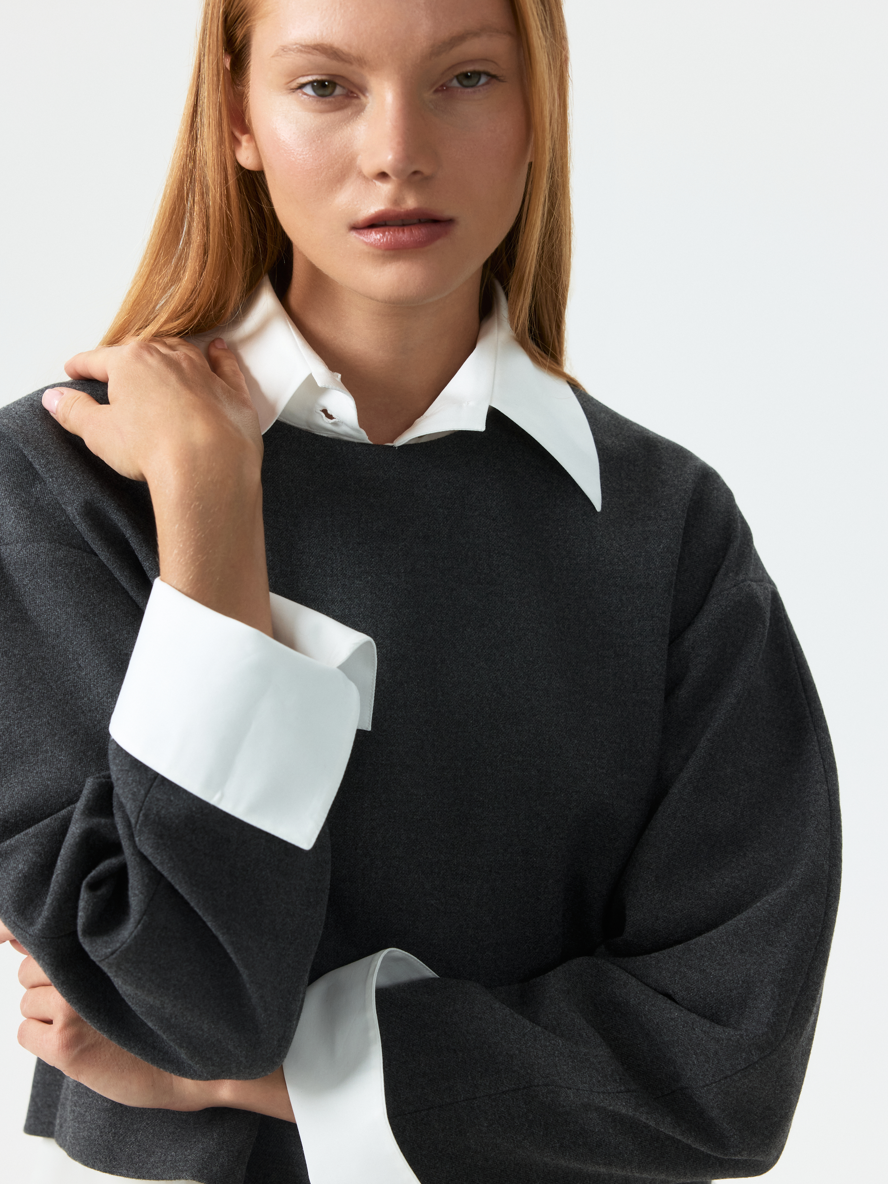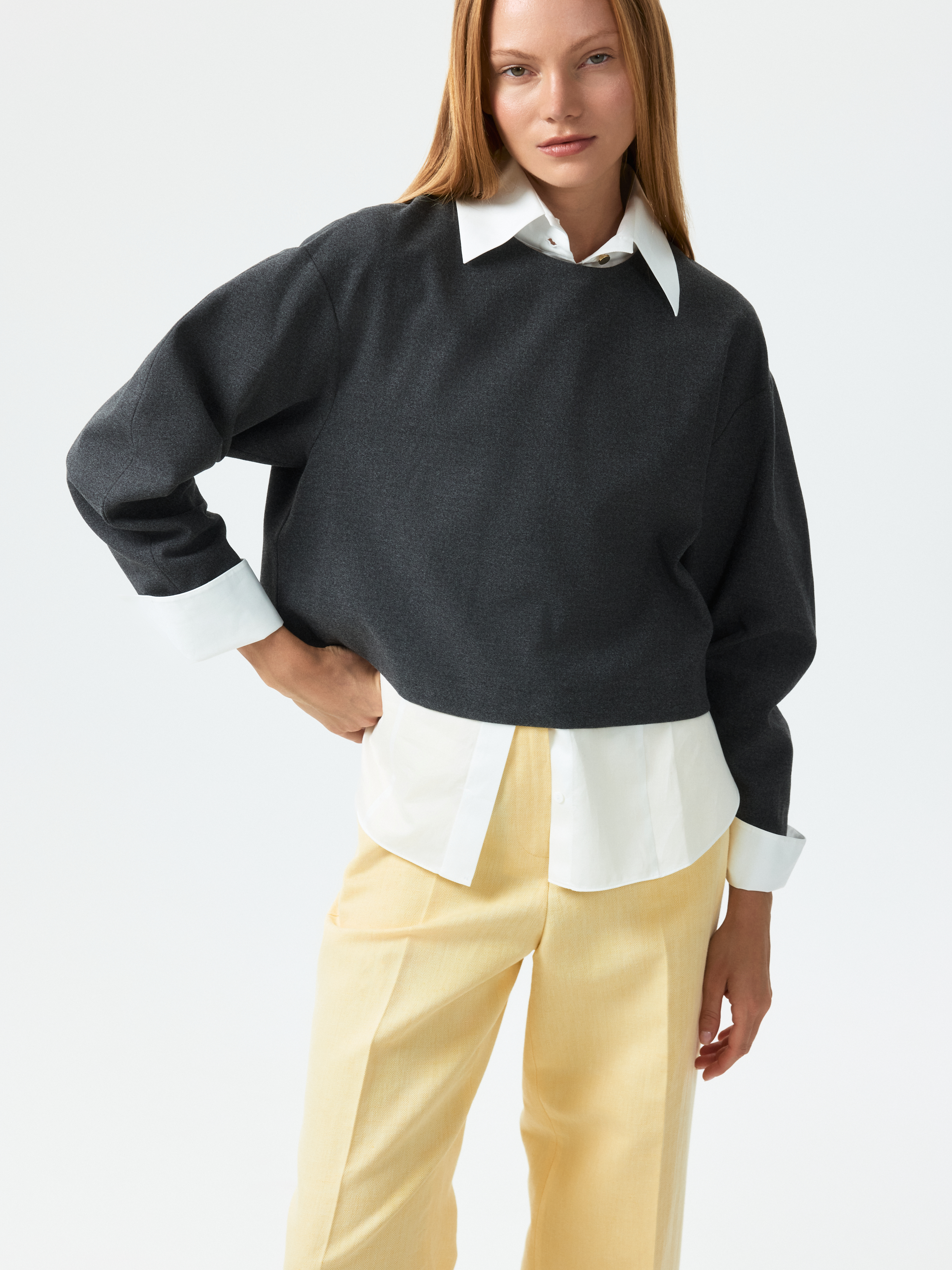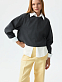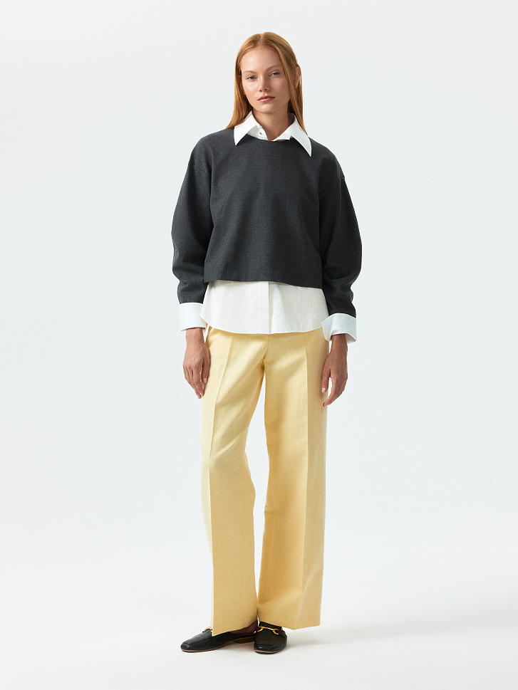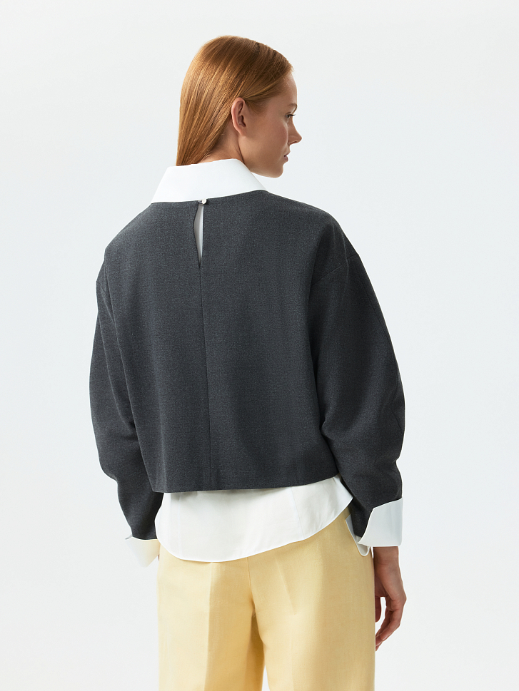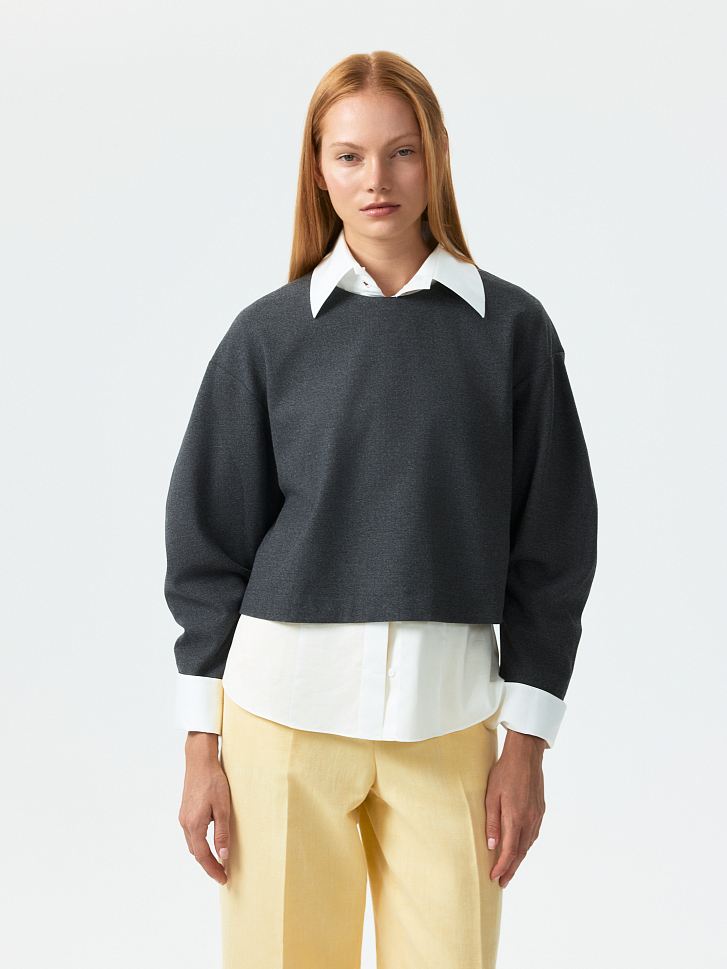 Спортивный характер укороченного свитшота компенсируется костюмным материалом. Плотный текстиль из поливискозы не тянется и хорошо держит форму, а благодаря мягкой внутренней отделке приятно прилегает к телу. Модель свободного кроя со спущенной линией плеча комфортно сидит по фигуре и не сковывает движения.