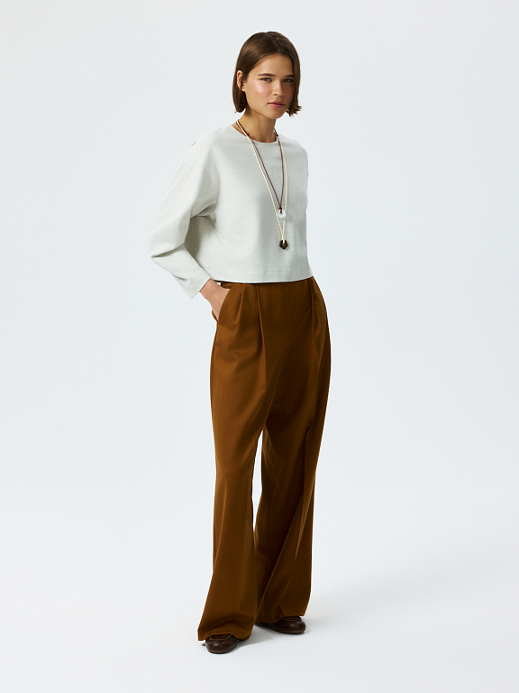 Спортивный характер укороченного свитшота компенсируется костюмным материалом. Плотный текстиль из поливискозы не тянется и хорошо держит форму, а благодаря мягкой внутренней отделке приятно прилегает к телу. Модель свободного кроя со спущенной линией плеча комфортно сидит по фигуре и не сковывает движения.