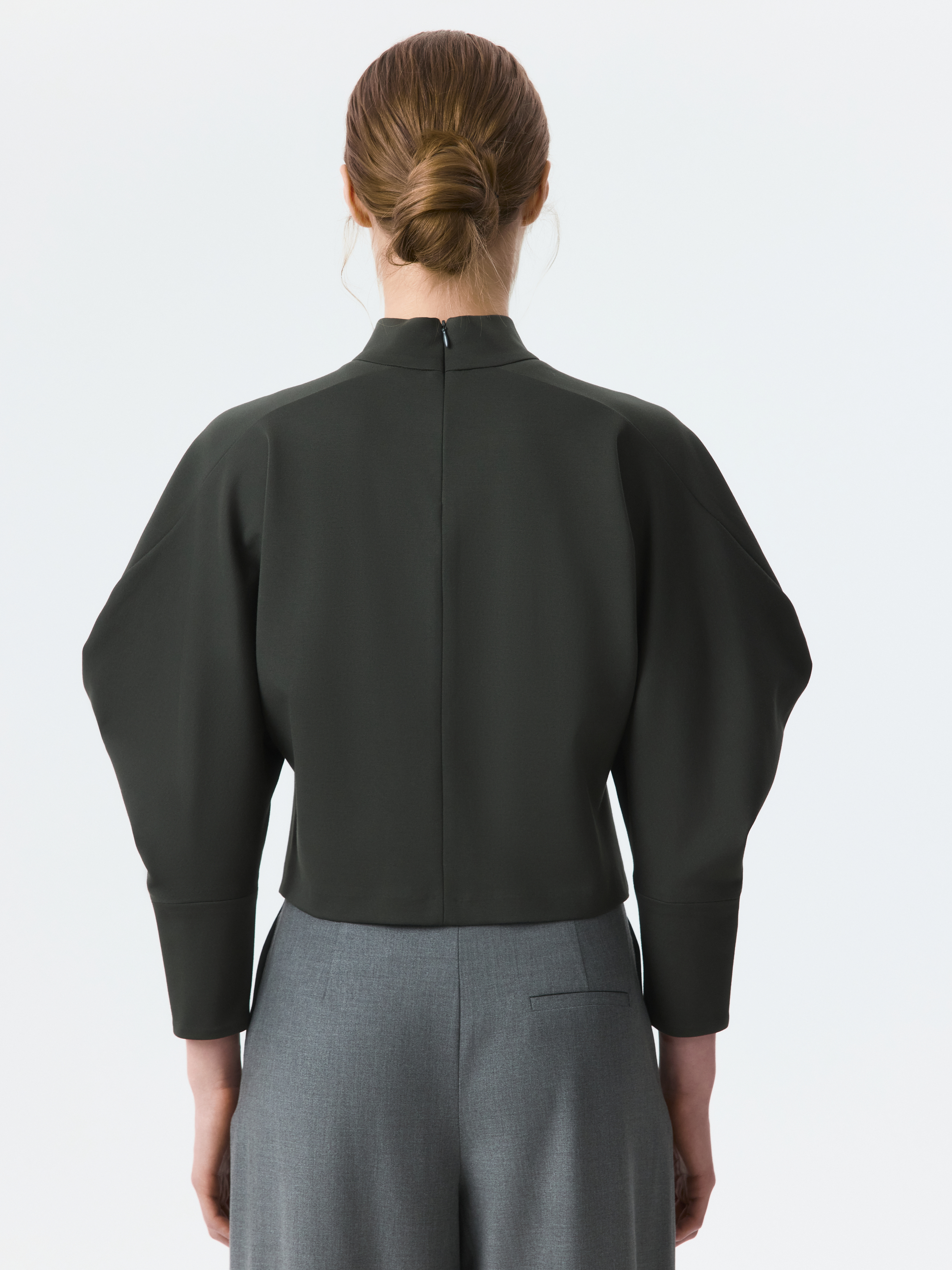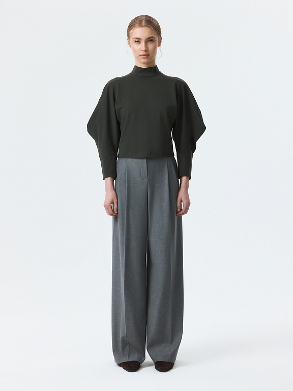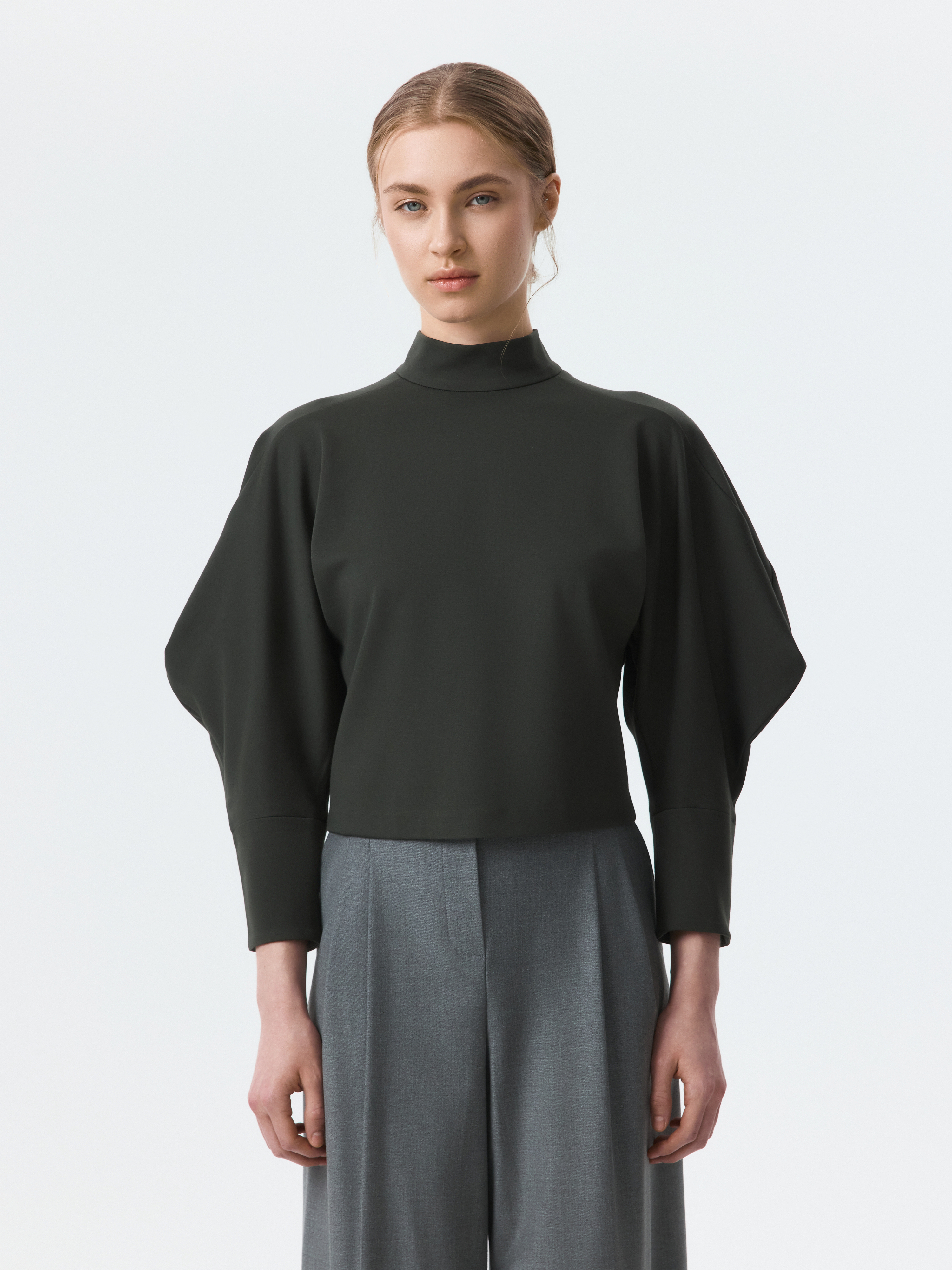 Укороченный лонгслив легко впишется в гардероб и станет универсальным решением на каждый день. Плотный гладкий трикотаж приятно прилегает к телу и хорошо тянется, не сковывая движения. Центральным акцентом модели выступают асимметричные рукава "летучая мышь" длиной ¾, которые создают объемный эффект.
