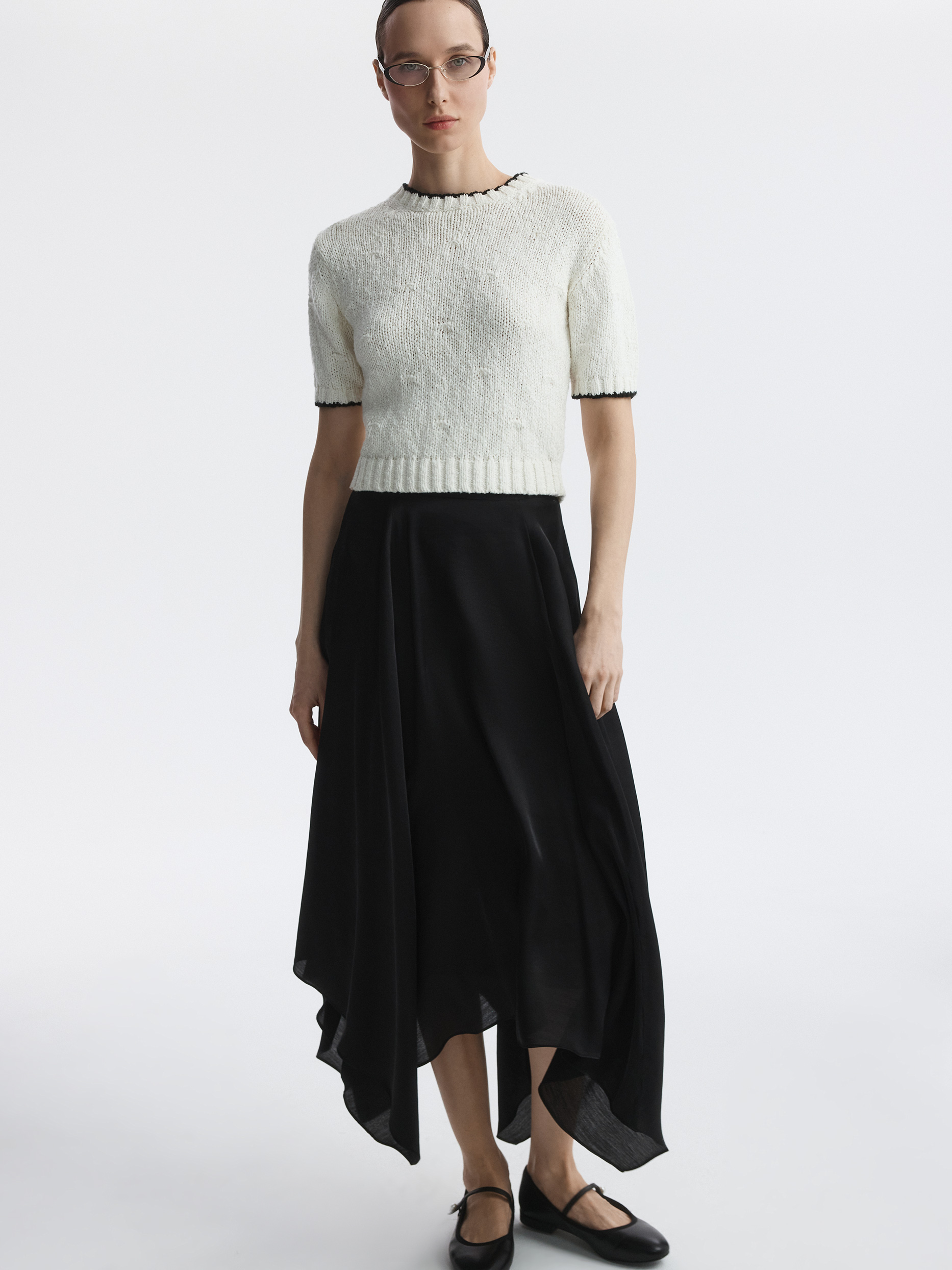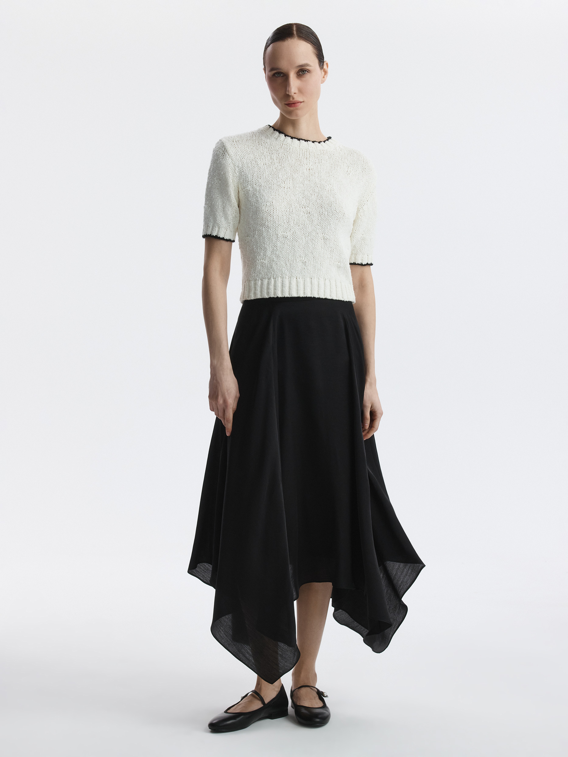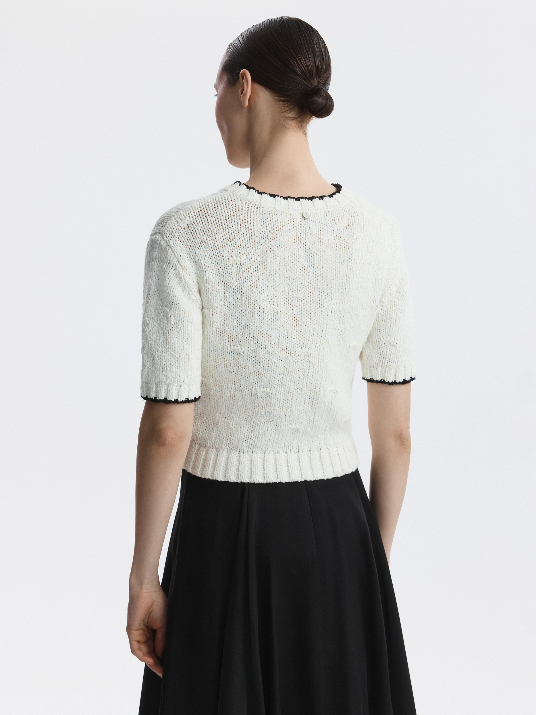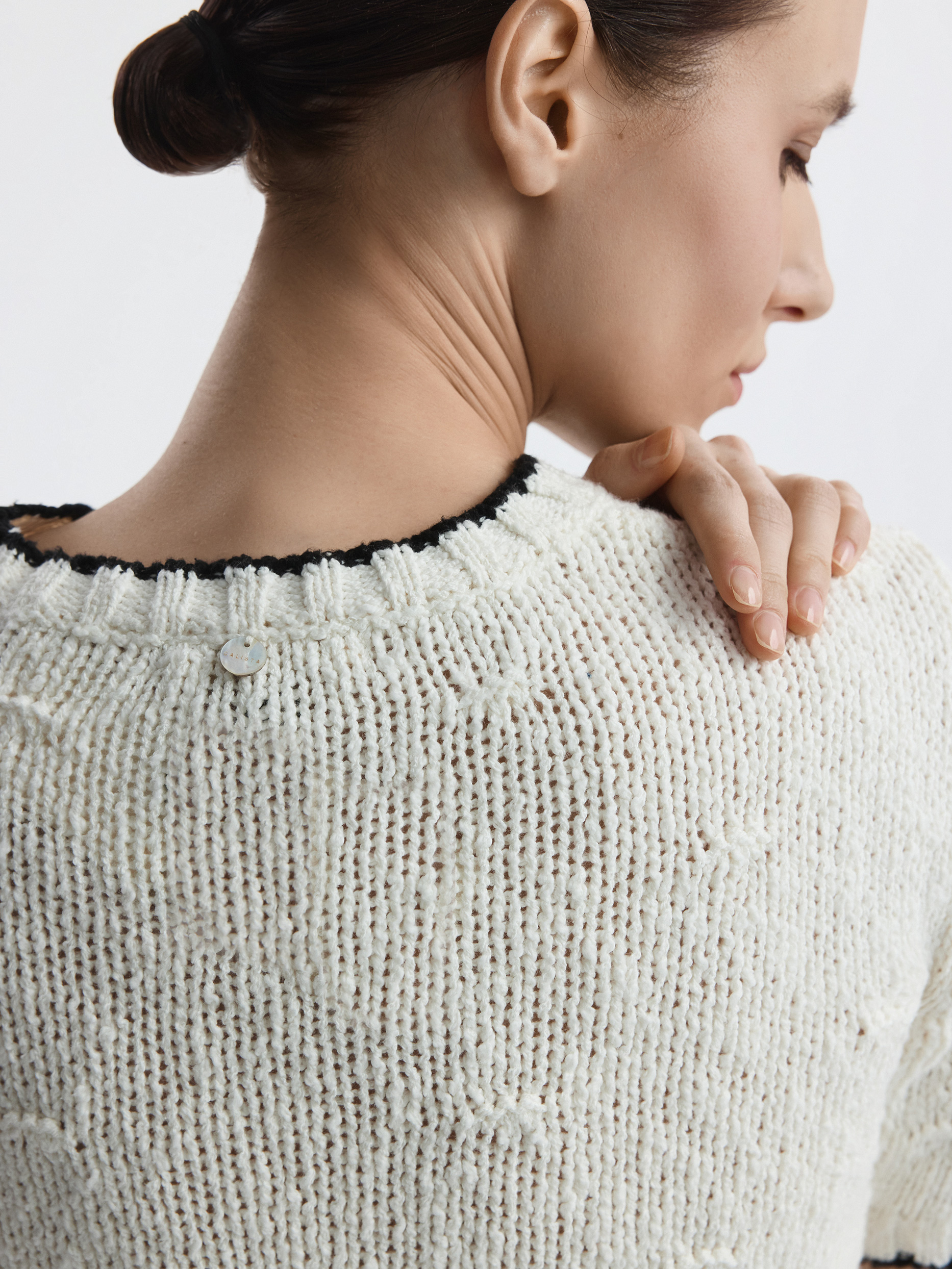 Джемпер с короткими рукавами станет альтернативой футболке в холодное время года. Фактурный трикотаж на основе хлопка комфортно прилегает к телу, а волокна акрила придают формоустойчивость. Модель прямого кроя с круглым вырезом имеет универсальный силуэт.