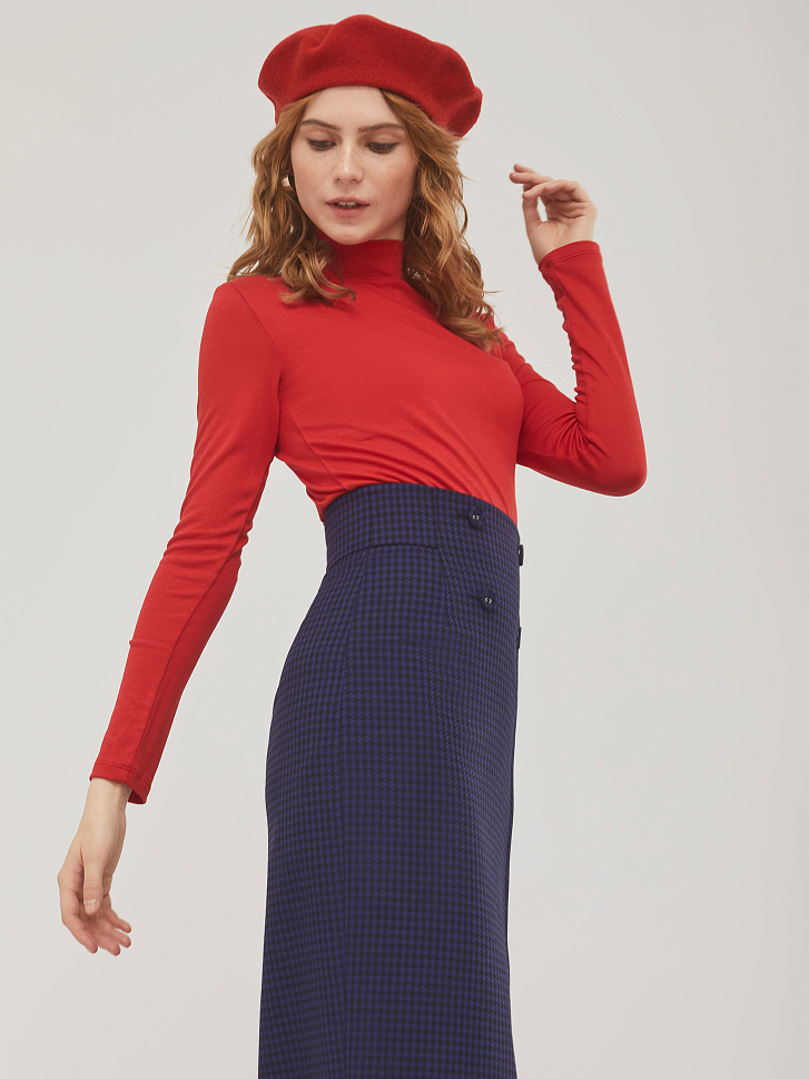 Однотонный джемпер из вискозы облегающего силуэта с воротником "стойка" и длинными рукавами. Изделие без подкладки.  Рост модели 173 см, размер 42 (российский). Плотность ткани: 240 г/м2