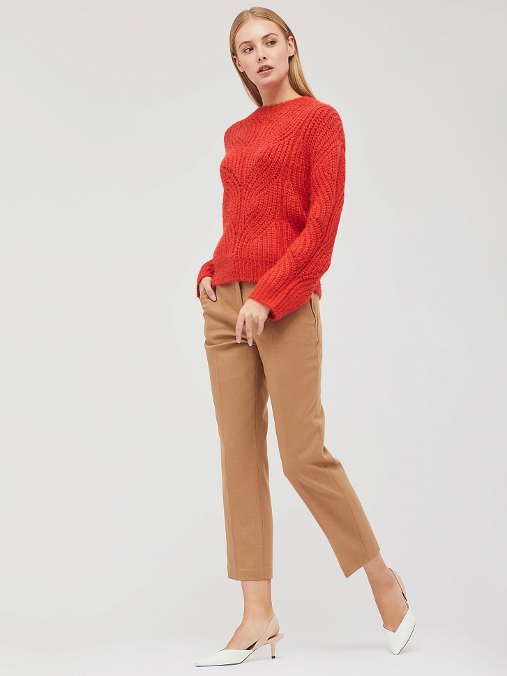 Свитер приталенного кроя крупной вязки. Округлый вырез, спущенная линия плеч, свободные рукава.