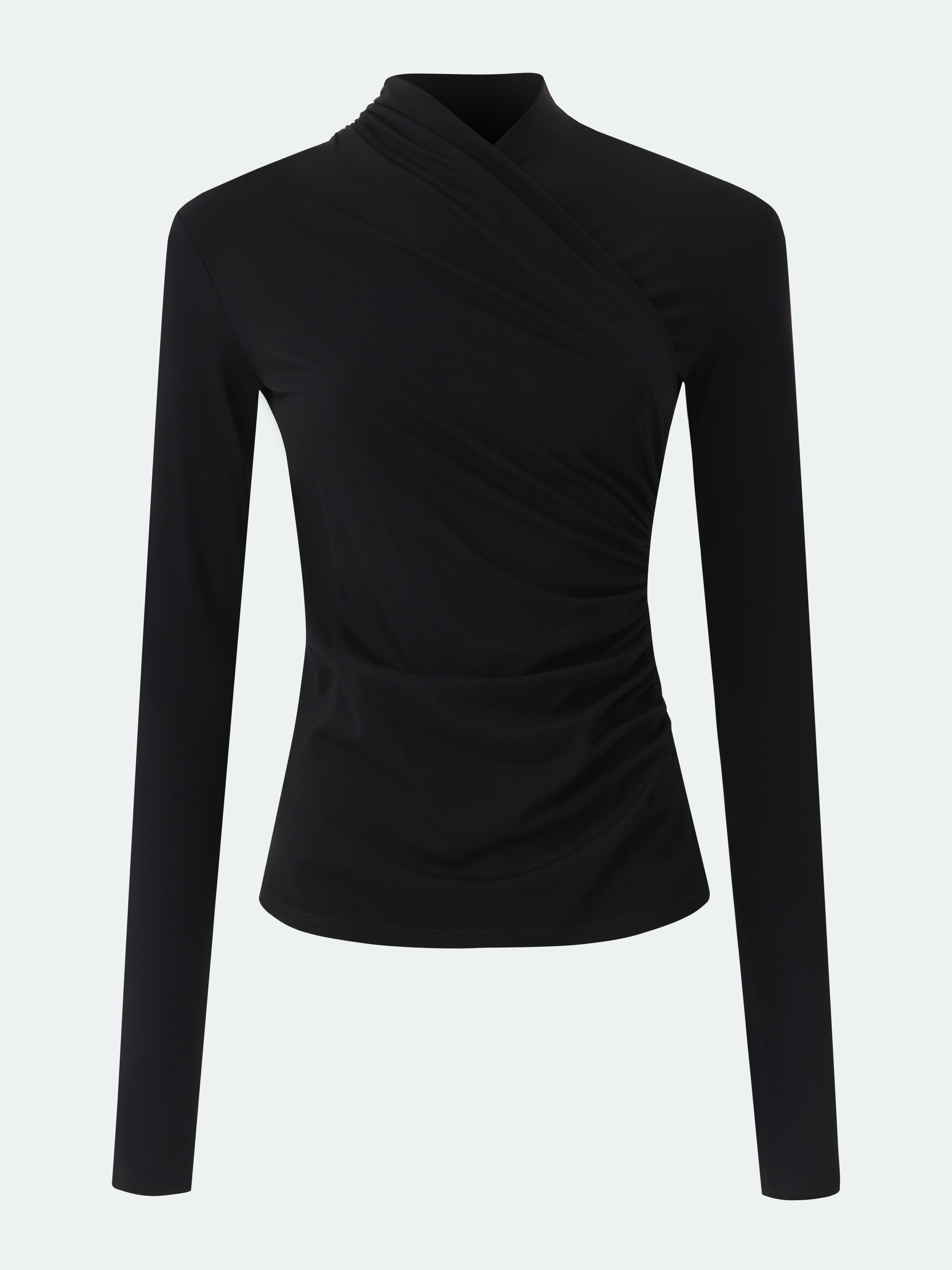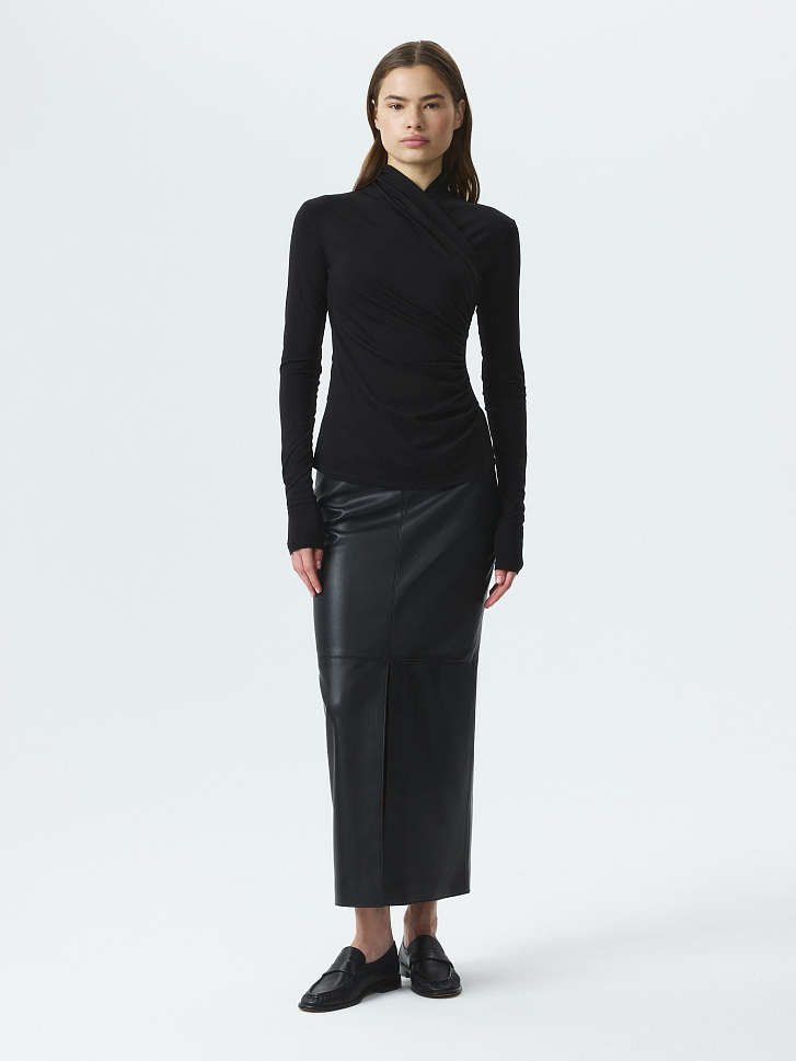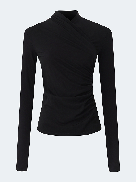 Приталенный лонгслив на запах станет стильной альтернативой базовым моделям. Легкий гладкий трикотаж с эффектом лайкры приятно прилегает к телу и хорошо тянется, не сковывая движения. Центральным акцентом модели выступают изящные драпировки, которые придают фактурности.