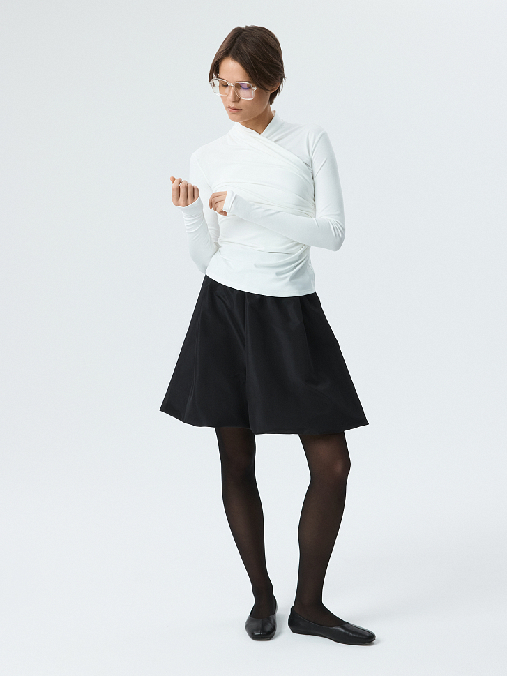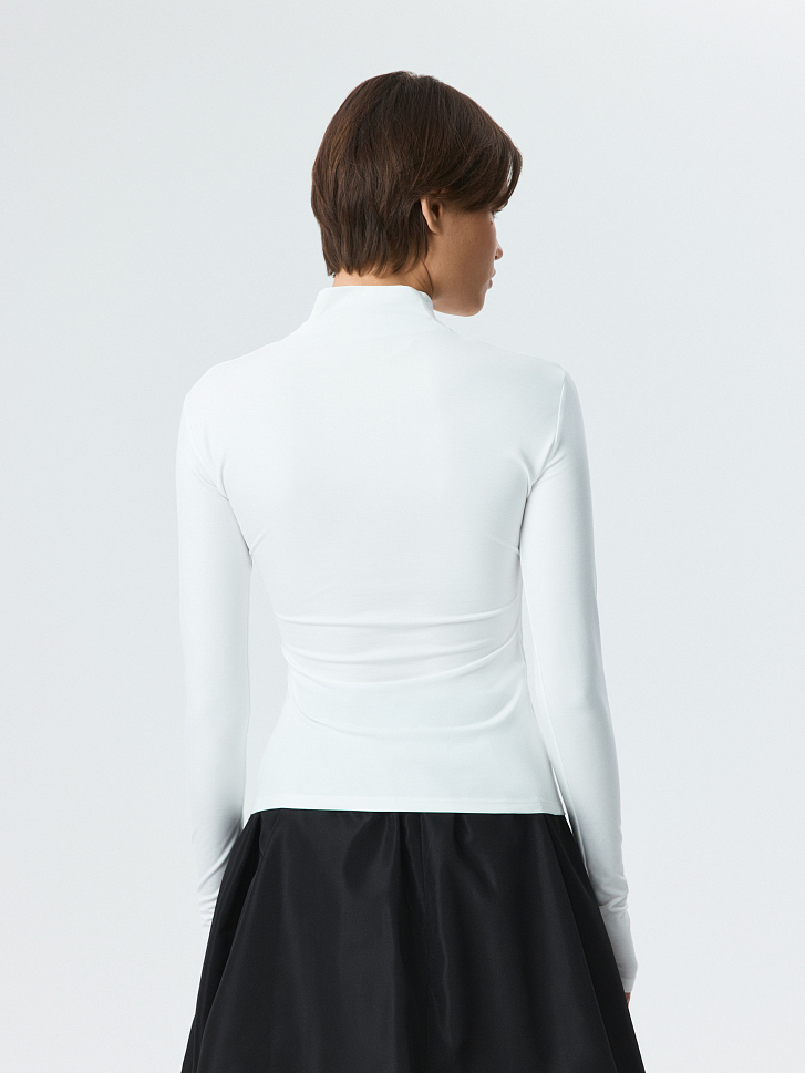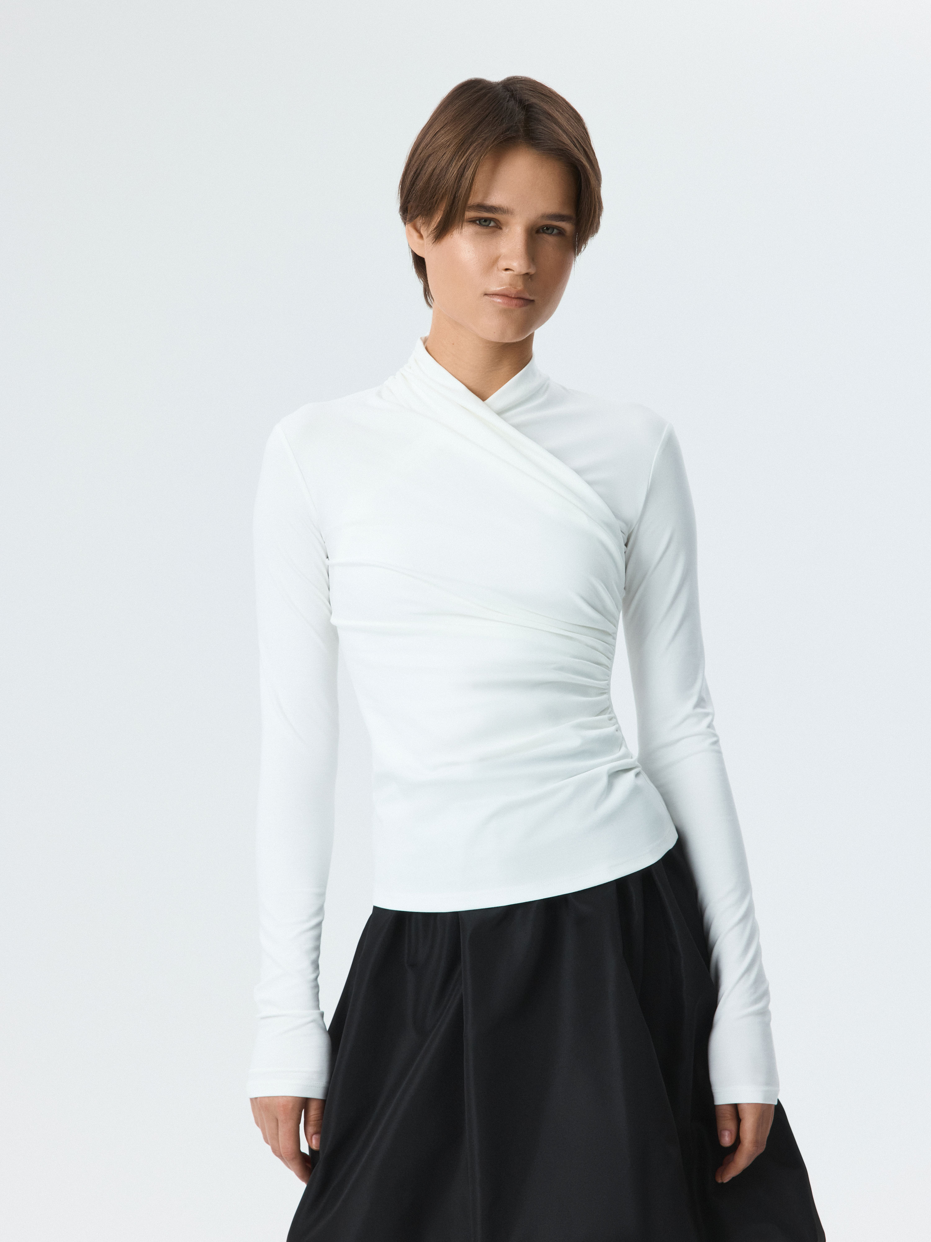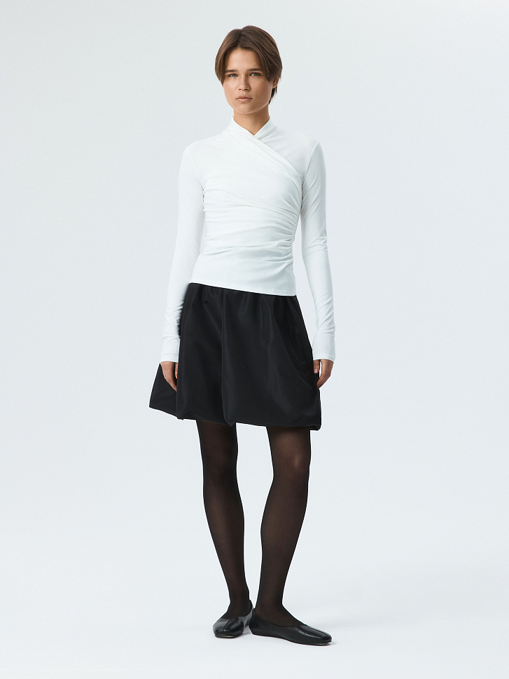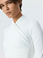Приталенный лонгслив на запах станет стильной альтернативой базовым моделям. Легкий гладкий трикотаж с эффектом лайкры приятно прилегает к телу и хорошо тянется, не сковывая движения. Центральным акцентом модели выступают изящные драпировки, которые придают фактурности.