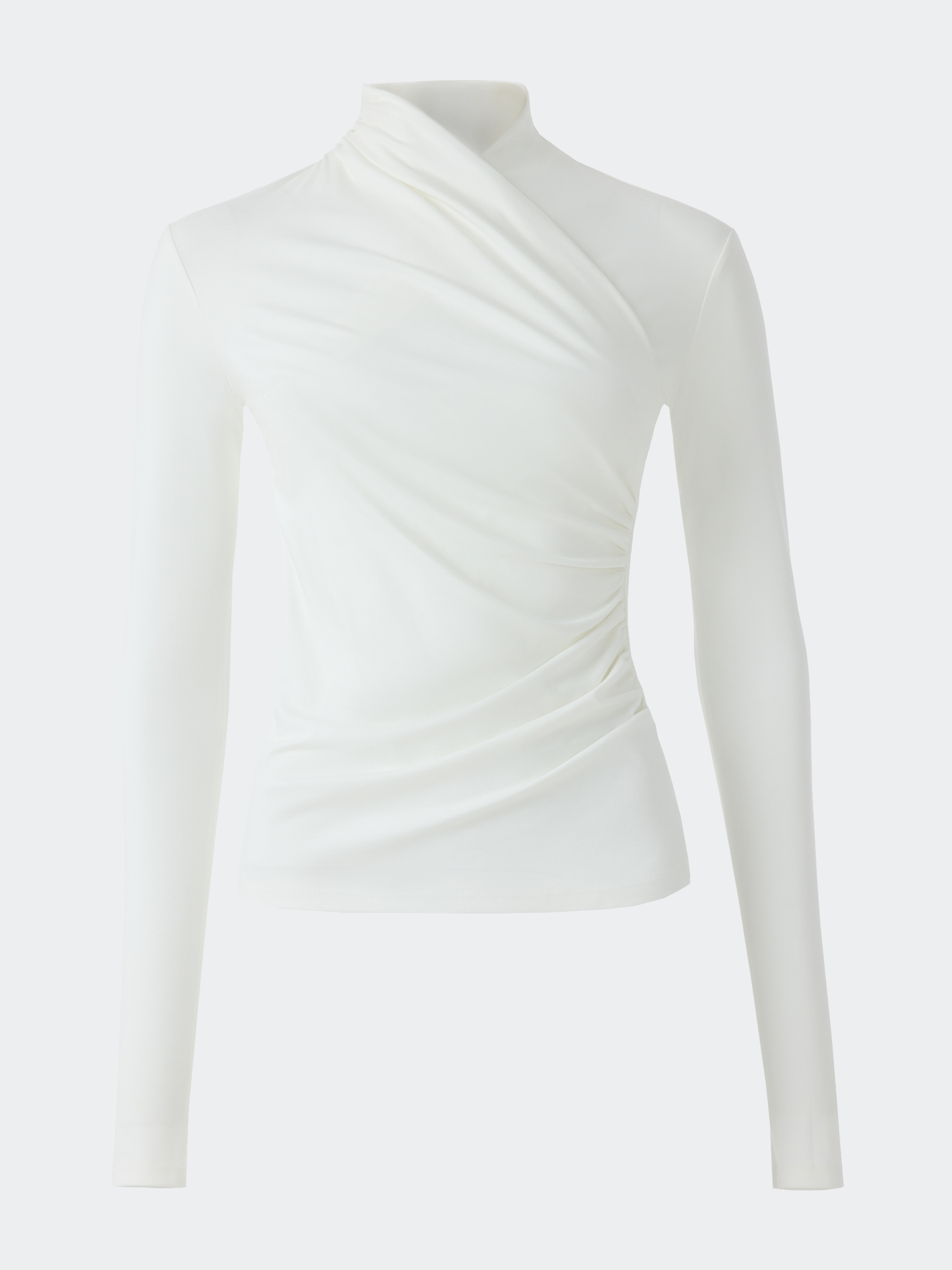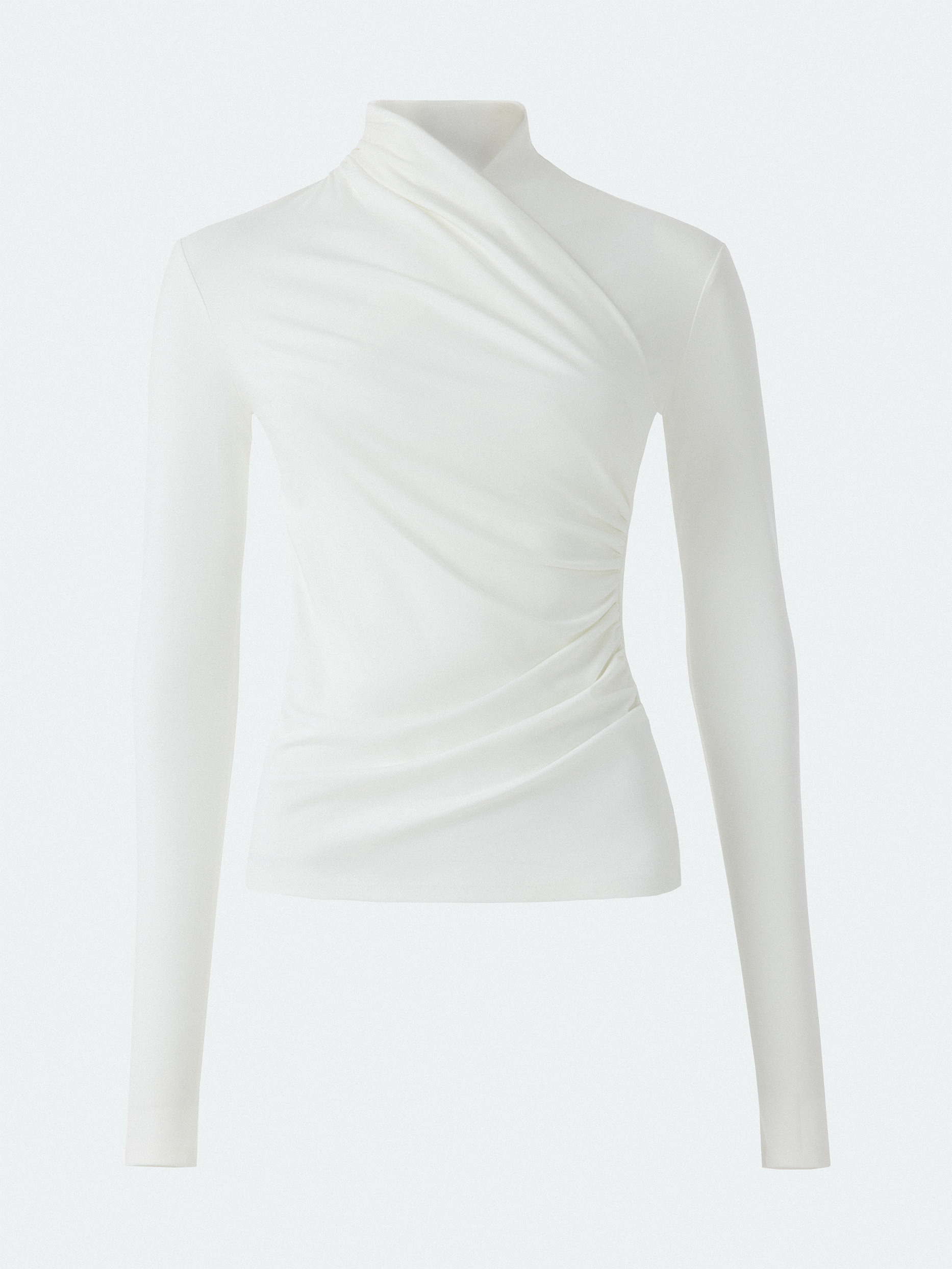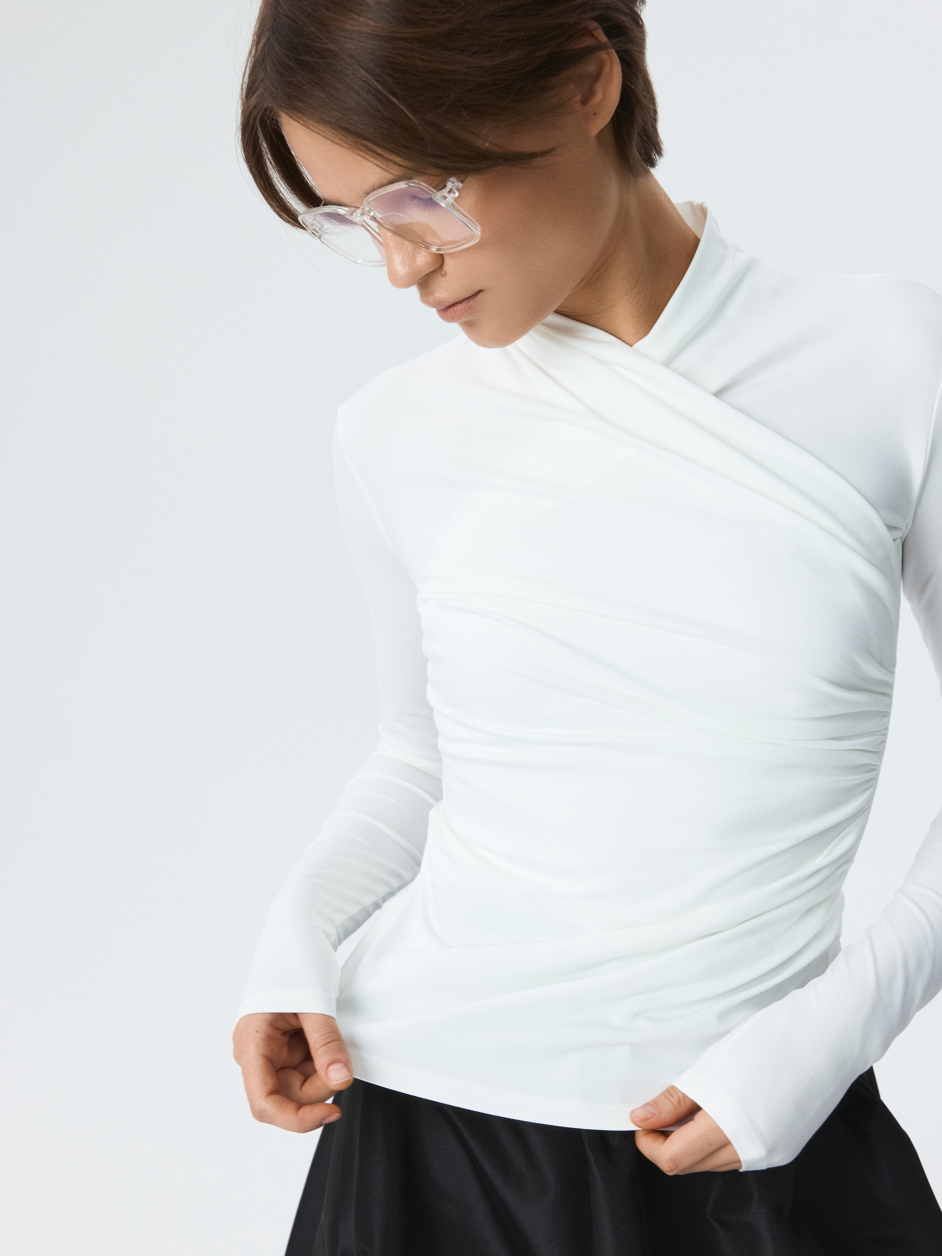 Приталенный лонгслив на запах станет стильной альтернативой базовым моделям. Легкий гладкий трикотаж с эффектом лайкры приятно прилегает к телу и хорошо тянется, не сковывая движения. Центральным акцентом модели выступают изящные драпировки, которые придают фактурности.